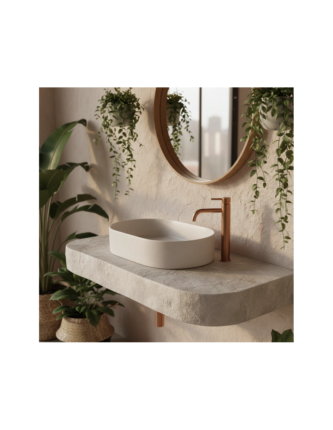 Bordmonteret oval håndvask udført i et moderne design af mat sandfarvet sanitær keramik. Håndvasken måler 61 x 38,5 cm i bredde og dybde. Håndvasken leveres uden bundventil og andet vist tilbehør.