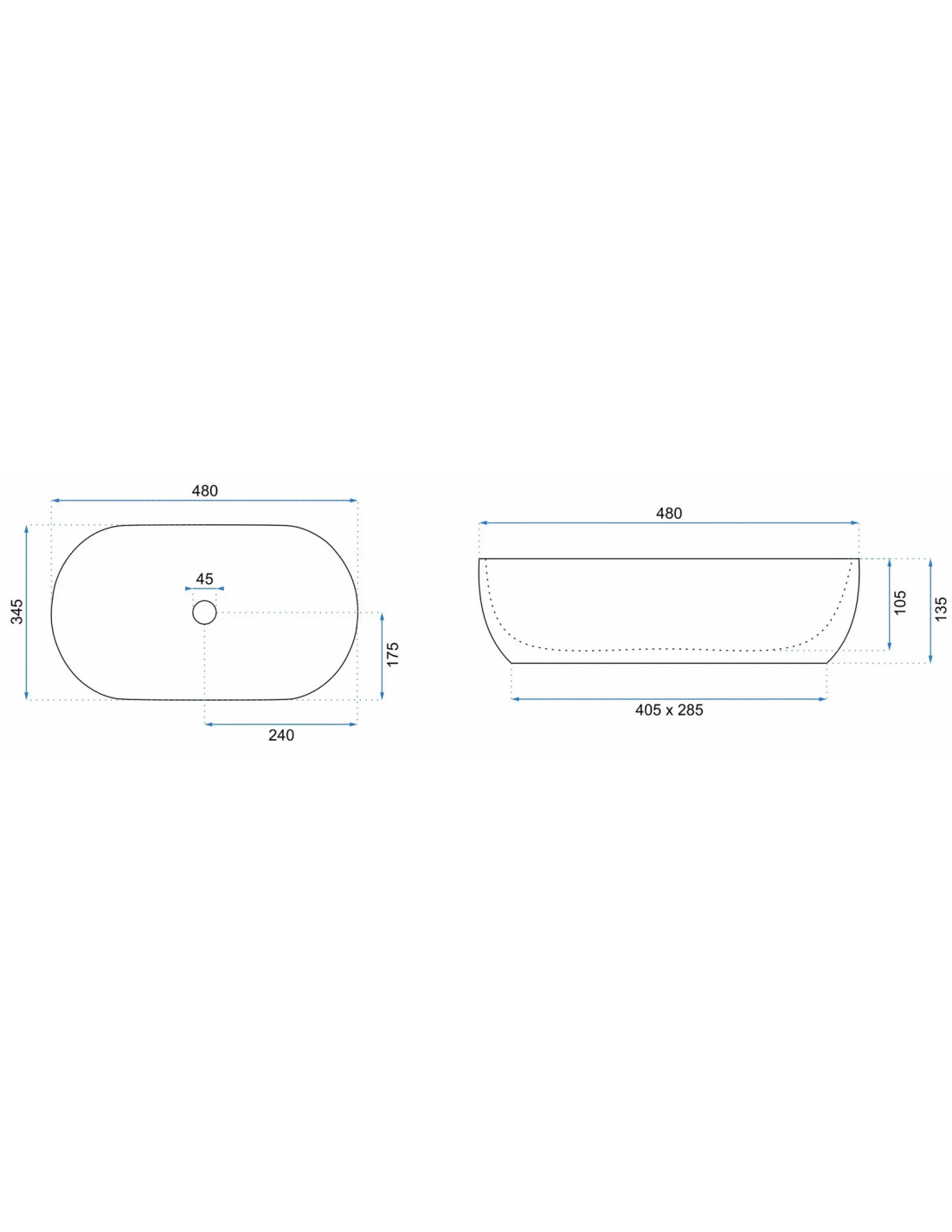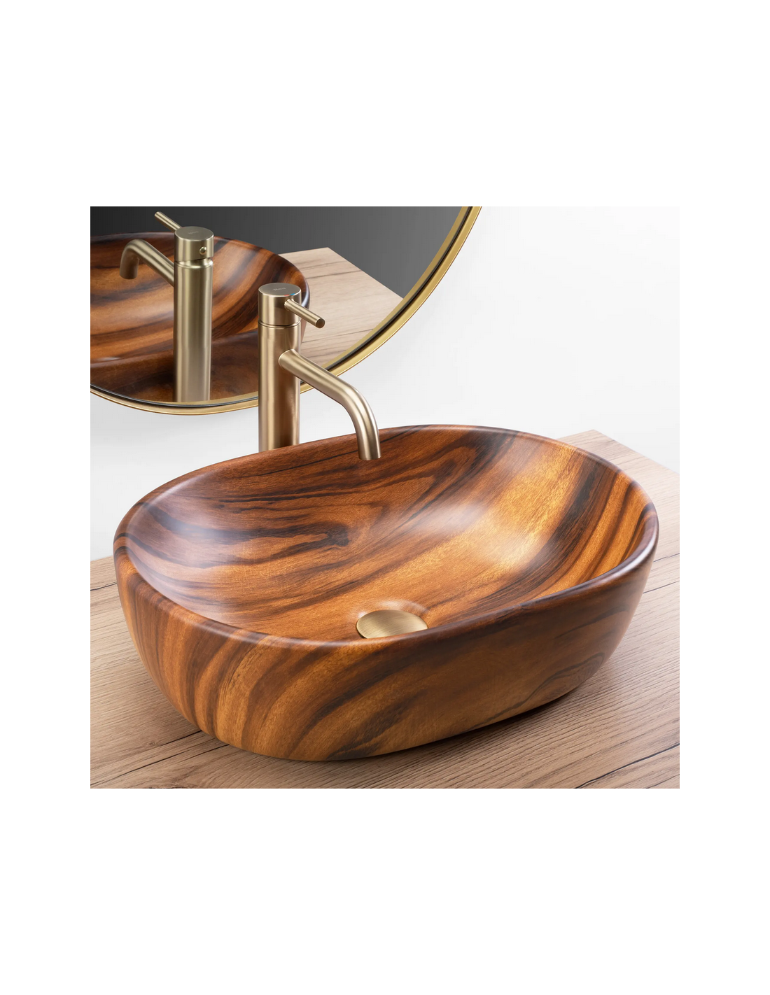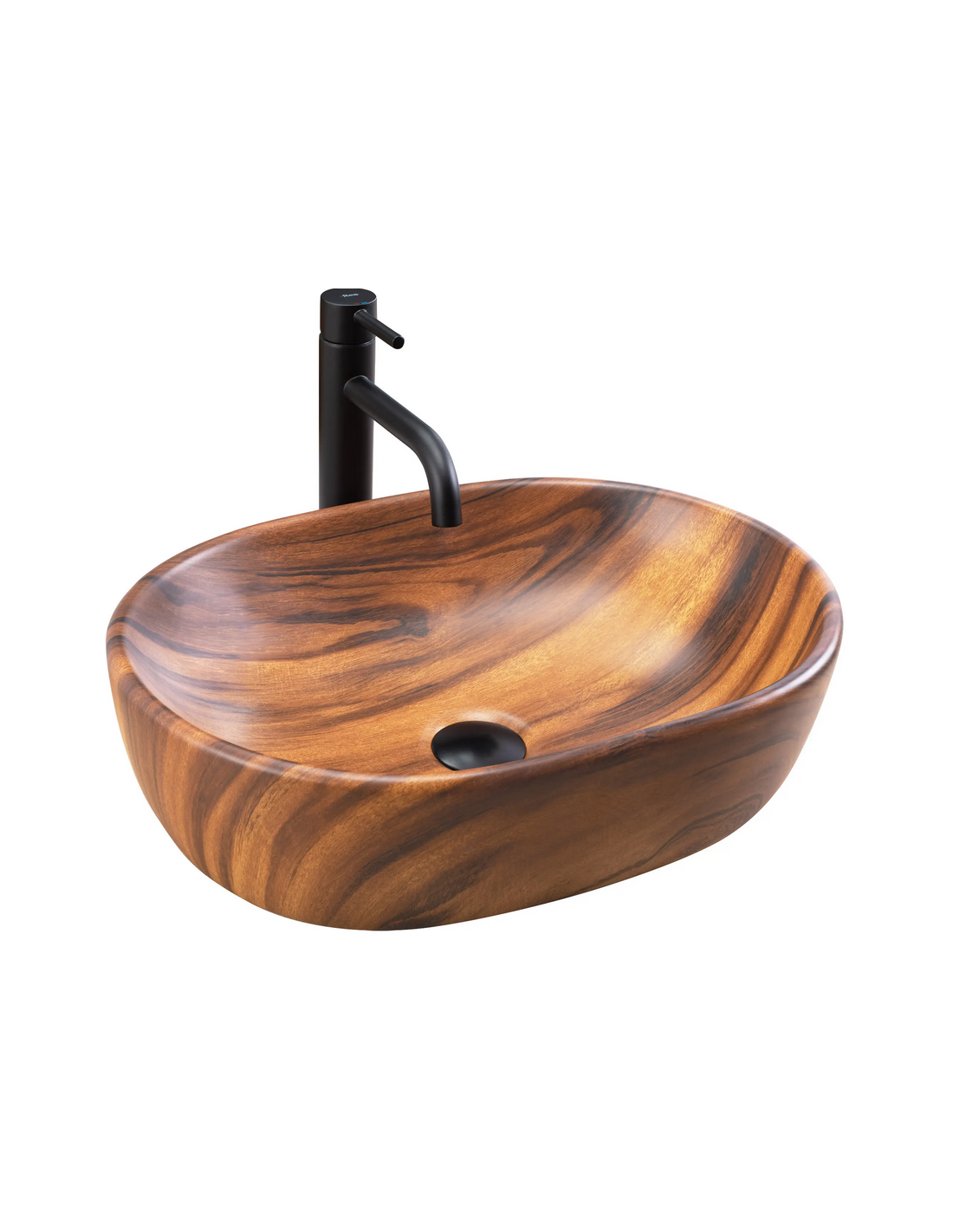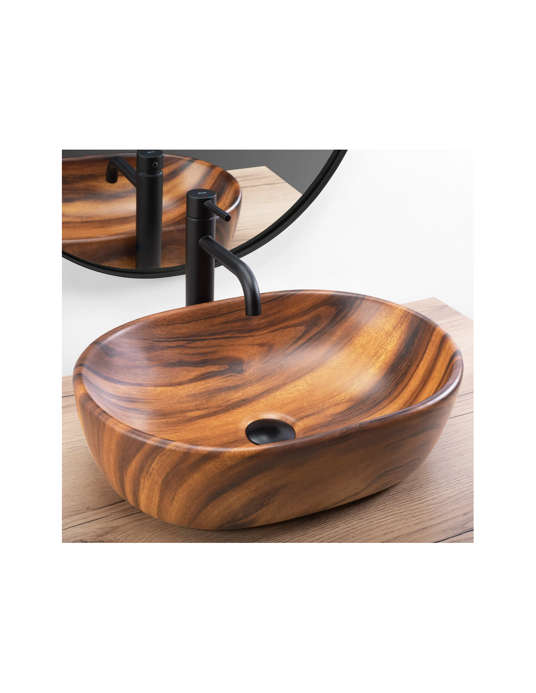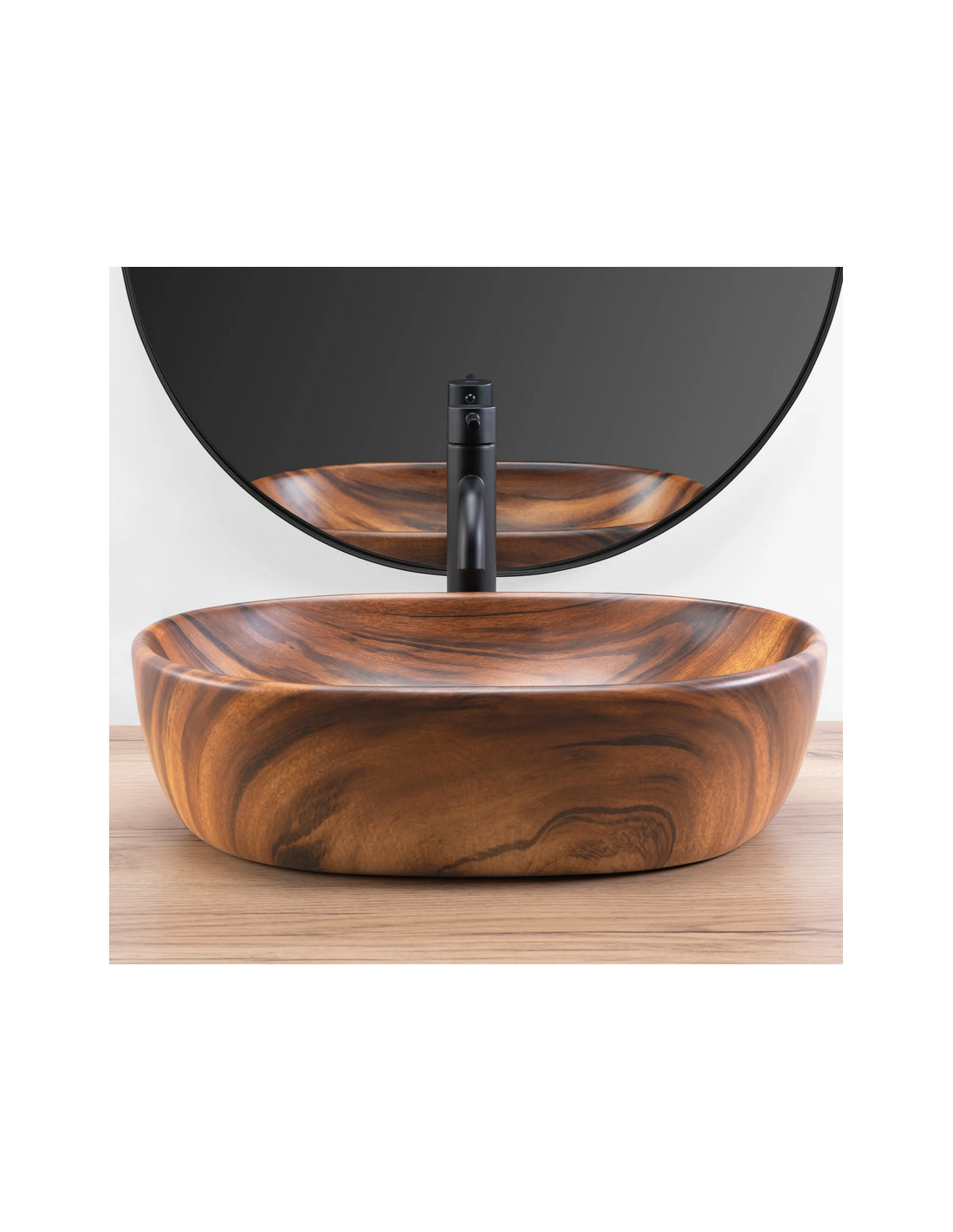 Bordmonteret oval håndvask udført i et moderne design af mat mørk trælook sanitær keramik. Håndvasken måler 48 x 34,5 cm i bredde og dybde. Håndvasken leveres uden bundventil og andet vist tilbehør.