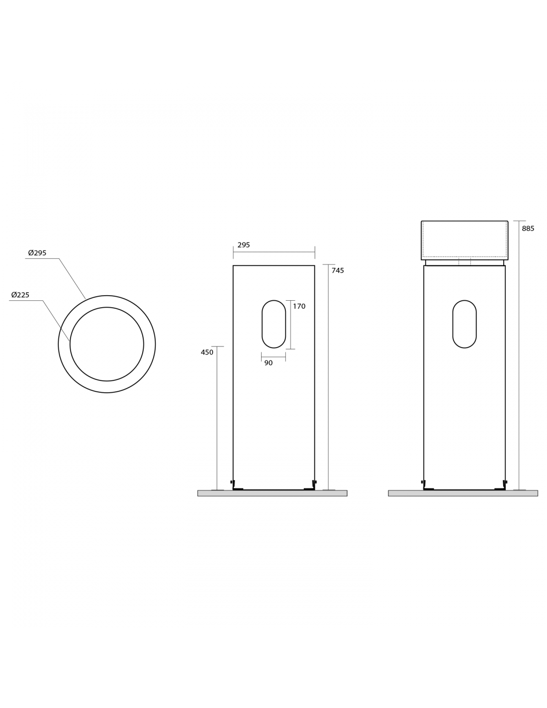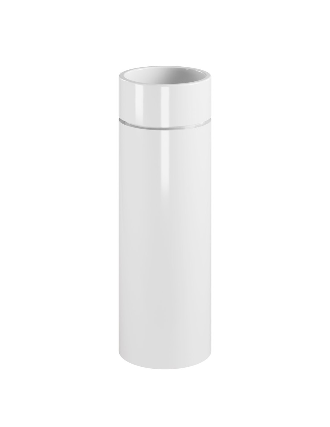 Gulvmonteret rund fritstående håndvask udført i et moderne design af blank hvid keramik. Håndvasken måler 88,5 cm i højden og 29,5 cm i diameter. Håndvasken leveres med pop-up bundventil. Denne model er til montering med afløb/rørføring via bagside på håndvasken (åbning på bagside).