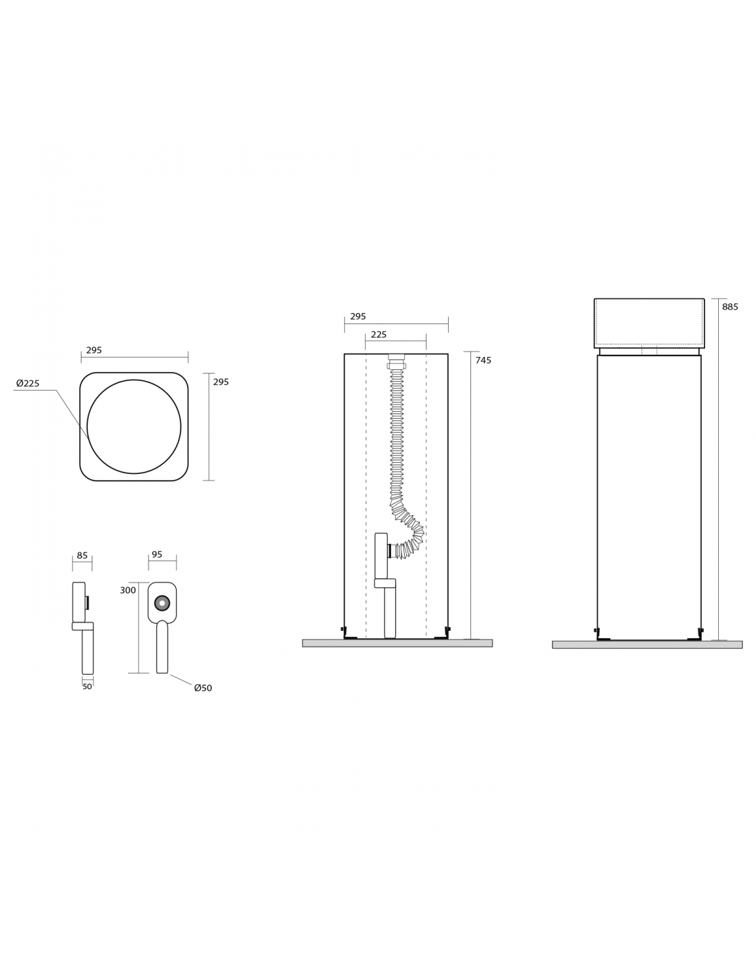 Gulvmonteret fritstående håndvask udført i et moderne design af mat sort keramik. Håndvasken måler 88,5 cm i højden og 29,5 x 29,5 cm i bredde og dybde. Håndvasken leveres med pop-up bundventil. Denne model er til montering med afløb/rørføring i gulvet.