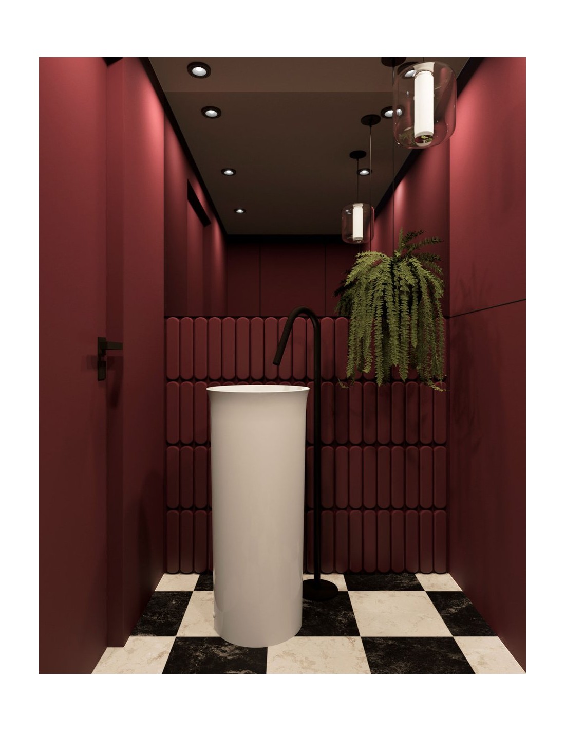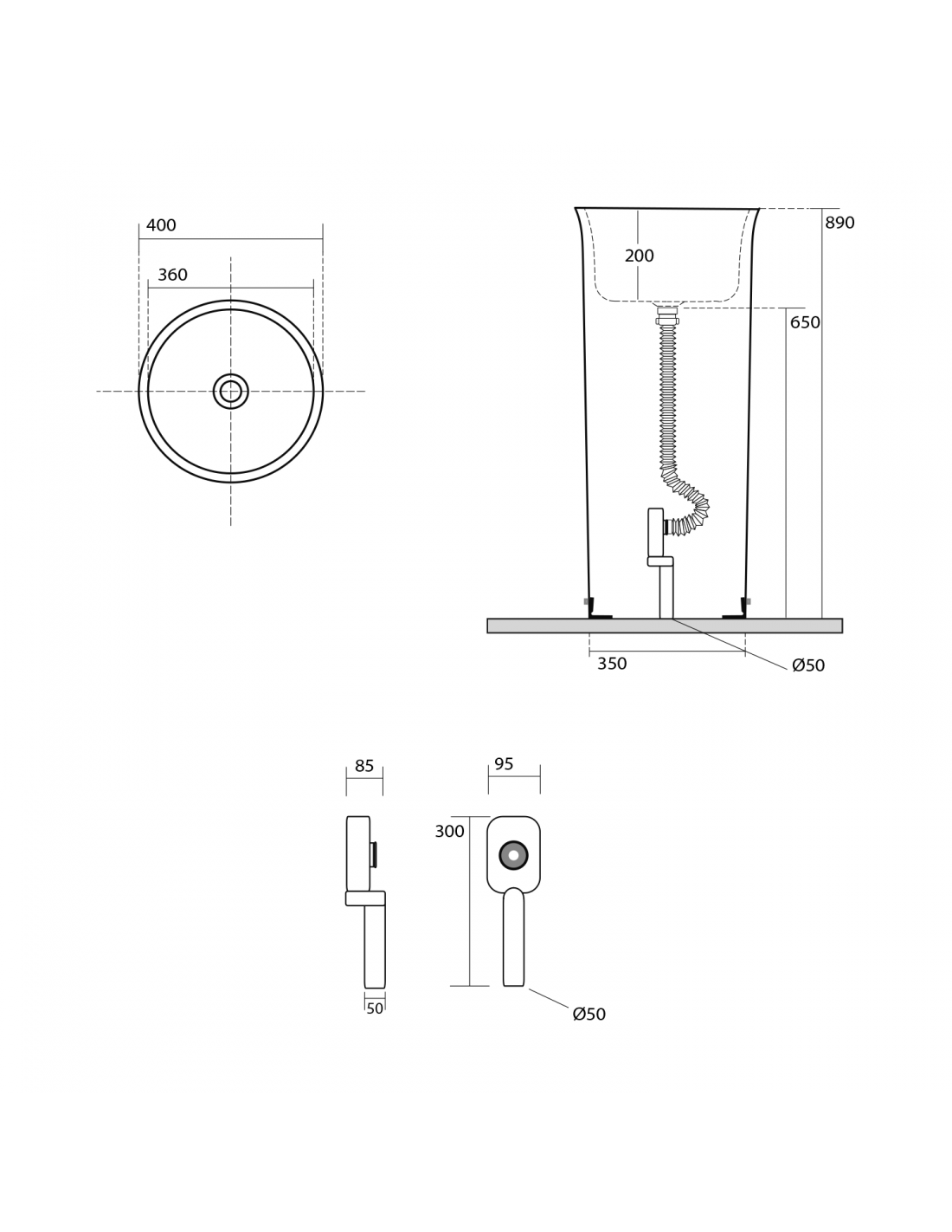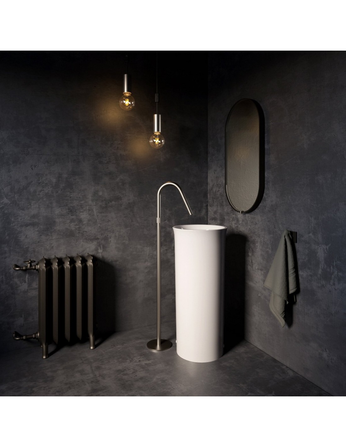 Gulvmonteret rund fritstående håndvask udført i et moderne design af blank hvid keramik. Håndvasken måler 89 cm i højden og 40 cm i diameter. Håndvasken leveres med pop-up bundventil. Denne model er til montering med afløb/rørføring i gulvet.