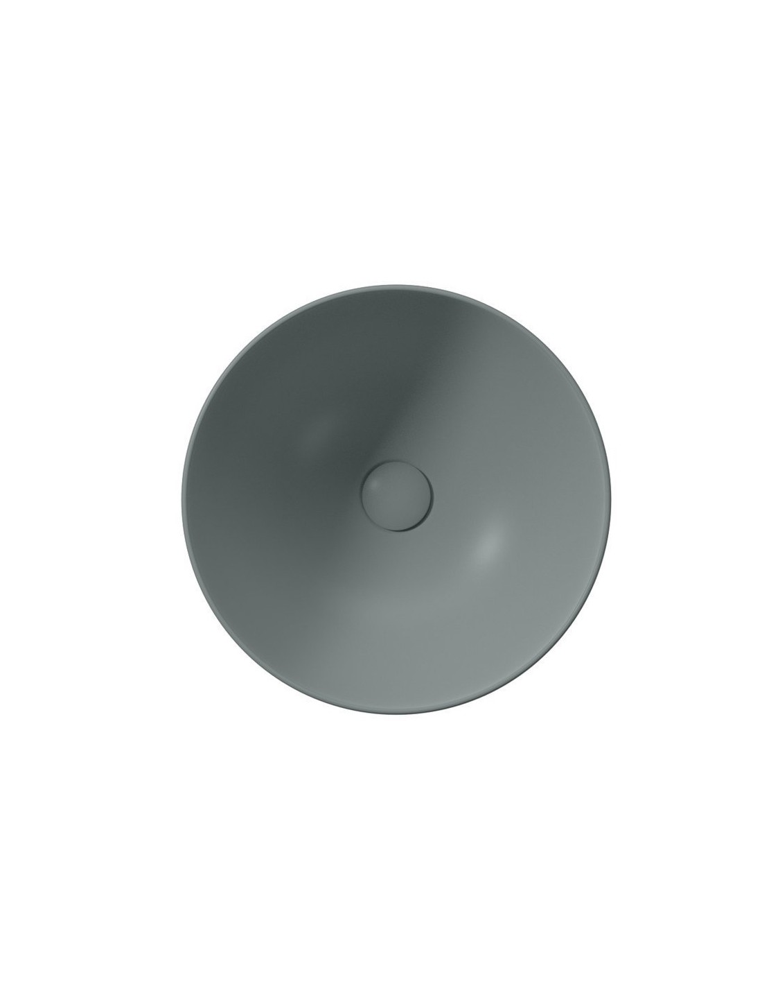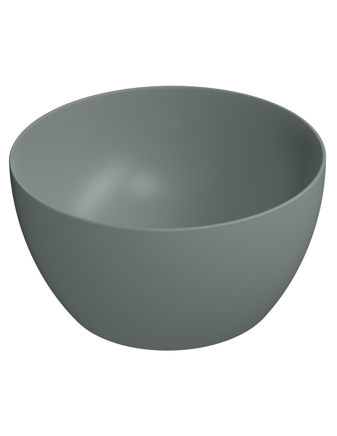 Bordmonteret rund håndvask udført i et moderne design af mat agave farvet sanitær keramik. Håndvasken måler 42 cm i diameter. Håndvasken leveres med pop-up bundventil.