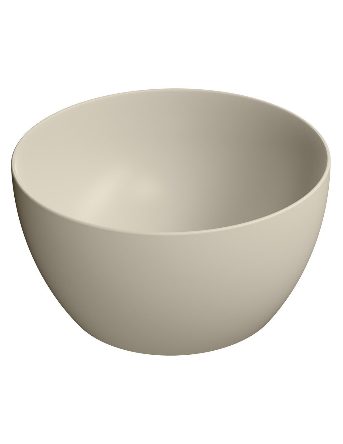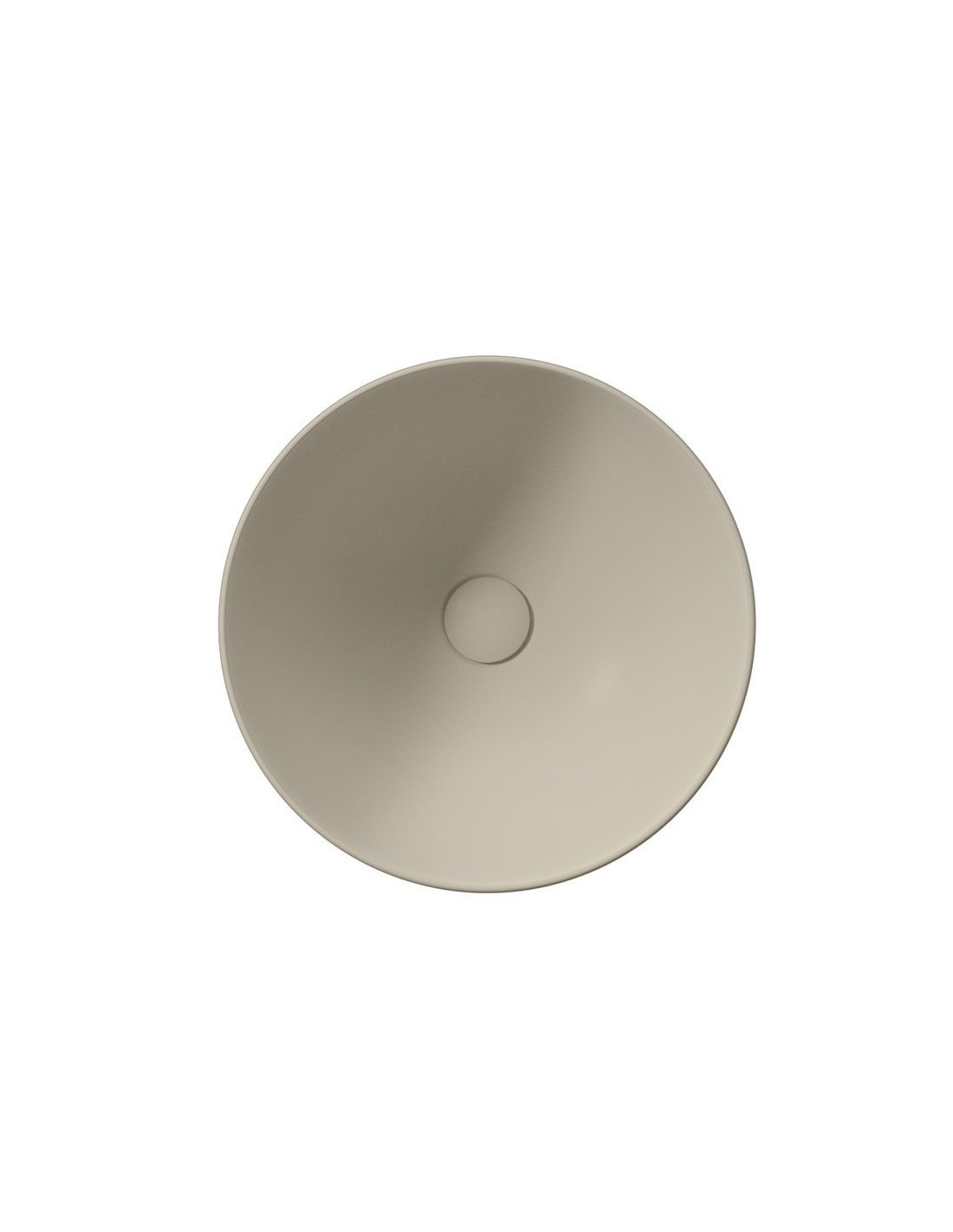Bordmonteret rund håndvask udført i et moderne design af mat sandfarvet sanitær keramik. Håndvasken måler 42 cm i diameter. Håndvasken leveres med pop-up bundventil.