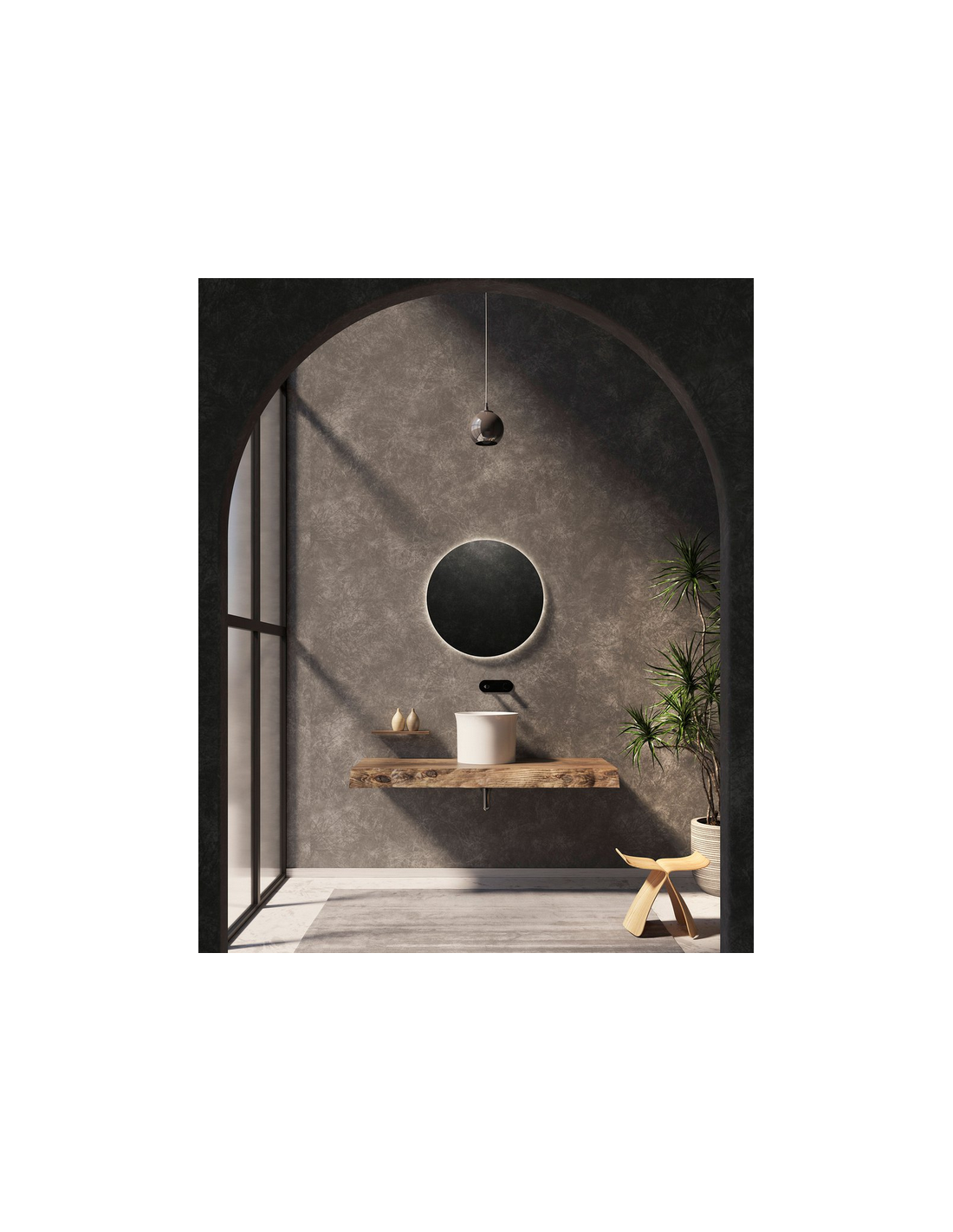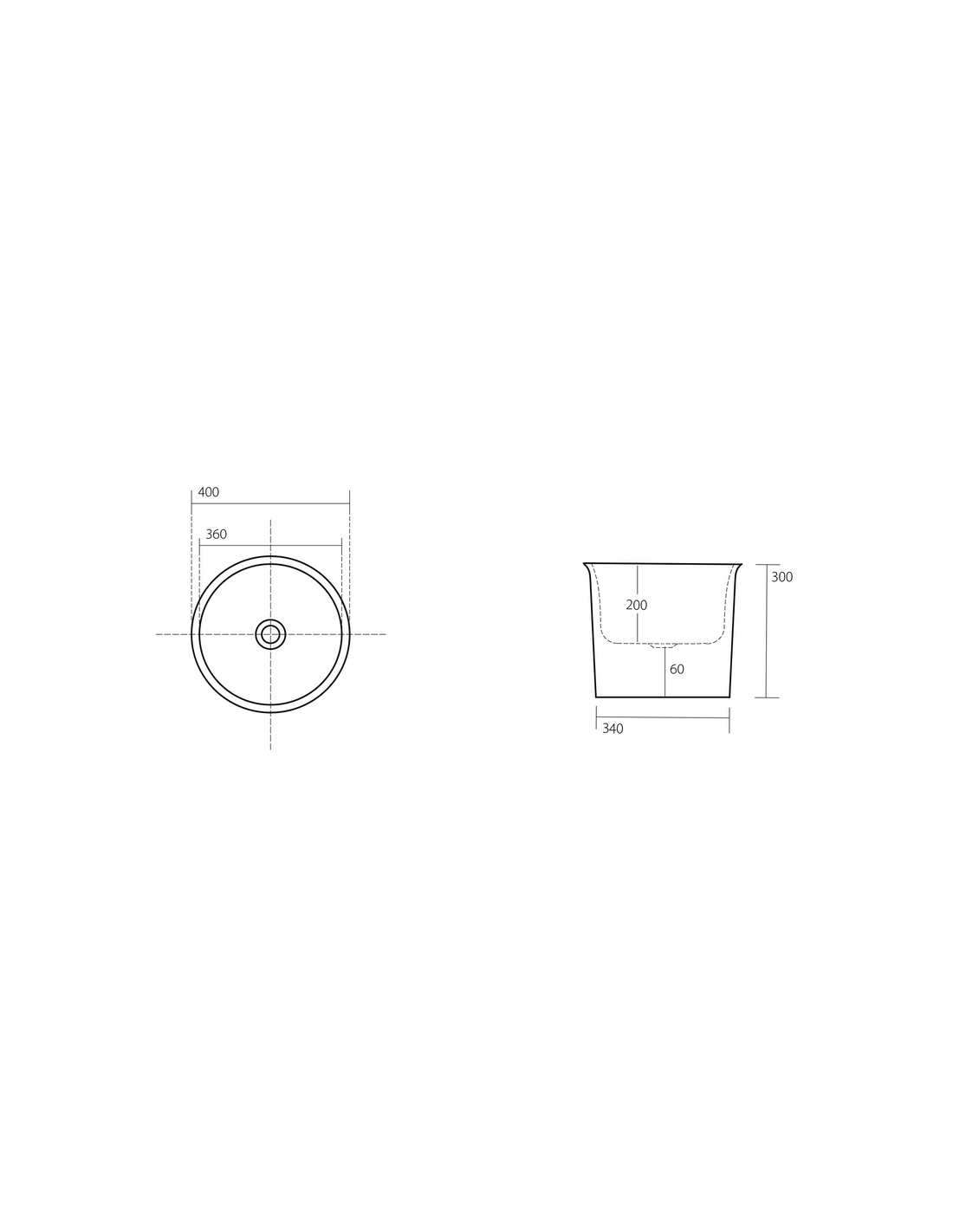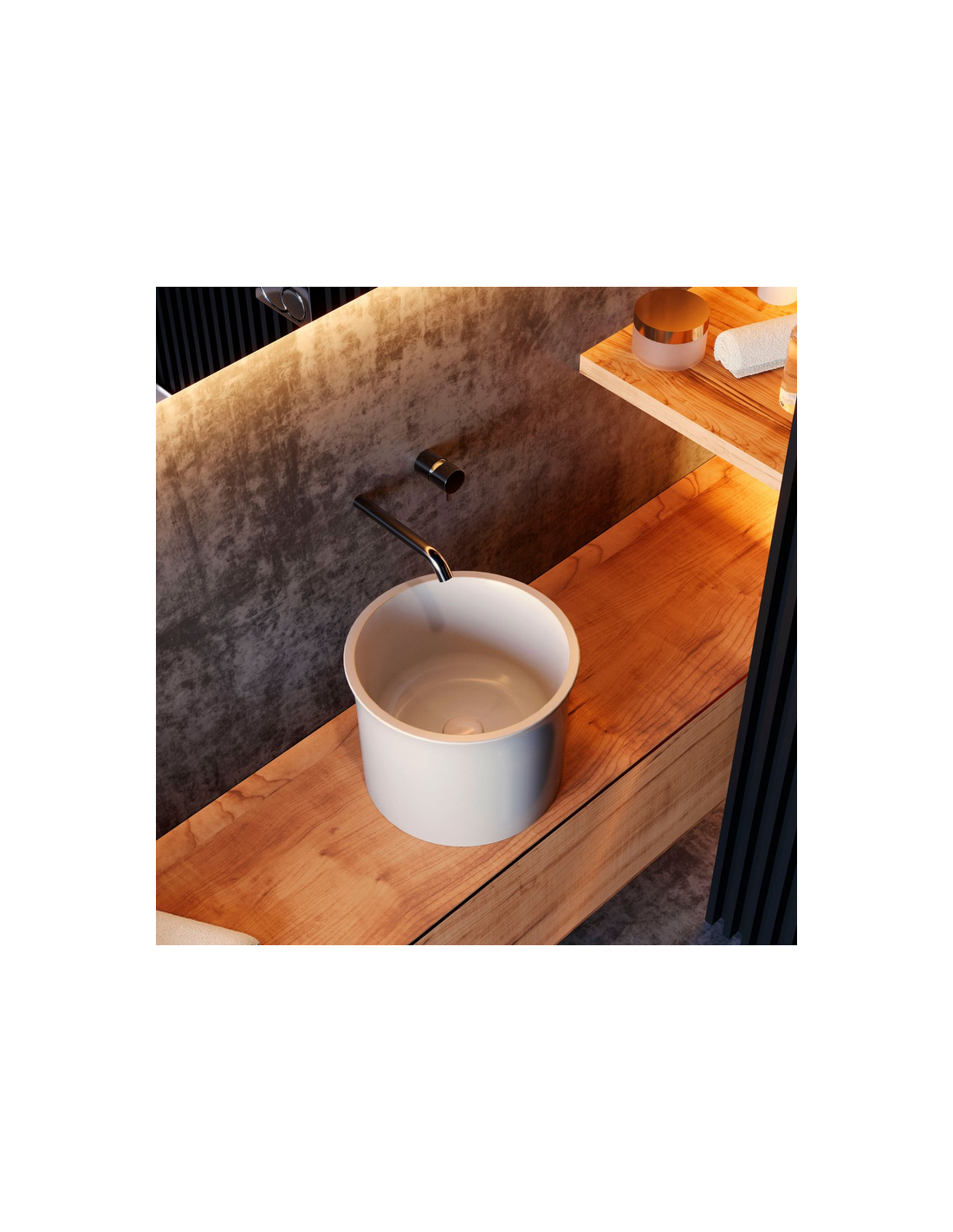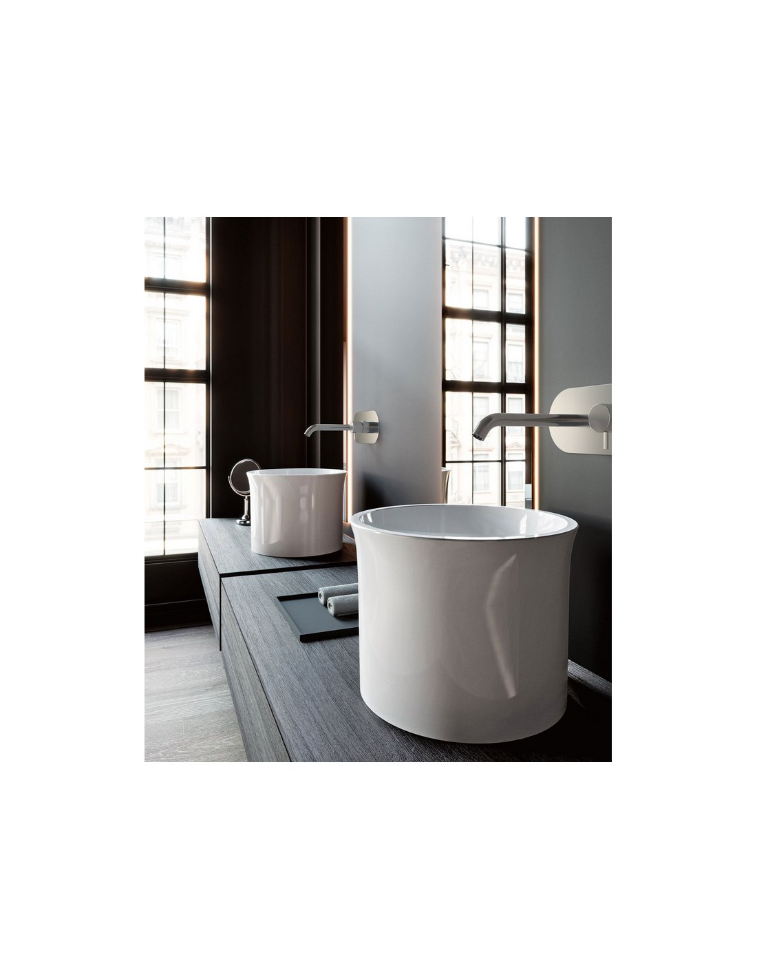 Bordmonteret rund håndvask udført i et moderne design af blank hvid sanitær keramik. Håndvasken måler 40 cm i diameter. Håndvasken leveres uden pop-up bundventil.