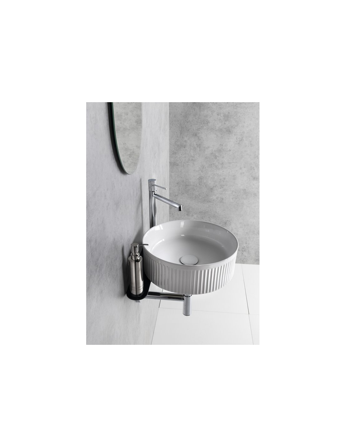 Bordmonteret rund håndvask udført i et moderne design af hvid sanitær keramik. Håndvasken måler 37 cm i diameter. Håndvasken leveres med pop-up bundventil.