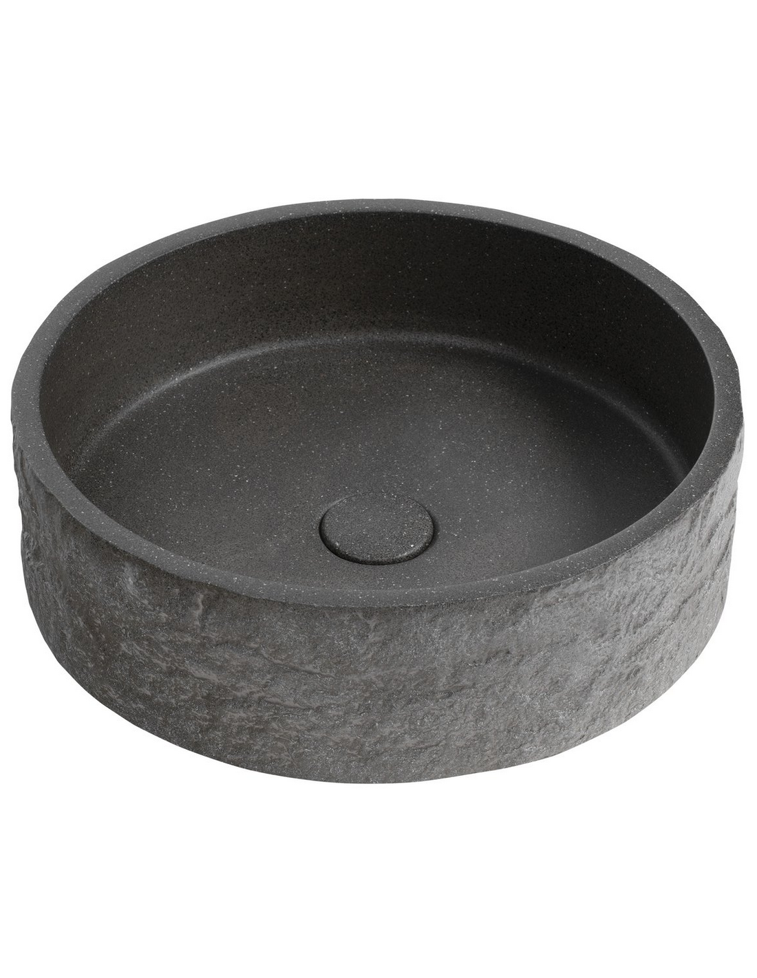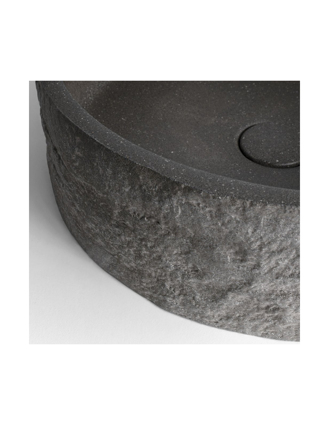 Bordmonteret rund håndvask udført i et moderne design, fremstillet i beton med et gråsort granitlook. Håndvasken måler 40 cm i diameter. Håndvasken leveres med pop-up bundventil.