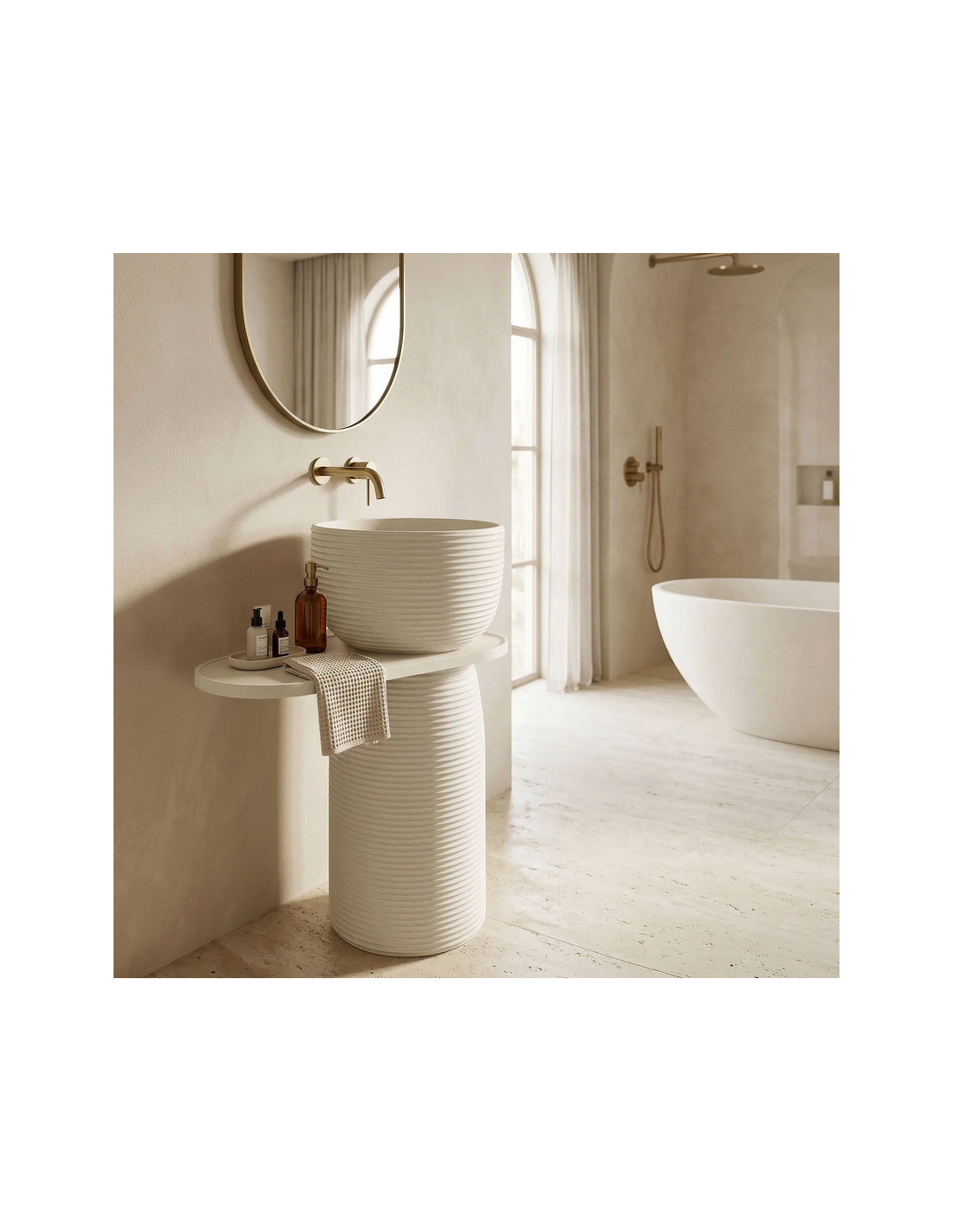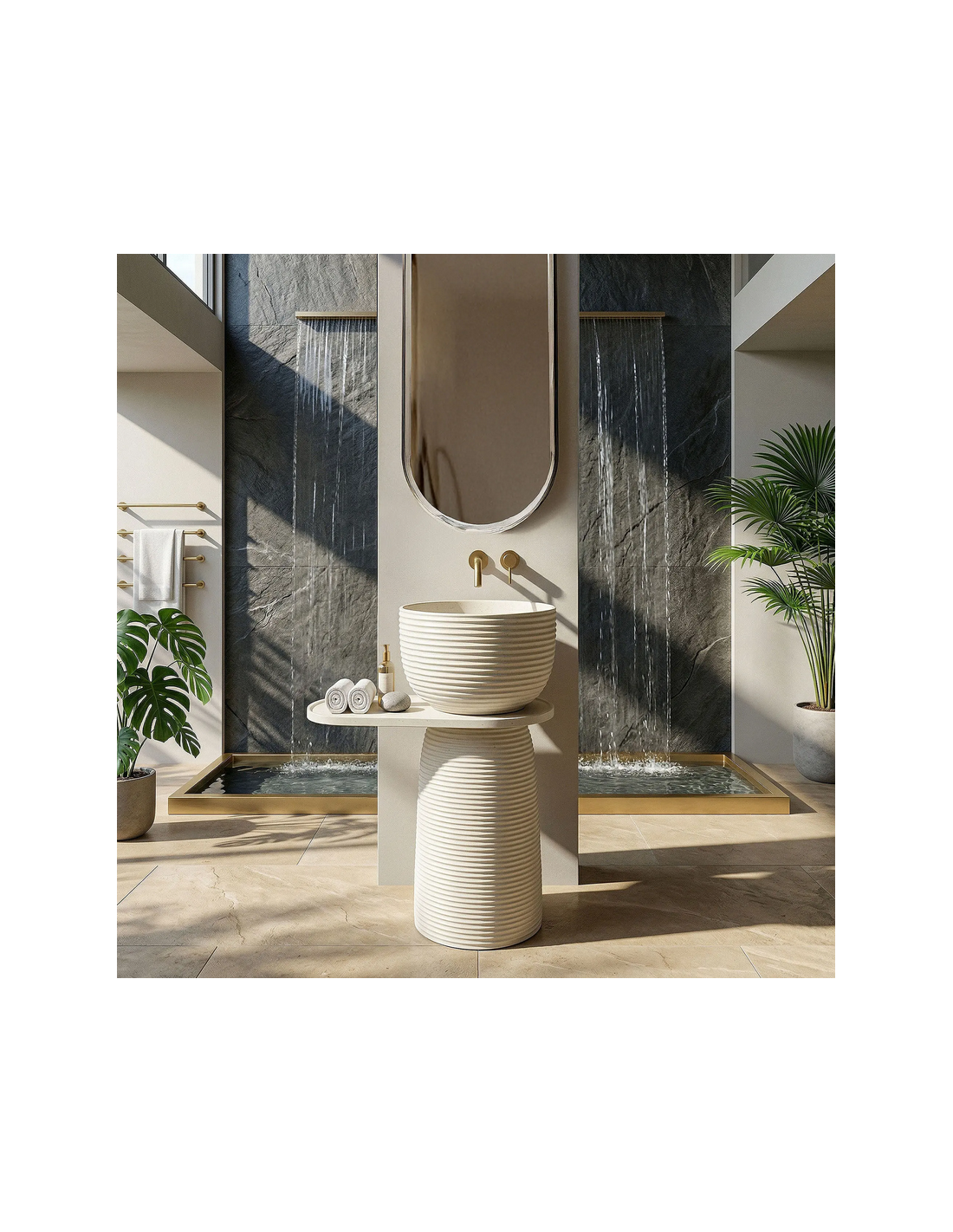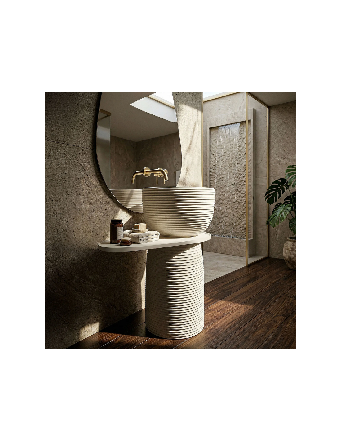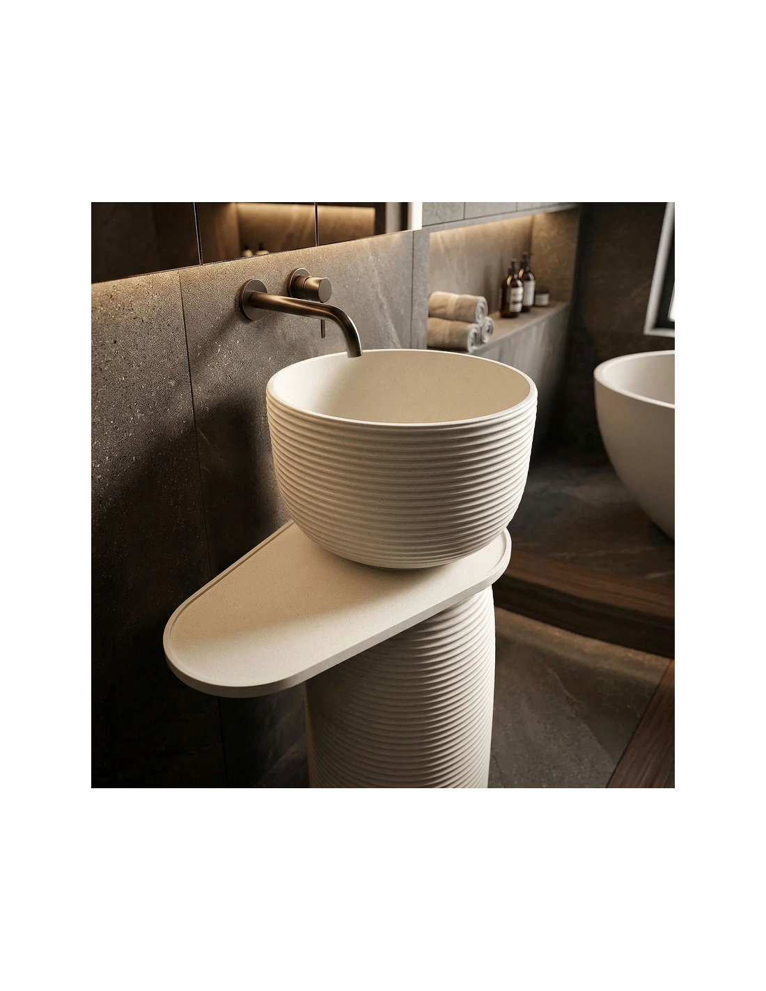 Gulvmonteret rund håndvask udført i et rustikt design af mat naturfarvet kompositsten. Håndvasken måler 86 cm i højden og 39,5 cm i diameter. Hylden under håndvasken måler 65,5 cm i bredden. Håndvasken leveres uden bundventil og andet vist tilbehør. På bagsiden af vasken forefindes åbninger til rørudføring.