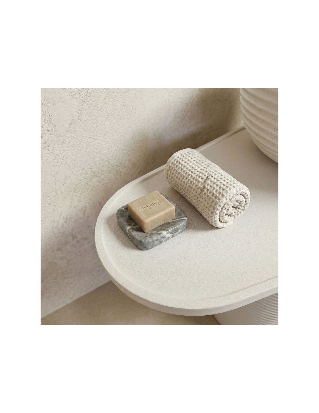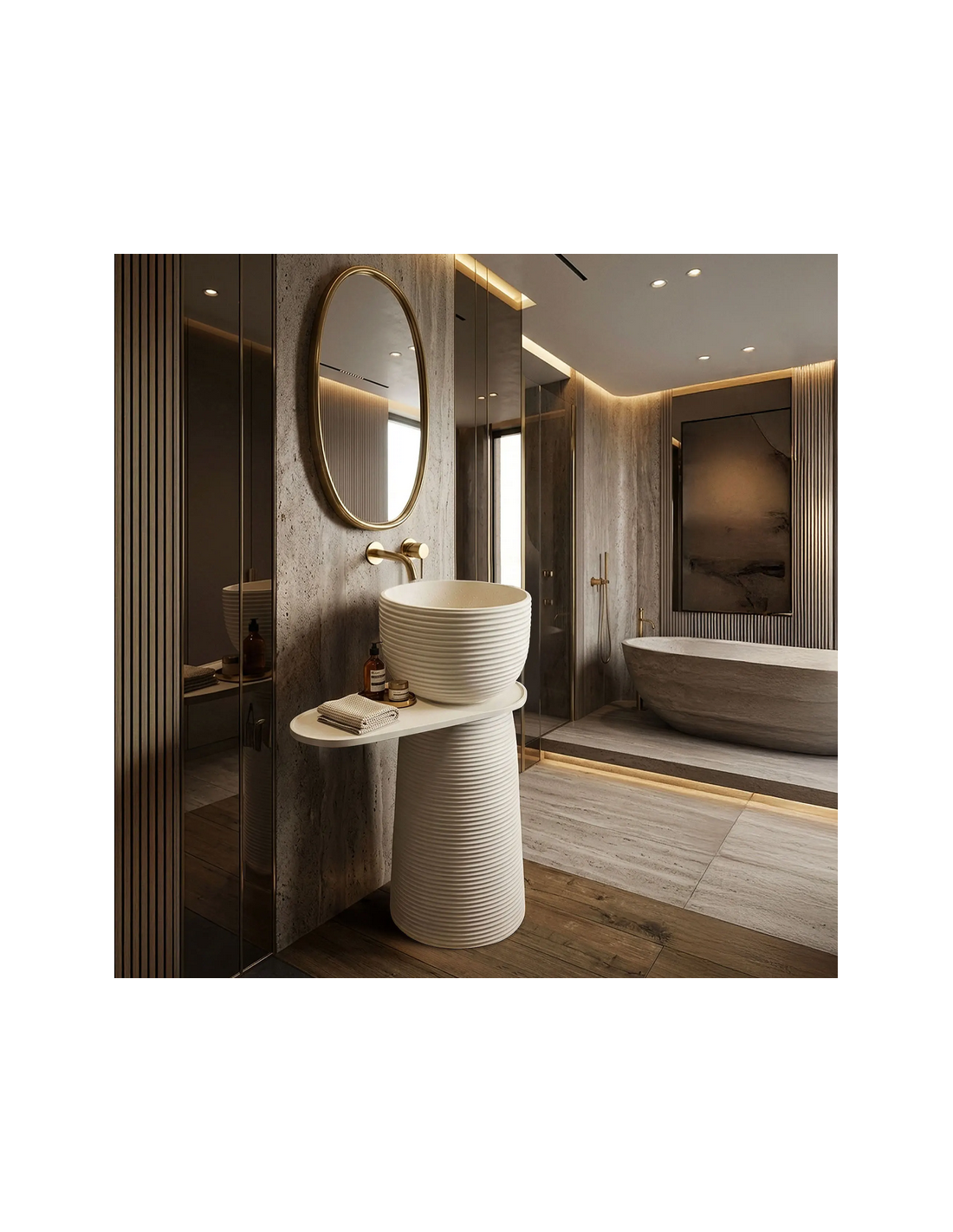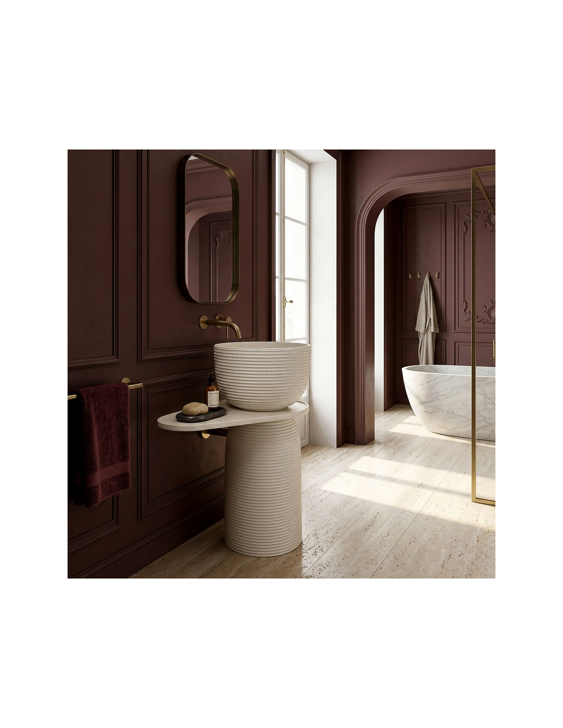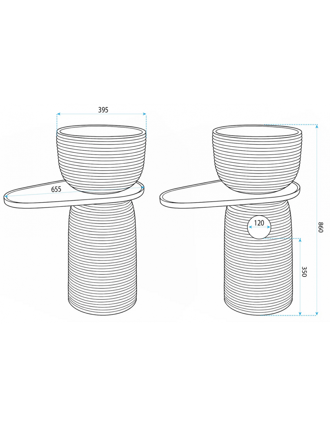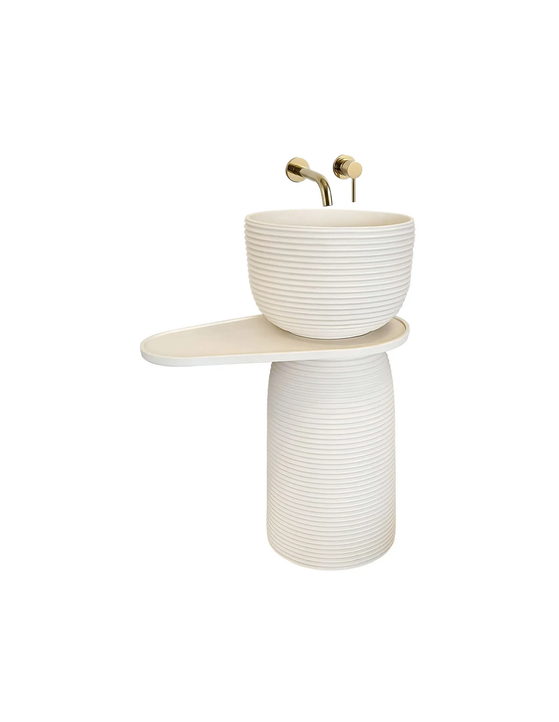 Gulvmonteret rund håndvask udført i et rustikt design af mat naturfarvet kompositsten. Håndvasken måler 86 cm i højden og 39,5 cm i diameter. Hylden under håndvasken måler 65,5 cm i bredden. Håndvasken leveres uden bundventil og andet vist tilbehør. På bagsiden af vasken forefindes åbninger til rørudføring.