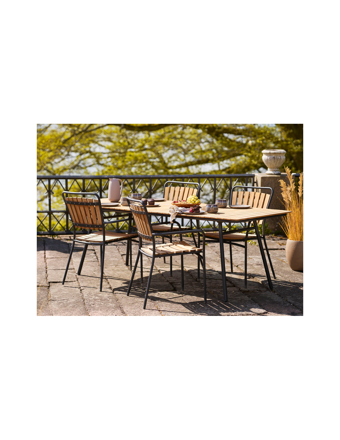Bemærk venligst, at teaktræ er et naturligt materiale, som har tendens til at blive gråligt med årerne. Behandl havebordet med teaktræsolie for at hindre denne proces. Teaktræ er naturligt resistent overfor fugt.