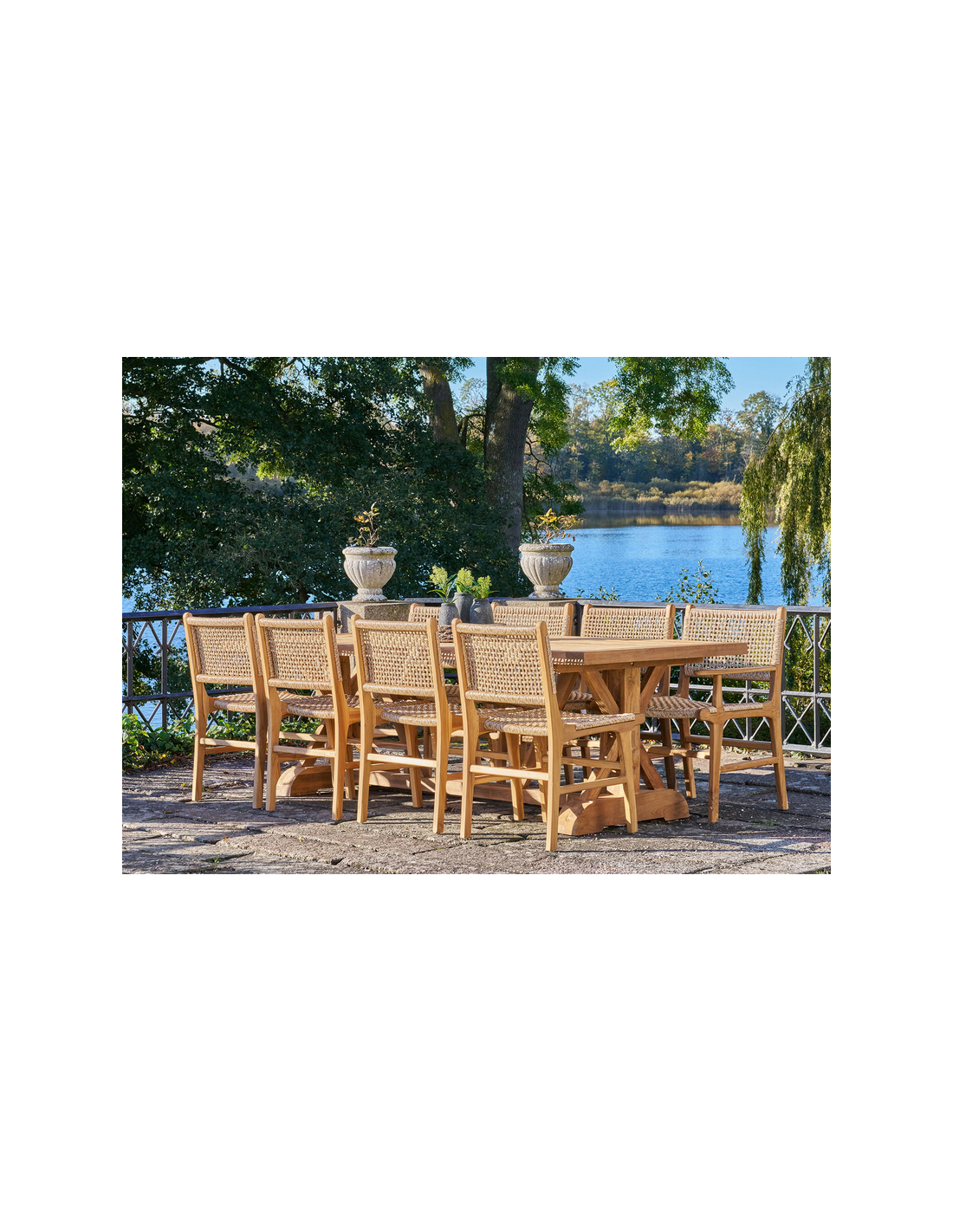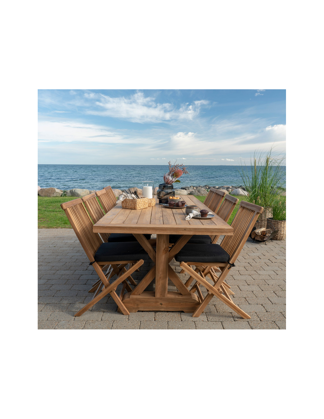 Bemærk venligst, at teaktræ er et naturligt materiale, som har tendens til at blive gråligt med årerne. Behandl havebordet med teaktræsolie for at hindre denne proces. Teaktræ er naturligt resistent overfor fugt.