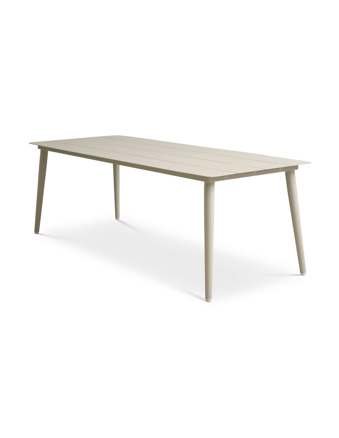 CORFU Havebord udført i et stilrent design af sandfarvet aluminium. Havebordet måler 75 cm i højden og 220 x 90 cm i bredde og dybde. Et rummeligt havebord med god plads til gæster - kombinér eventuelt med havestole i samme farve.