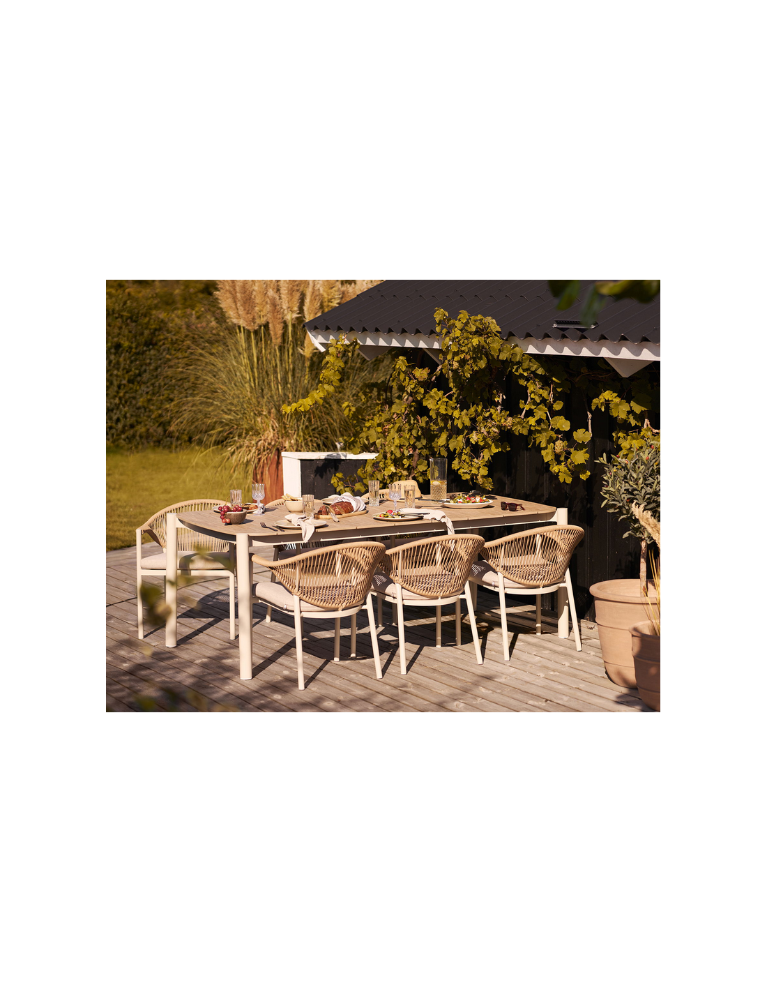 Havebord udført i et design af sandfarvet aluminium og naturbrun nonwood (PE). Havebordet måler 74 cm i højden og 200 x 100 cm i bredde og dybde. Et rummeligt havebord med god plads til gæster.