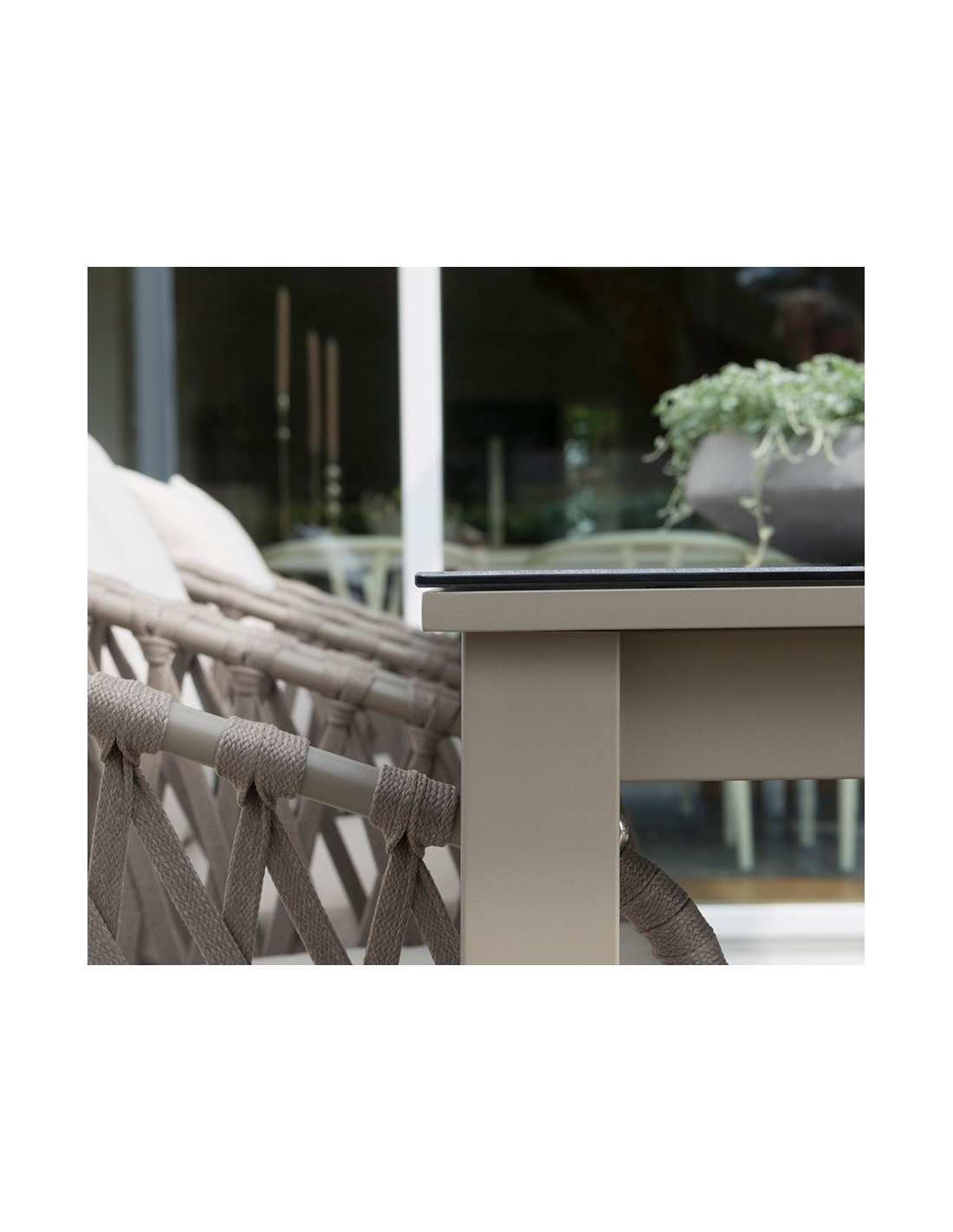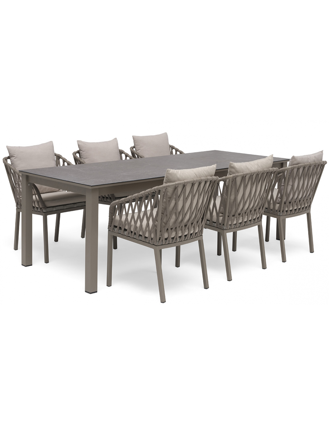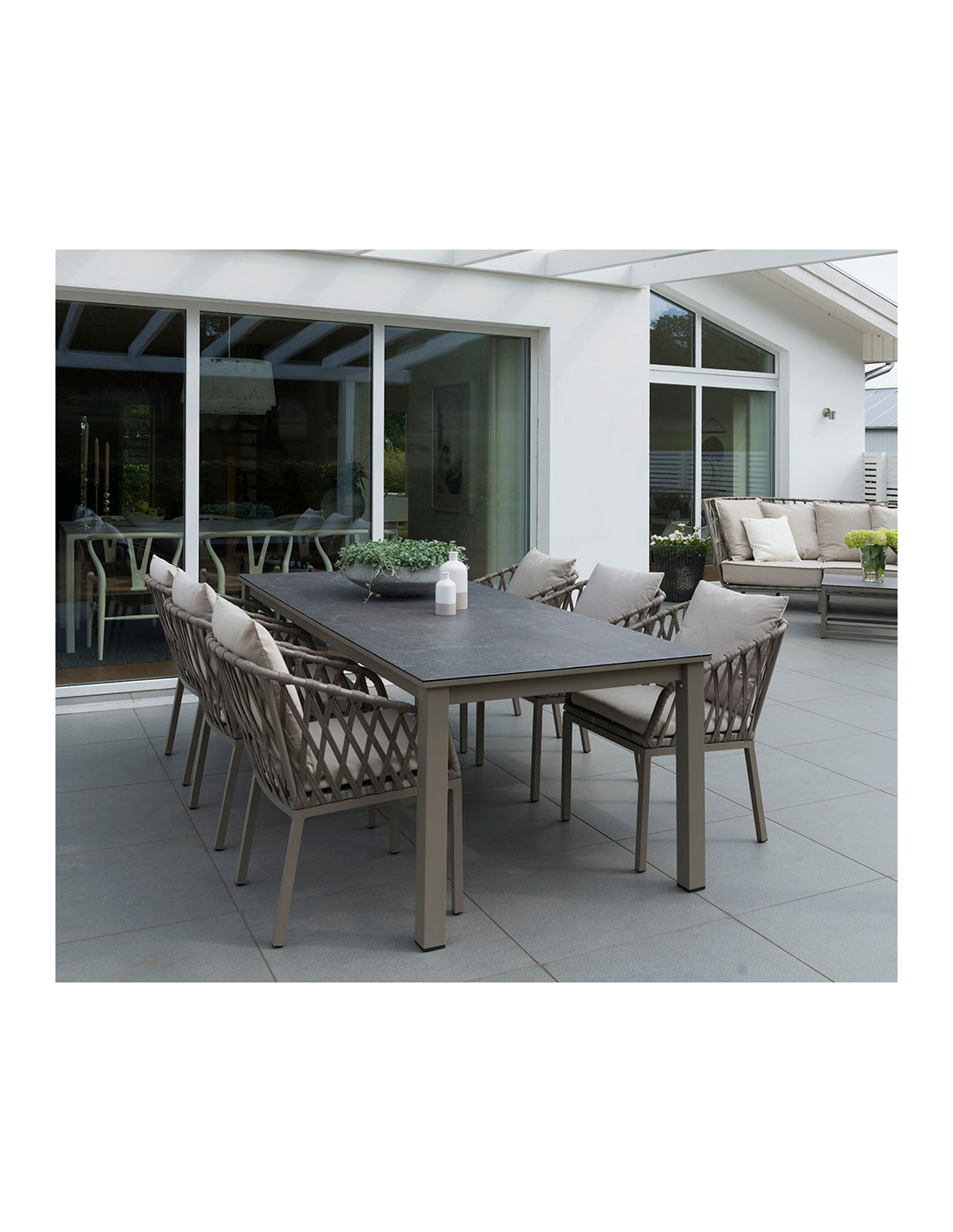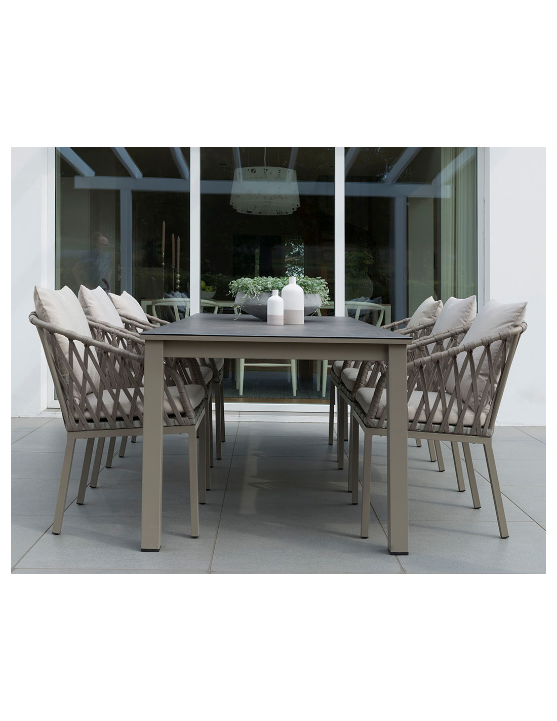 Moderne havebord fra Svenske Hillerstorp, udført i et stilrent design af gråbeige lakeret aluminium og grå keramisk glas. Bordet måler 72 cm i højden og 220 x 90 cm i bredde og dybde.