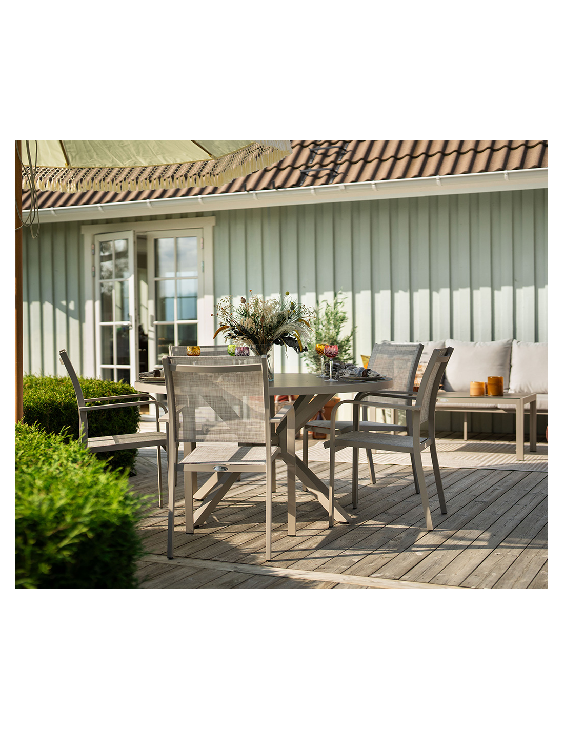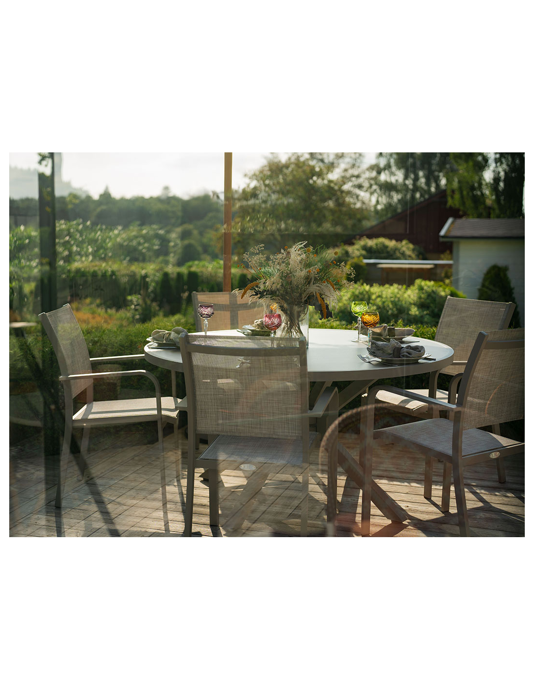 Moderne rundt havebord fra Svenske Hillerstorp, udført i et stilrent design af gråbeige lakeret aluminium og grå keramisk glas. Bordet måler 73 cm i højden og 140 cm i diameter.