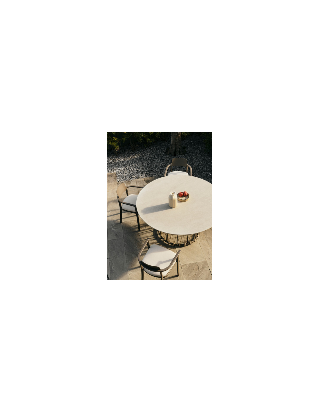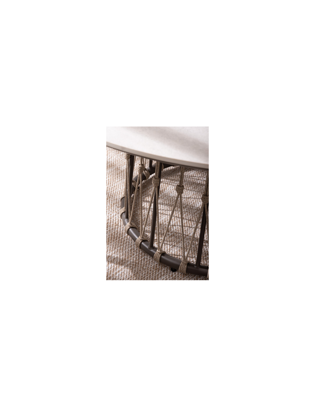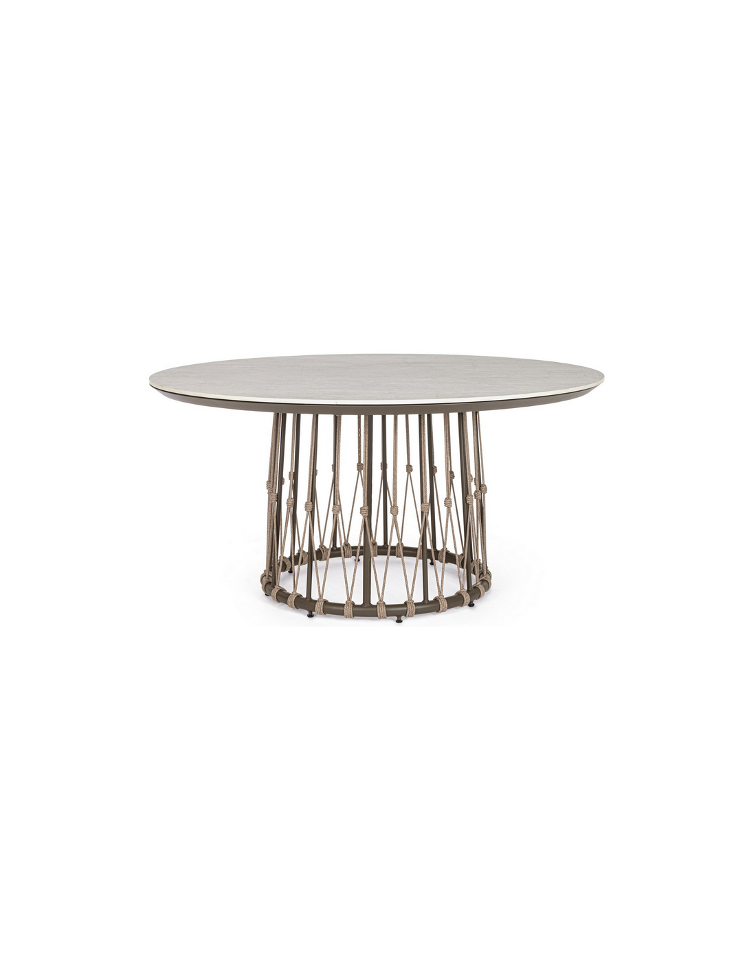 LANA Rundt havebord udført i et design af mørkebrun aluminium og polyesterreb med bordplade i grå keramisk sten. Bordet måler 75 cm i højden og 150 cm i diameter.