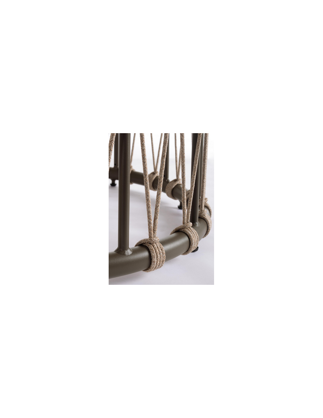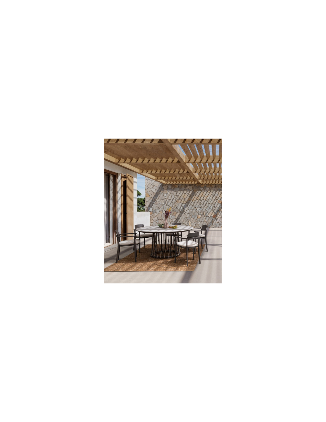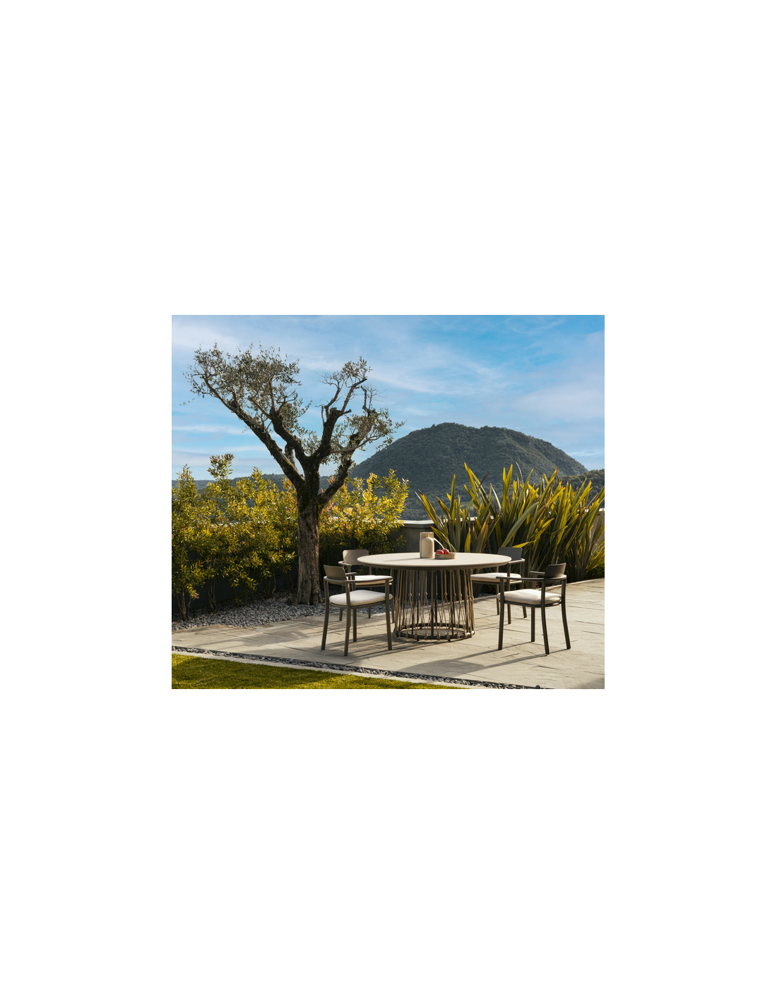 LANA Rundt havebord udført i et design af mørkebrun aluminium og polyesterreb med bordplade i grå keramisk sten. Bordet måler 75 cm i højden og 150 cm i diameter.
