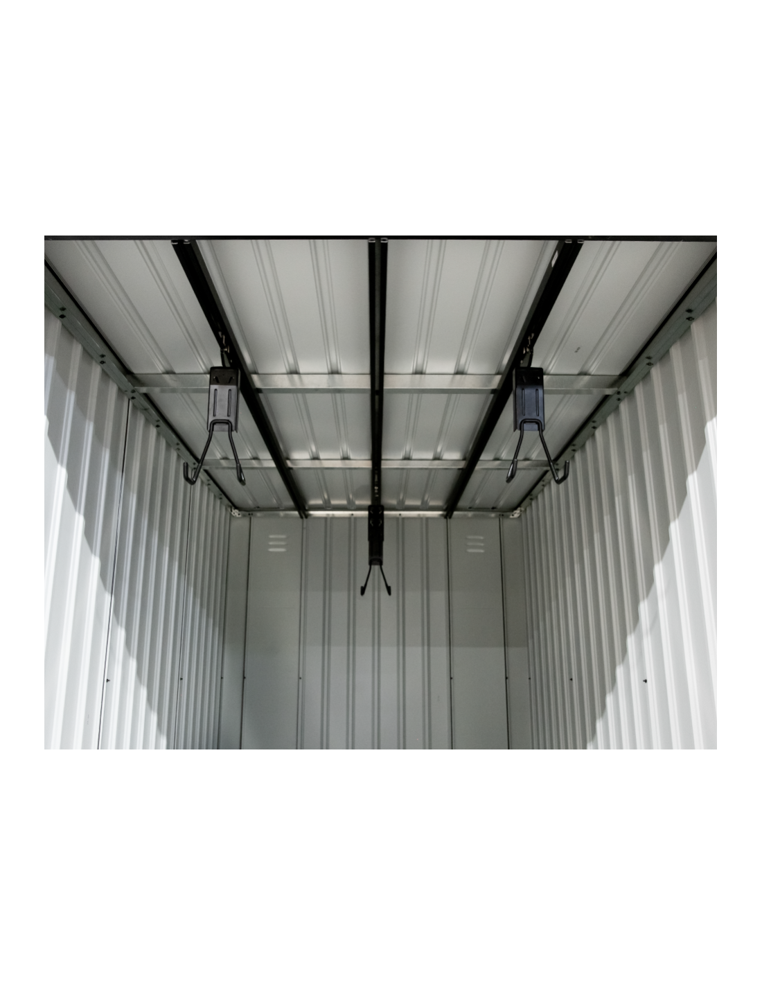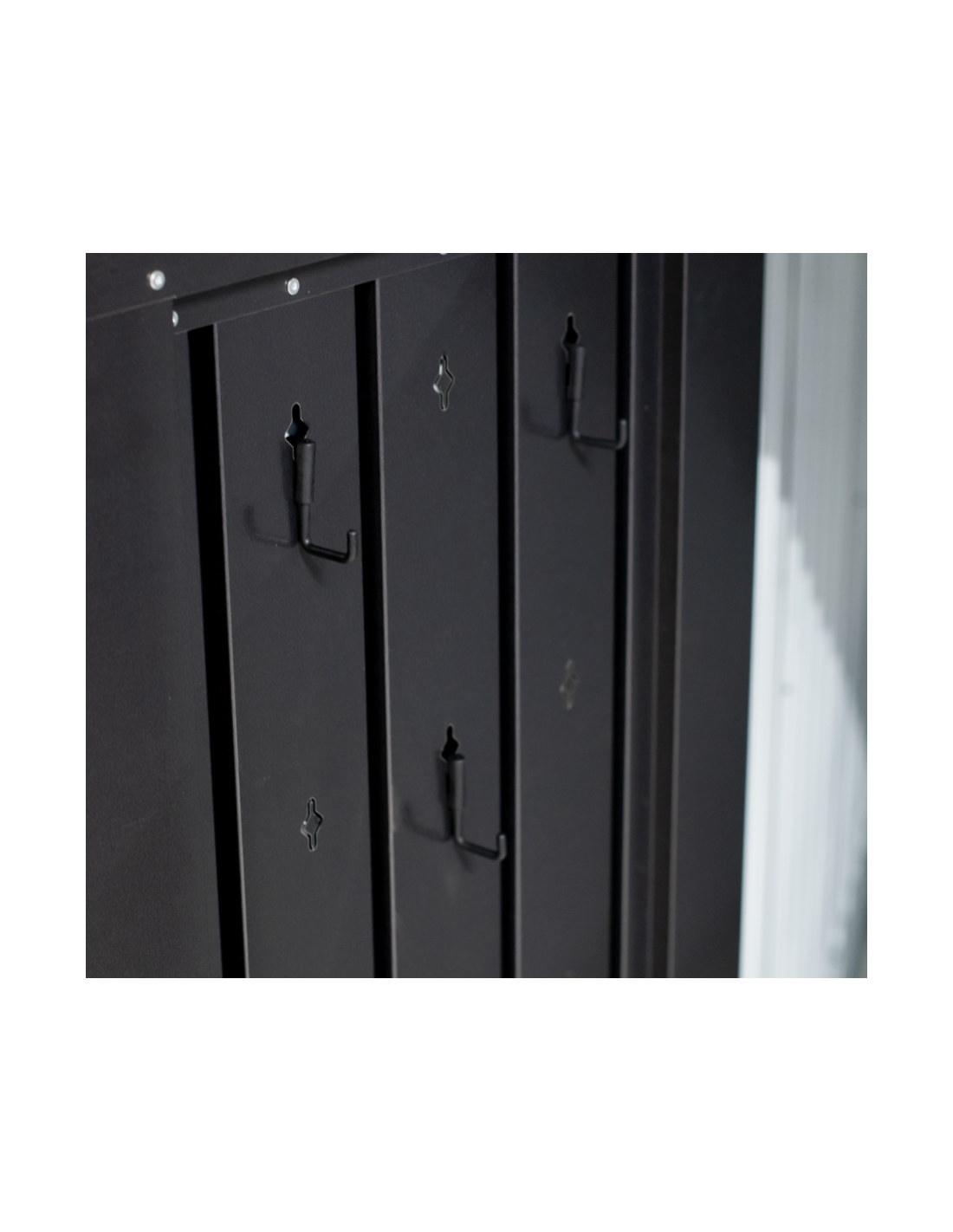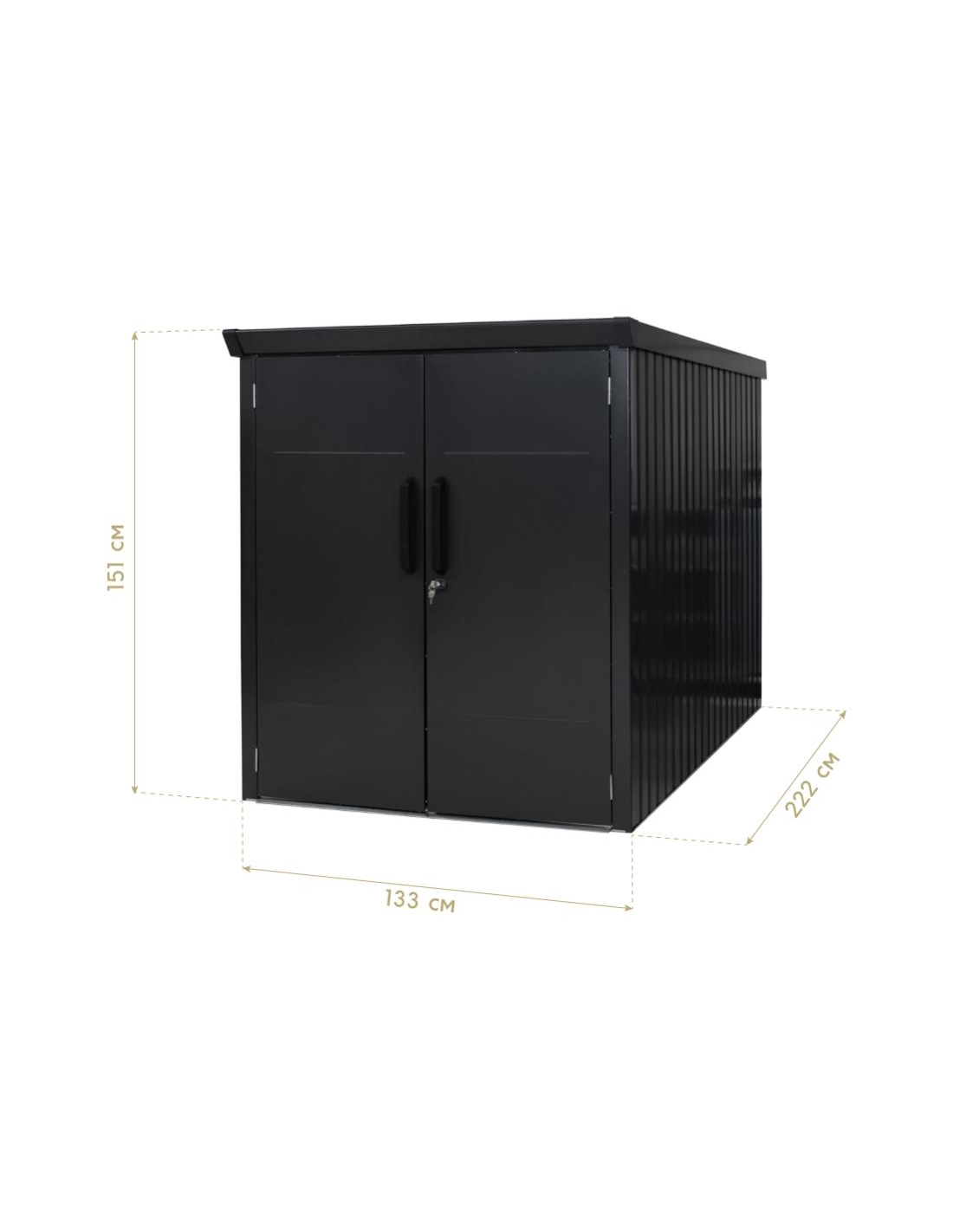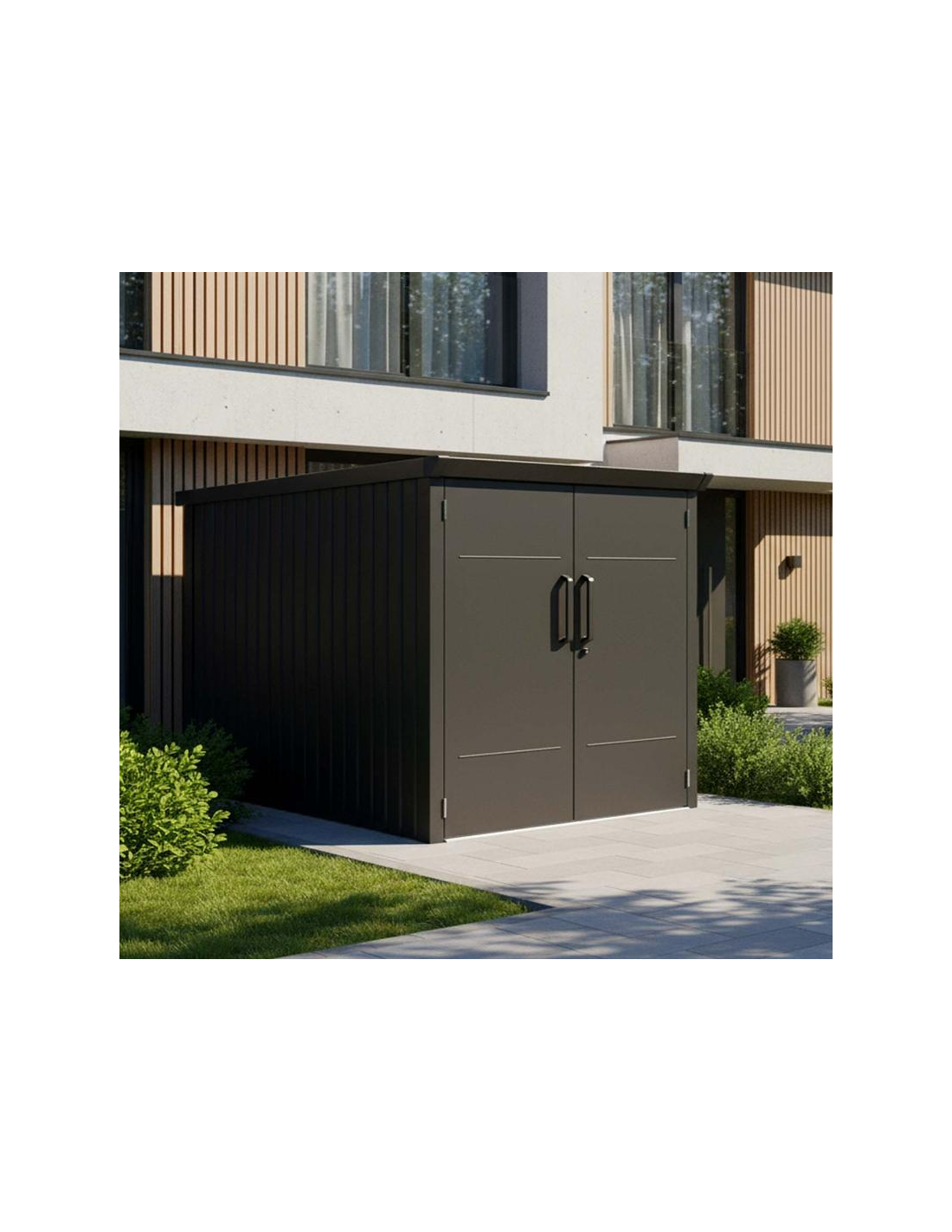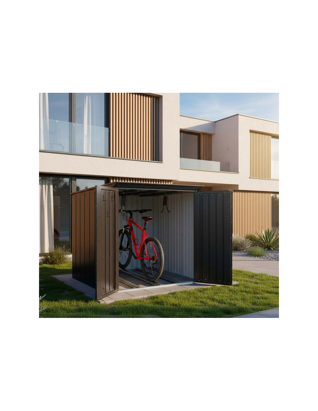 Westmann Cykelskur udført i et stilrent design af antracit lakeret stål. Cykelskuret måler 151 cm i højden og 133 x 222 cm i bredde og dybde. Skuret er med bund af skinner til 3 cykler og loftskinner, kodelås og regnvandsafleder.