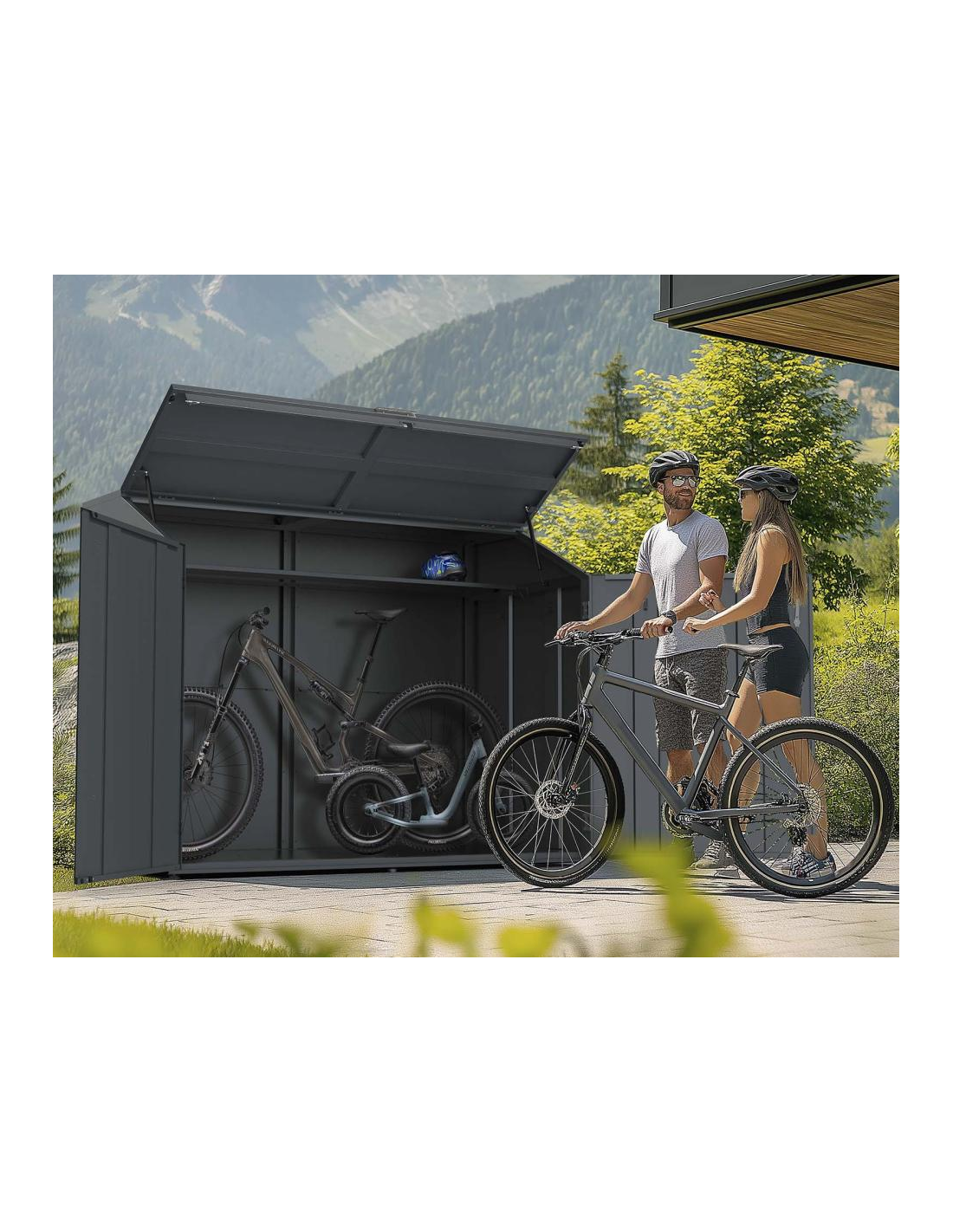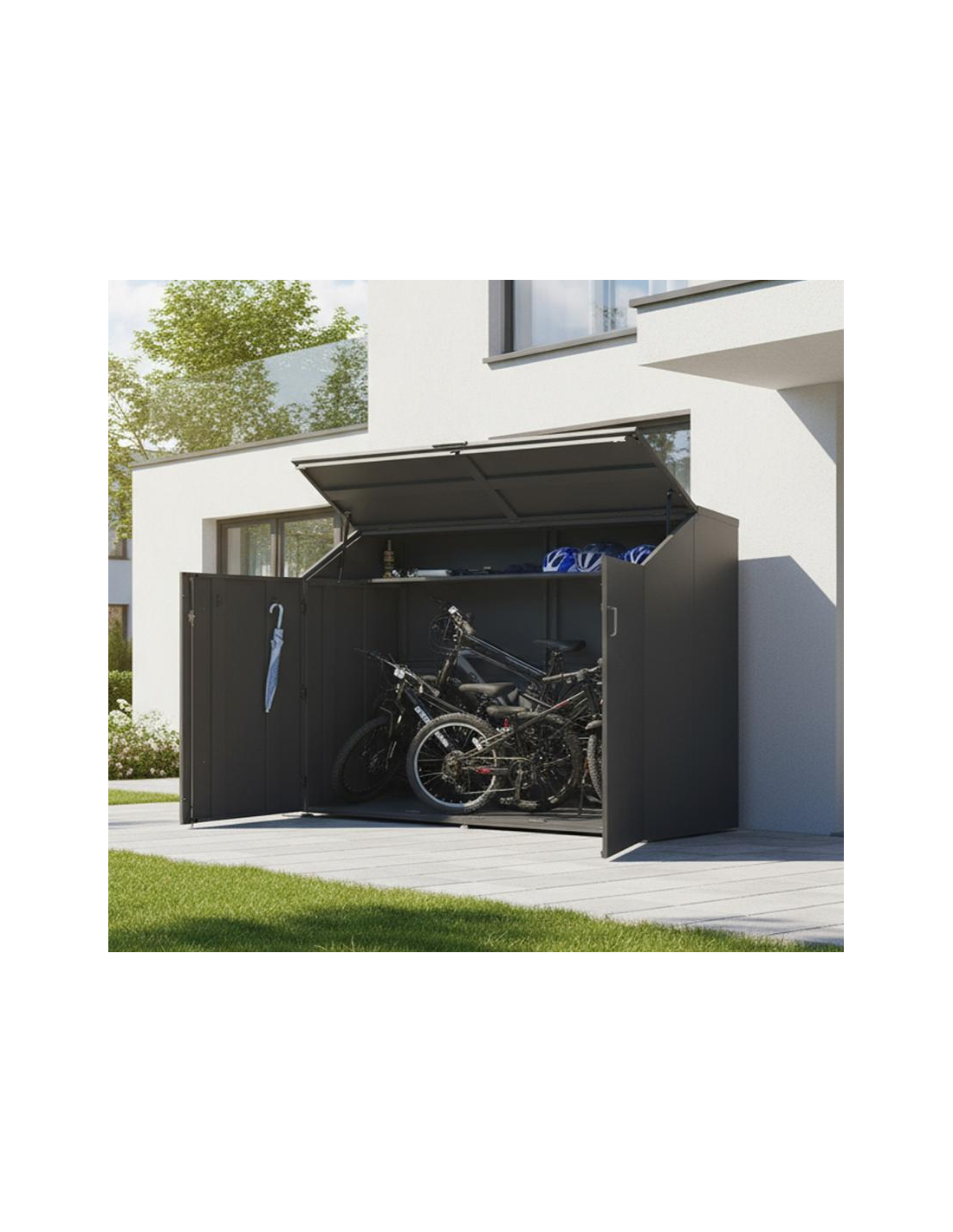 Westmann Cykelskur udført i et stilrent design af antracit lakeret stål. Cykelskuret måler 124 - 154 cm i højden og 200 x 45 - 100 cm i bredde og dybde. Skuret er med bund samt kroge til ophæng og hylde.