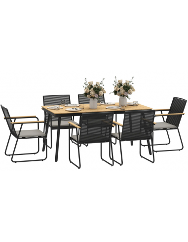 Spisebordssæt med 6 havestole og 1 havebord. Sættet er fremstillet i sortlakeret metal og sort polyester med bordplade og armlæn i naturfarvet komposit. Materialerne er UV resistente. Siddehynderne med skumfyld er med aftageligt og vaskbart betræk.