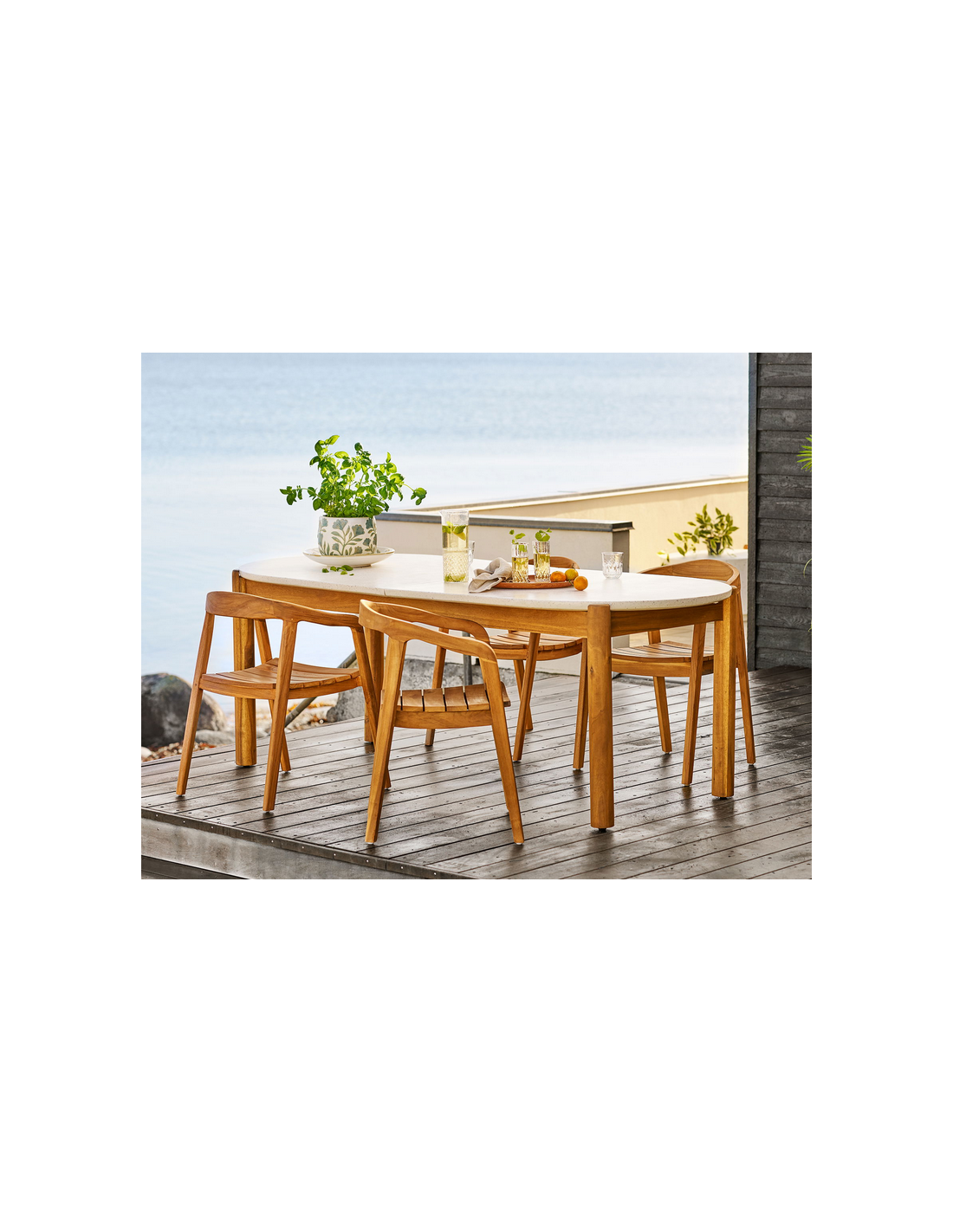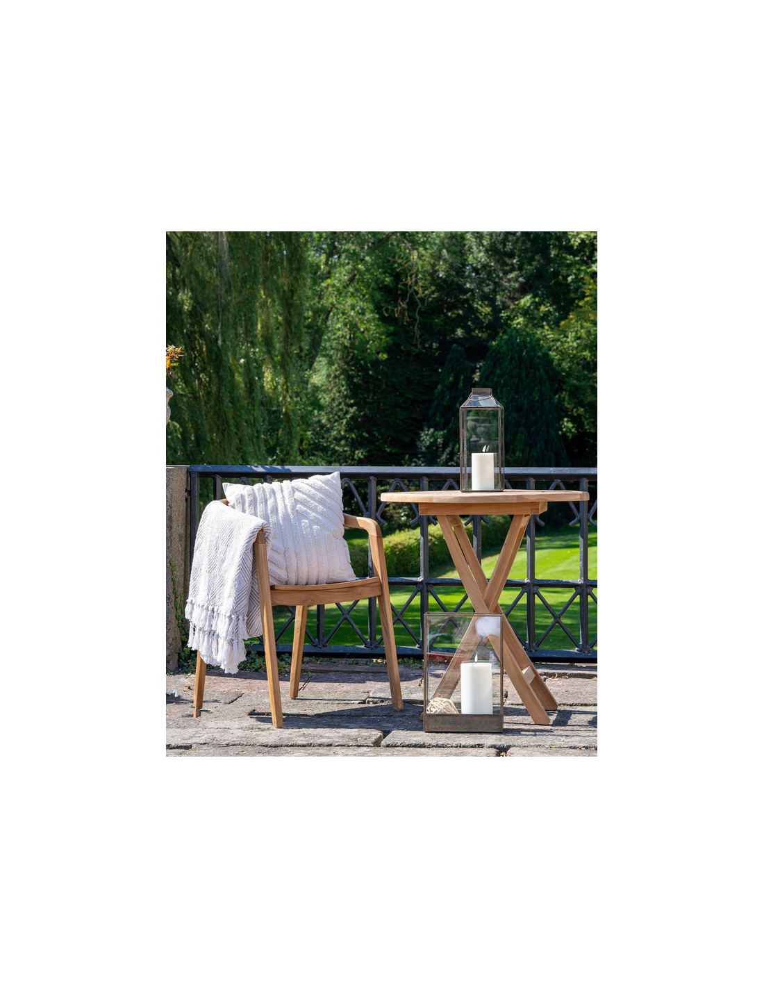 Bemærk venligst, at teaktræ er et naturligt materiale, som har tendens til at blive gråligt med årerne. Behandl havestolen med teaktræsolie for at hindre denne proces. Teaktræ er naturligt resistent overfor fugt.