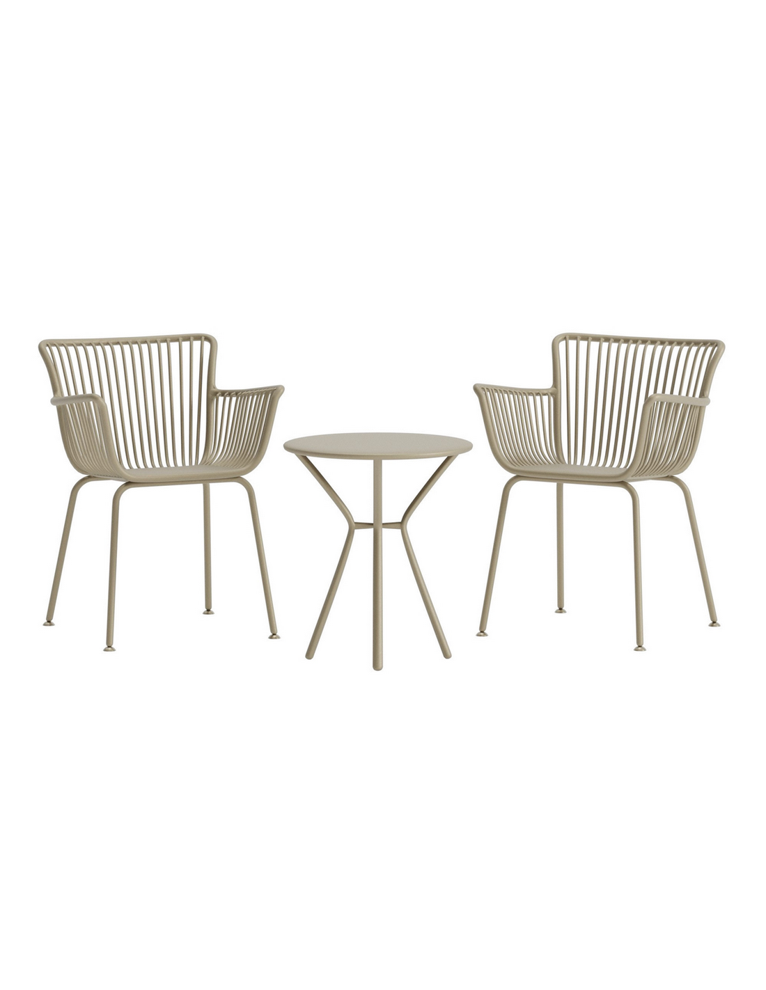 SIFNO Bistrosæt til haven, terrassen eller altanen, udført i et nordisk design af beige pulverlakeret rustfri stål og polypropylene. Sættet består af 2 x havestole og 1 x havebord.