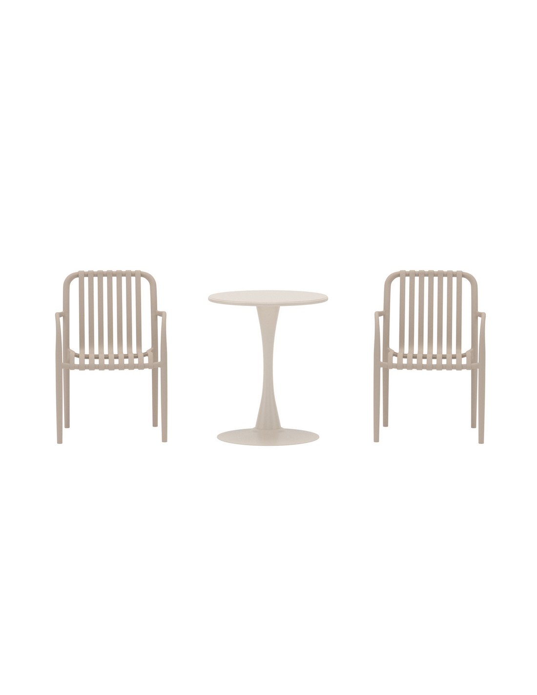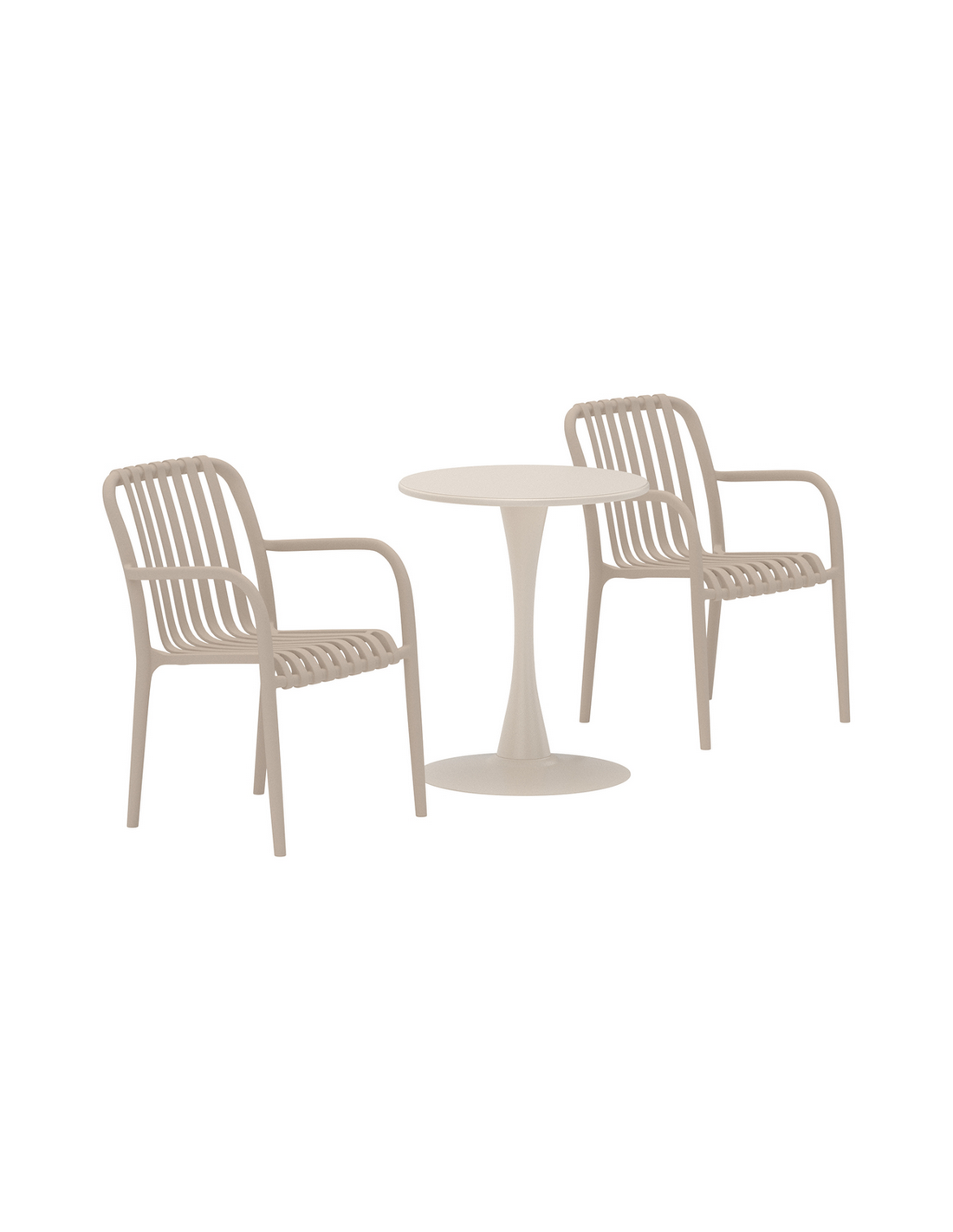 LIMNO Bistrosæt til haven, terrassen eller altanen, udført i et nordisk design af beige pulverlakeret rustfri stål og polypropylene. Sættet består af 2 x havestole og 1 x havebord.