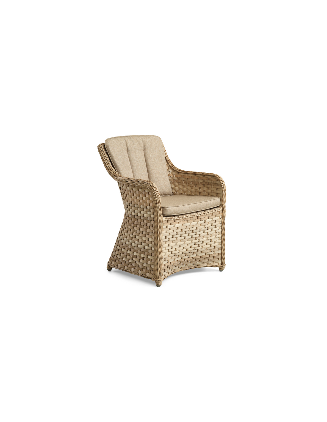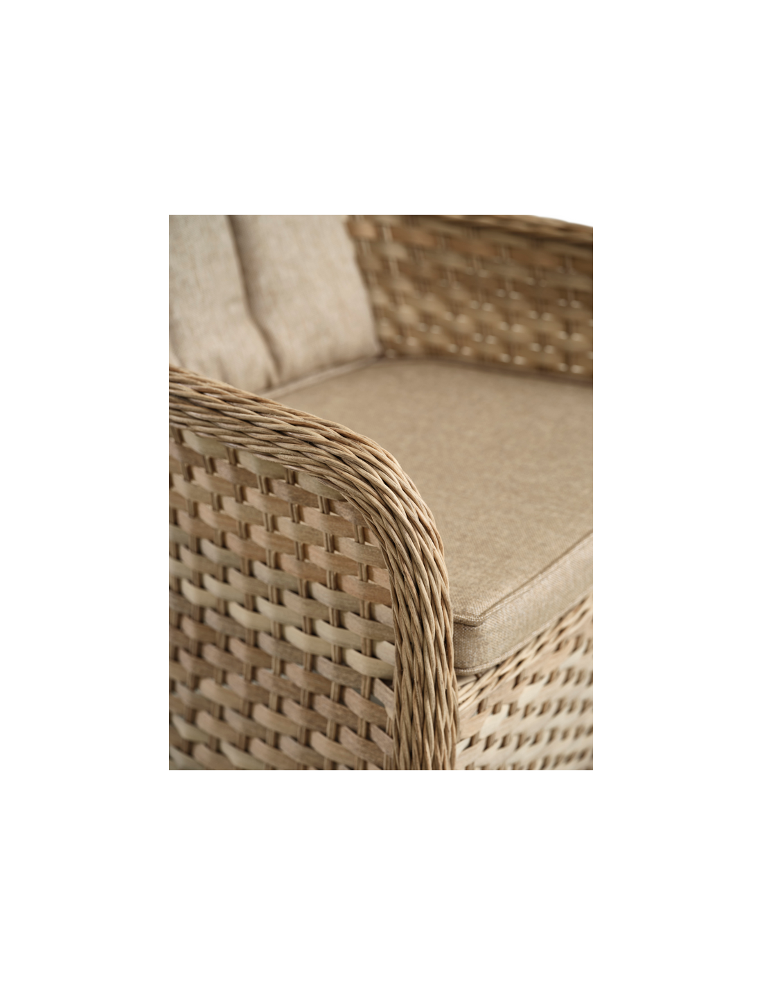 NUSA Sæt med 2 x havestole udført i et design af naturfarvet polyrattan med et indre i aluminium. Hertil hynder i naturfarvet polyester med skumfyld. Stolene måler 88 cm i højden over ryggen.