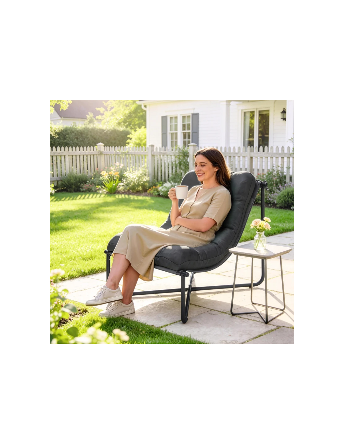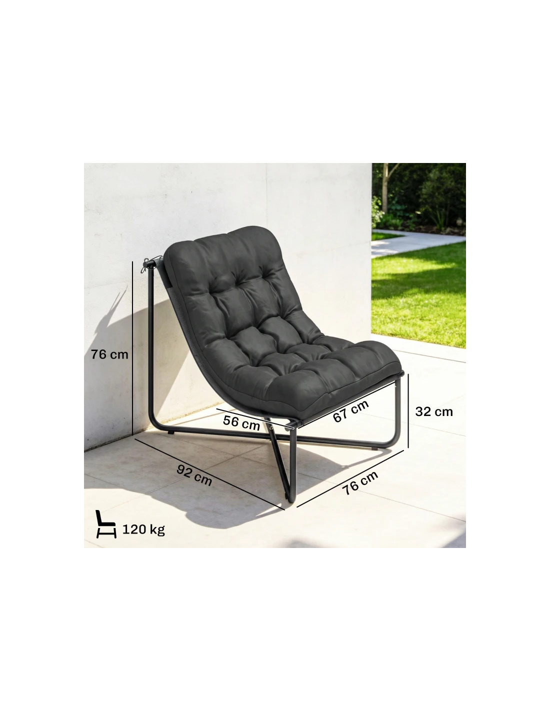Lounge havestol udført i et moderne design af mørkegrå pulverlakeret rustfri stål og mørkegrå polyester med skumfyld. Stolen måler 76 cm i højden over ryggen og med en siddehøjde på 32 - 42 cm (hyndens tykkelse: 10 cm).