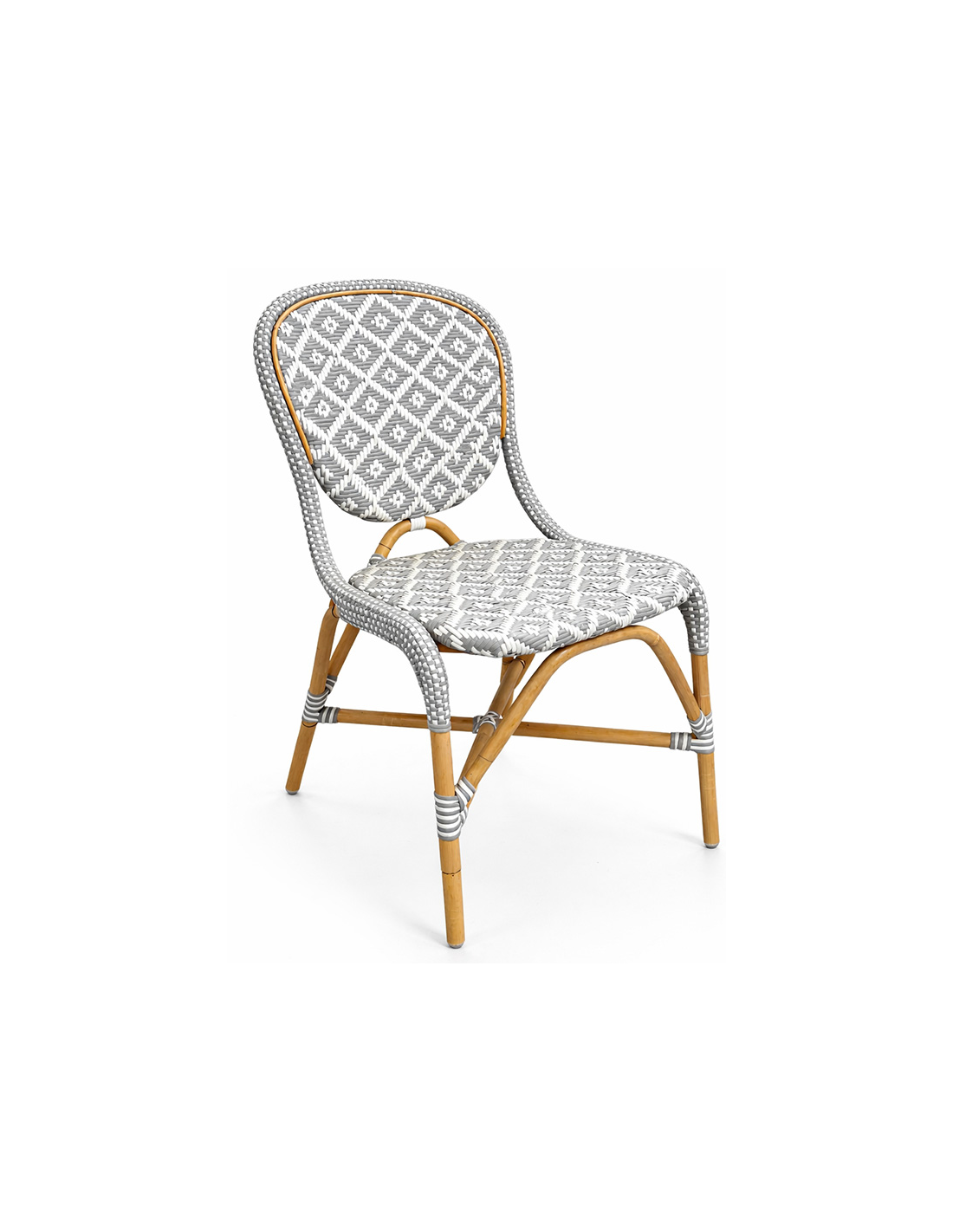 Sæt med 2 x havestole fra Svenske Hillerstorp, udført i et romantisk design af naturfarvet rattan og med sæde og ryg i hvid og grå textilene. Stolene måler 87 cm i højden over ryggen og 50 x 56 cm i bredde og dybde. Siddehøjden er 45 cm.
