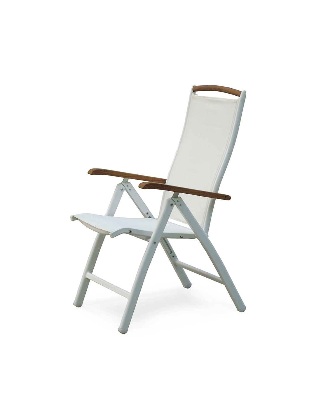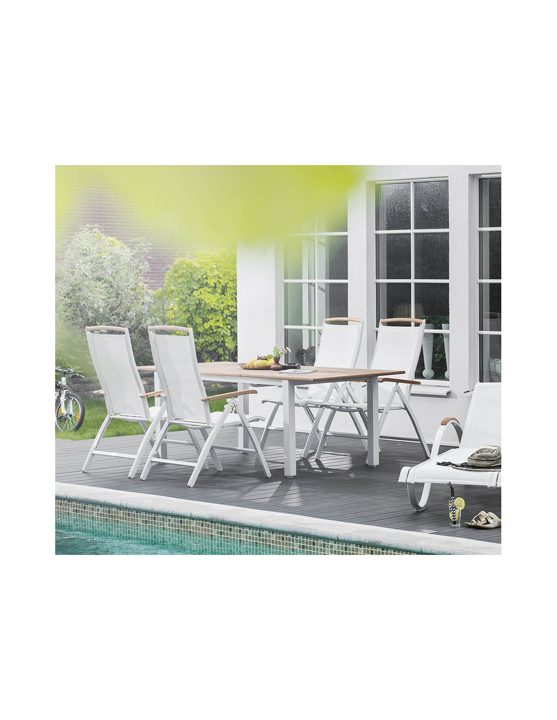 Moderne positions havestol fra Svenske Hillerstorp, udført i et stilrent design af hvidlakeret aluminium og vandafvisende textilene, med detaljer i teak træ. Stolen måler 110 cm i højden over ryggen og 61 x 75 cm i bredde og dybde. Siddehøjden er 43 cm.