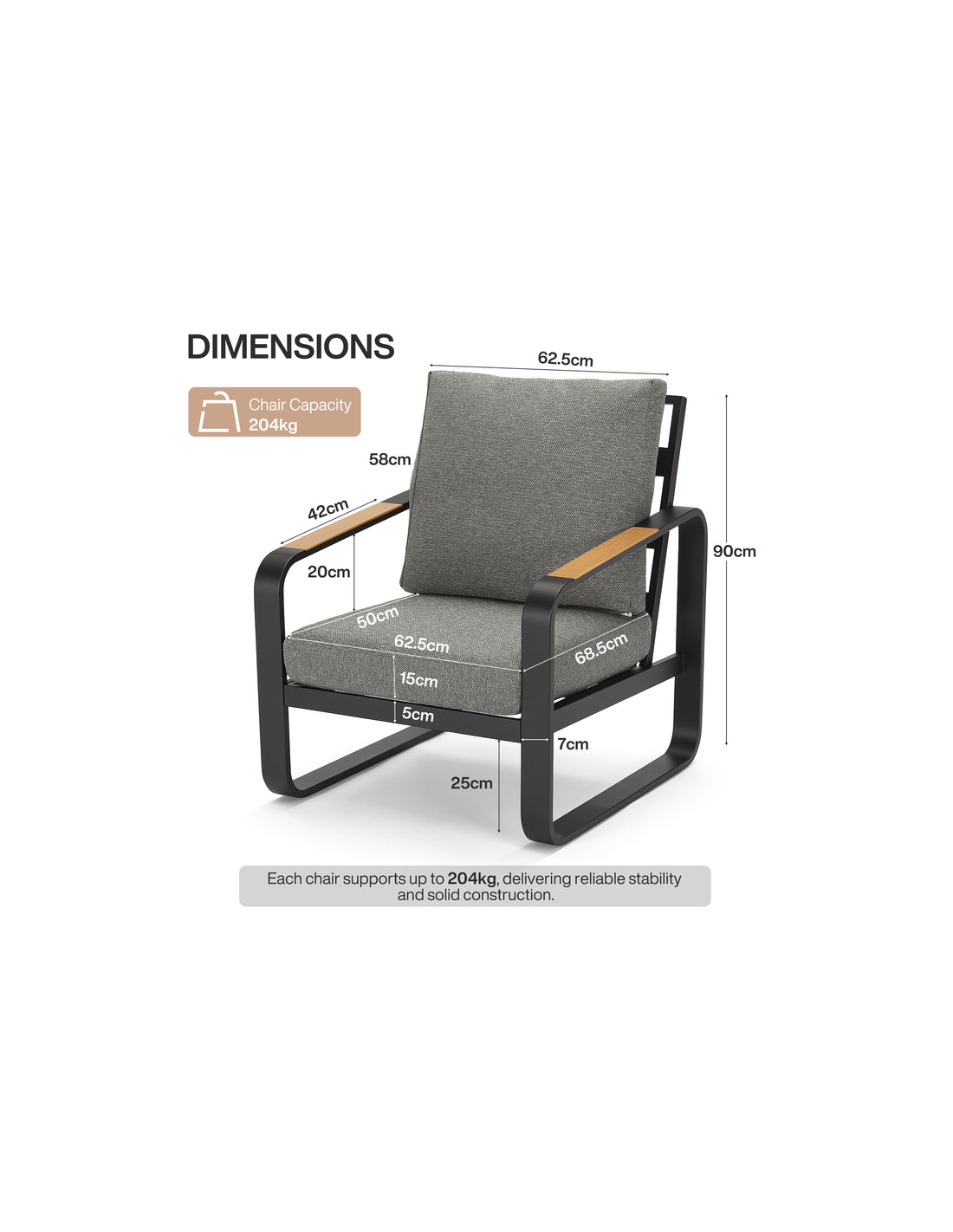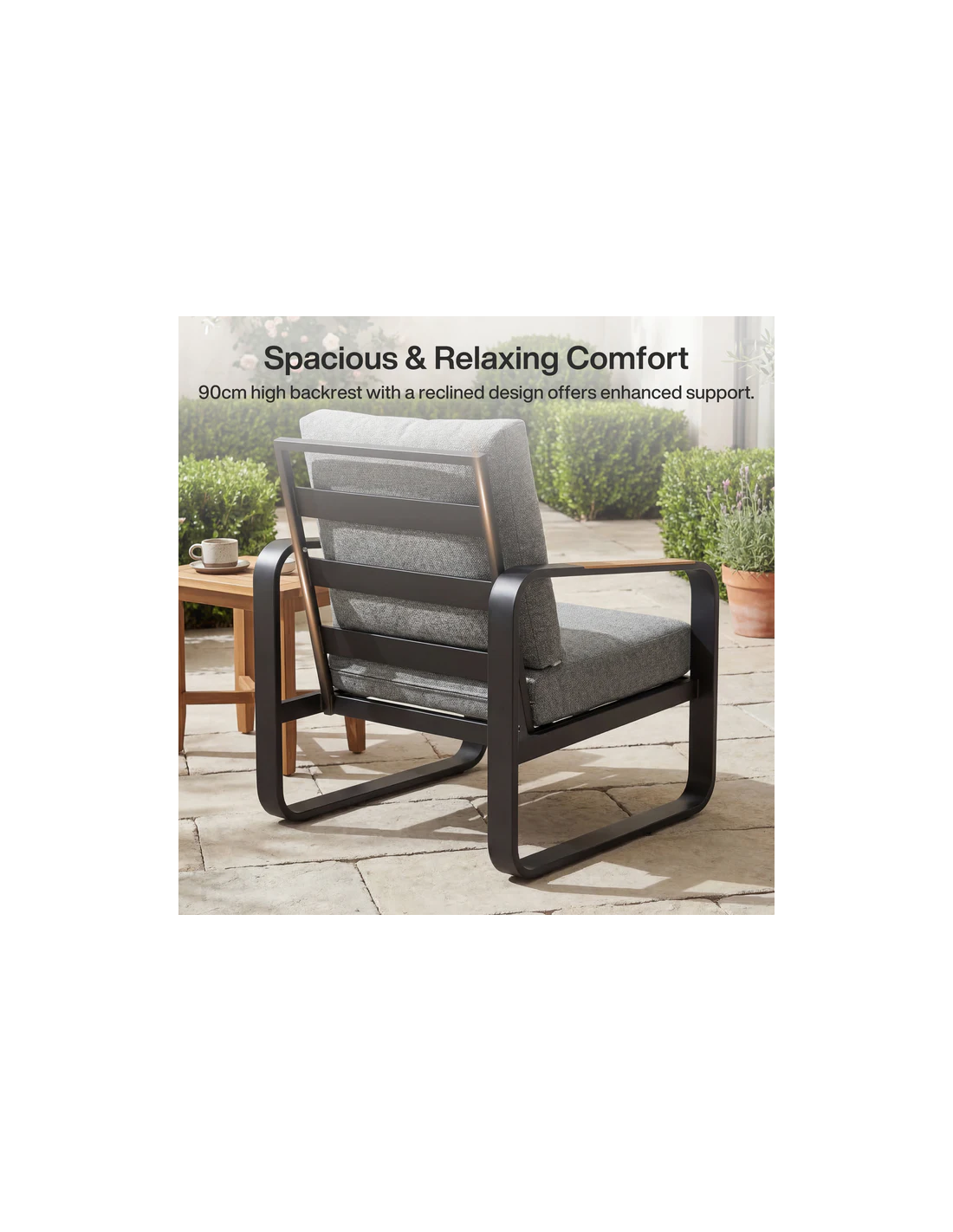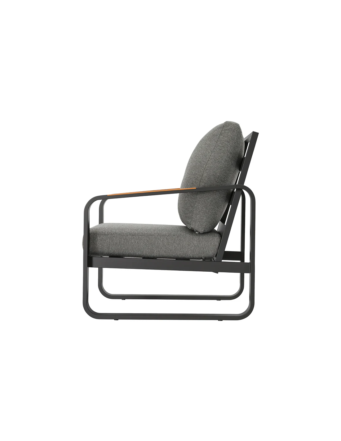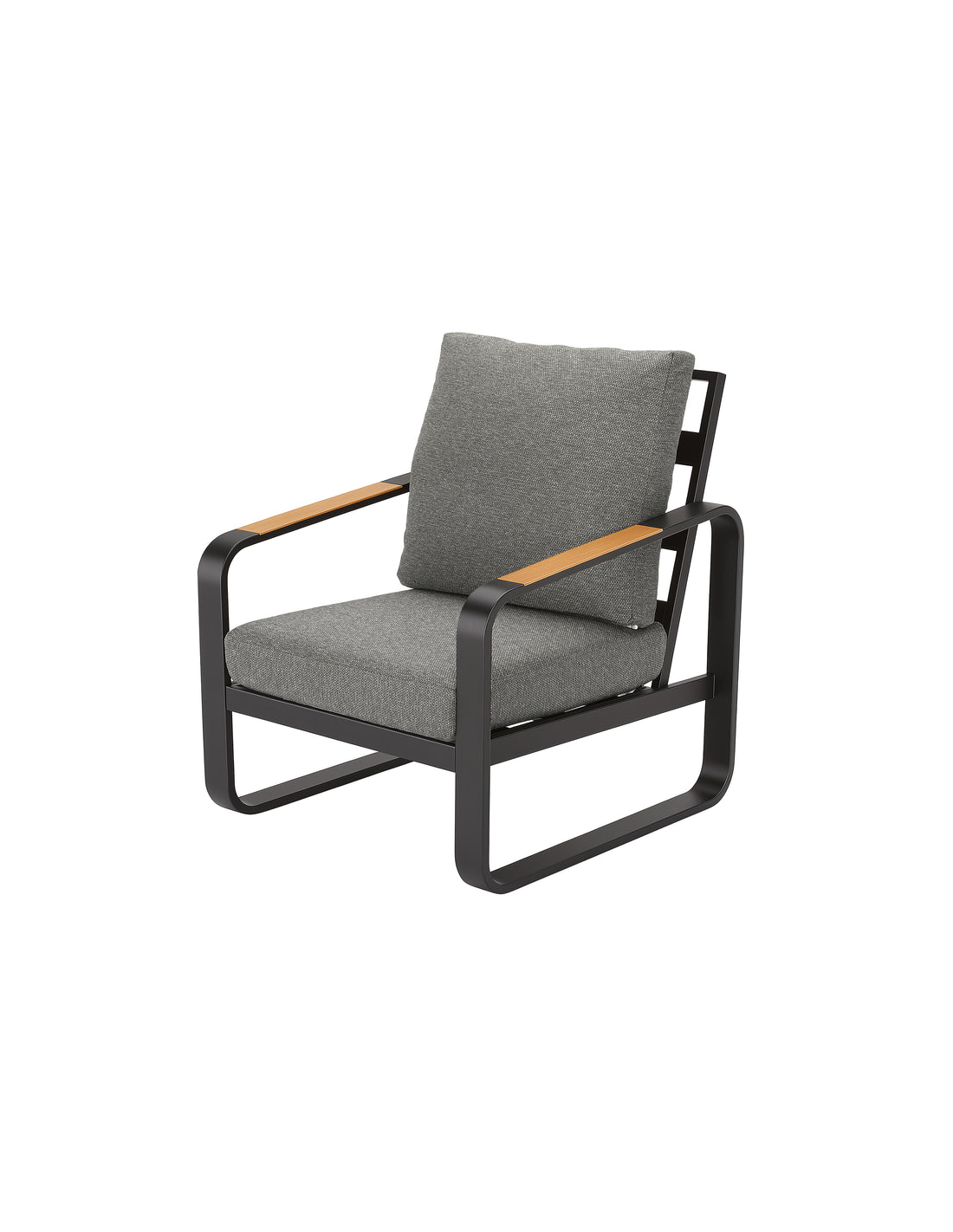 Lounge havestol udført i et moderne design af mørkegrå lakeret metal, brunlakeret træ og grå olefin tekstil, der er UV-resistent og vandafvisende. Stolen måler 90 cm i højden over ryggen og med en siddehøjde på 45 cm.