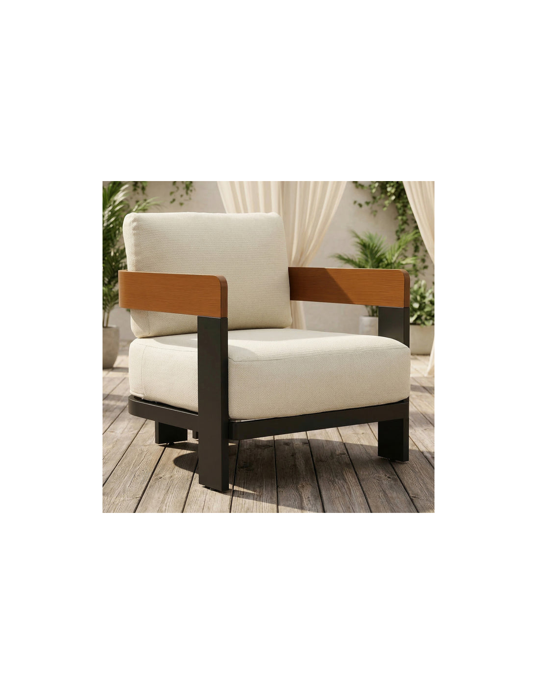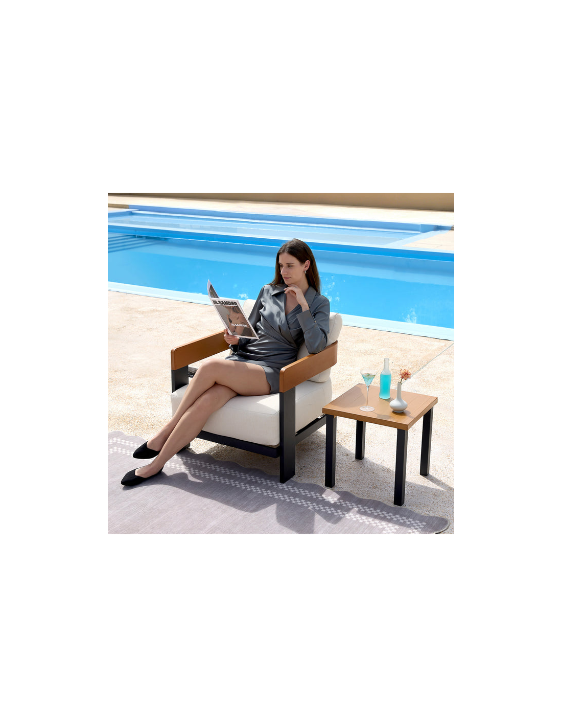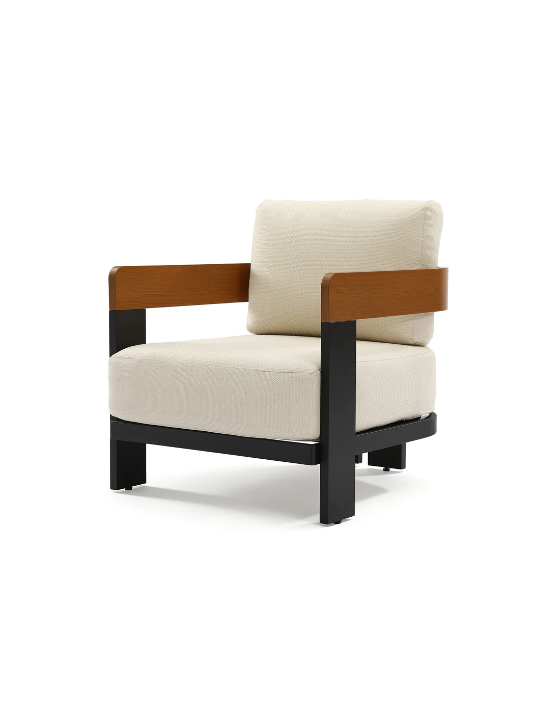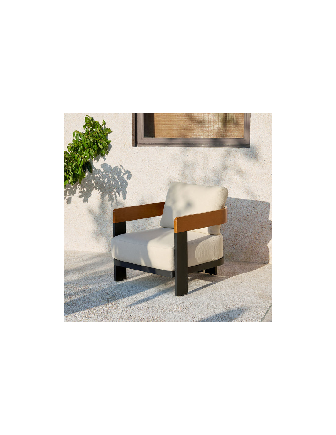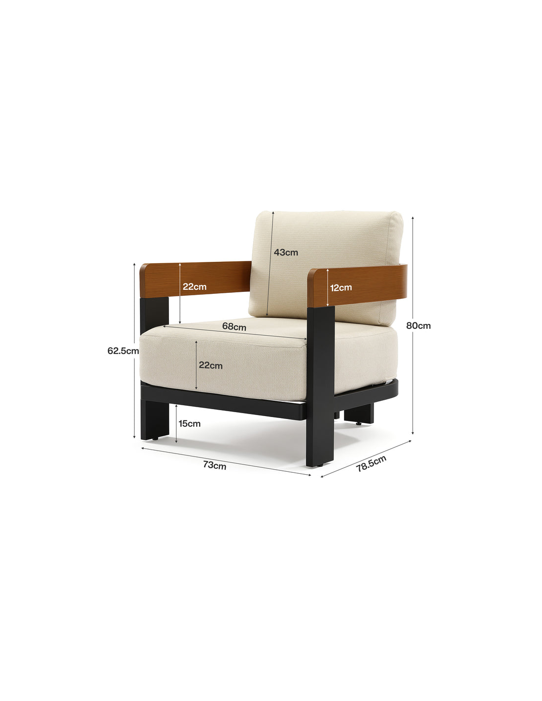 Lounge havestol udført i et moderne design af mørkegrå lakeret aluminium med armlæn i folieret aluminium og hynder i beige olefin tekstil, der er UV-resistent og vandafvisende. Stolen måler 80 cm i højden over ryggen og med en siddehøjde på 40 cm.