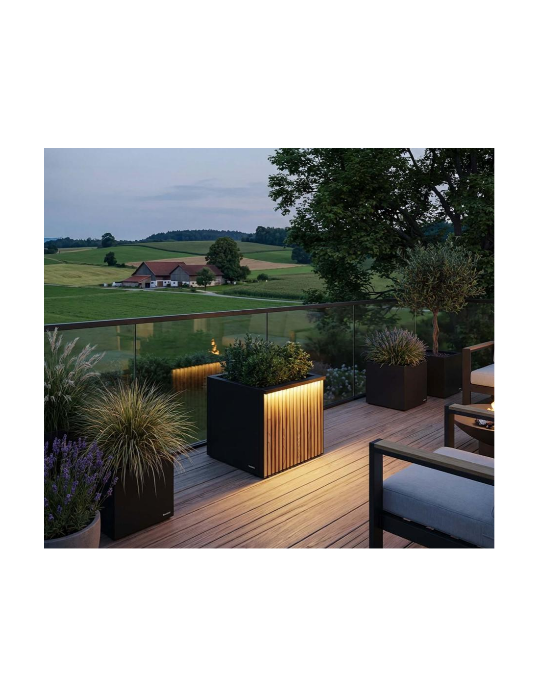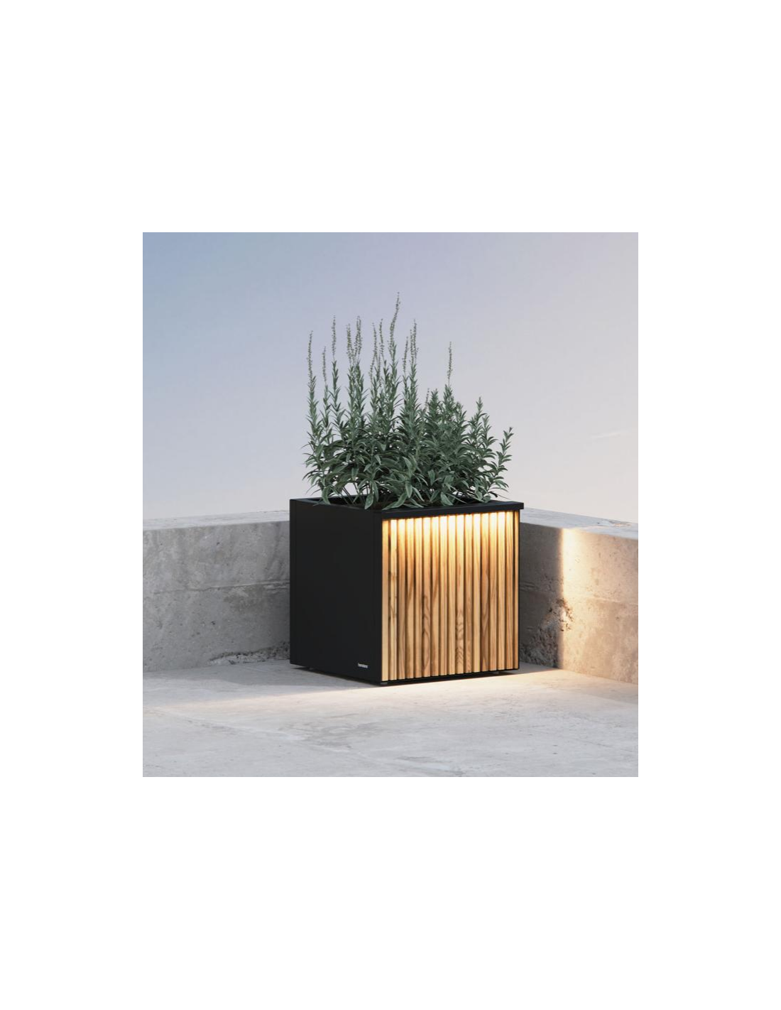 Højbed med LED lys fra Herstera Garden, fremstillet i et moderne og nordisk design af antracit pulverlakeret stål, der er både rust- og vejrbestandigt. Den ene side er i naturfarvet fyrretræ. Højbedet er med bund med drænhuller og måler 50 cm i højden og 50 x 53 cm i bredde og dybde. Højbedet kommer med LED lyskilde som er med IP67 beskyttelsesgrad og kablet måler 350 cm i længden. Let og udførlig montering med vejledning.