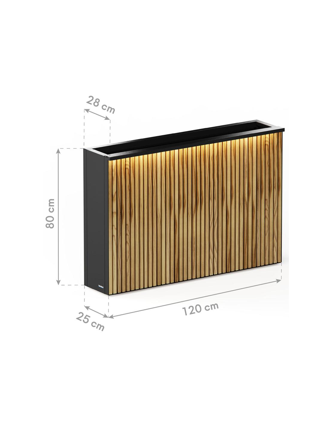 Højbed med LED lys fra Herstera Garden, fremstillet i et moderne og nordisk design af antracit pulverlakeret stål, der er både rust- og vejrbestandigt. Den ene side er i naturfarvet fyrretræ. Højbedet er med bund med drænhuller og måler 80 cm i højden og 120 x 28 cm i bredde og dybde. Højbedet kommer med LED lyskilde som er med IP67 beskyttelsesgrad og kablet måler 350 cm i længden. Let og udførlig montering med vejledning.