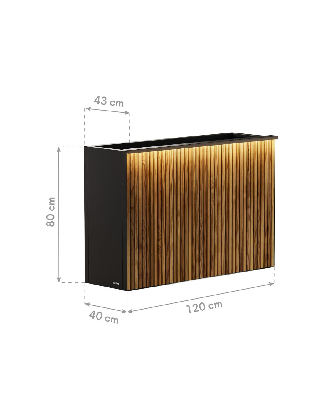 Højbed med LED lys fra Herstera Garden, fremstillet i et moderne og nordisk design af antracit pulverlakeret stål, der er både rust- og vejrbestandigt. Den ene side er i naturfarvet fyrretræ. Højbedet er med bund med drænhuller og måler 80 cm i højden og 120 x 43 cm i bredde og dybde. Højbedet kommer med LED lyskilde som er med IP67 beskyttelsesgrad og kablet måler 350 cm i længden. Let og udførlig montering med vejledning.