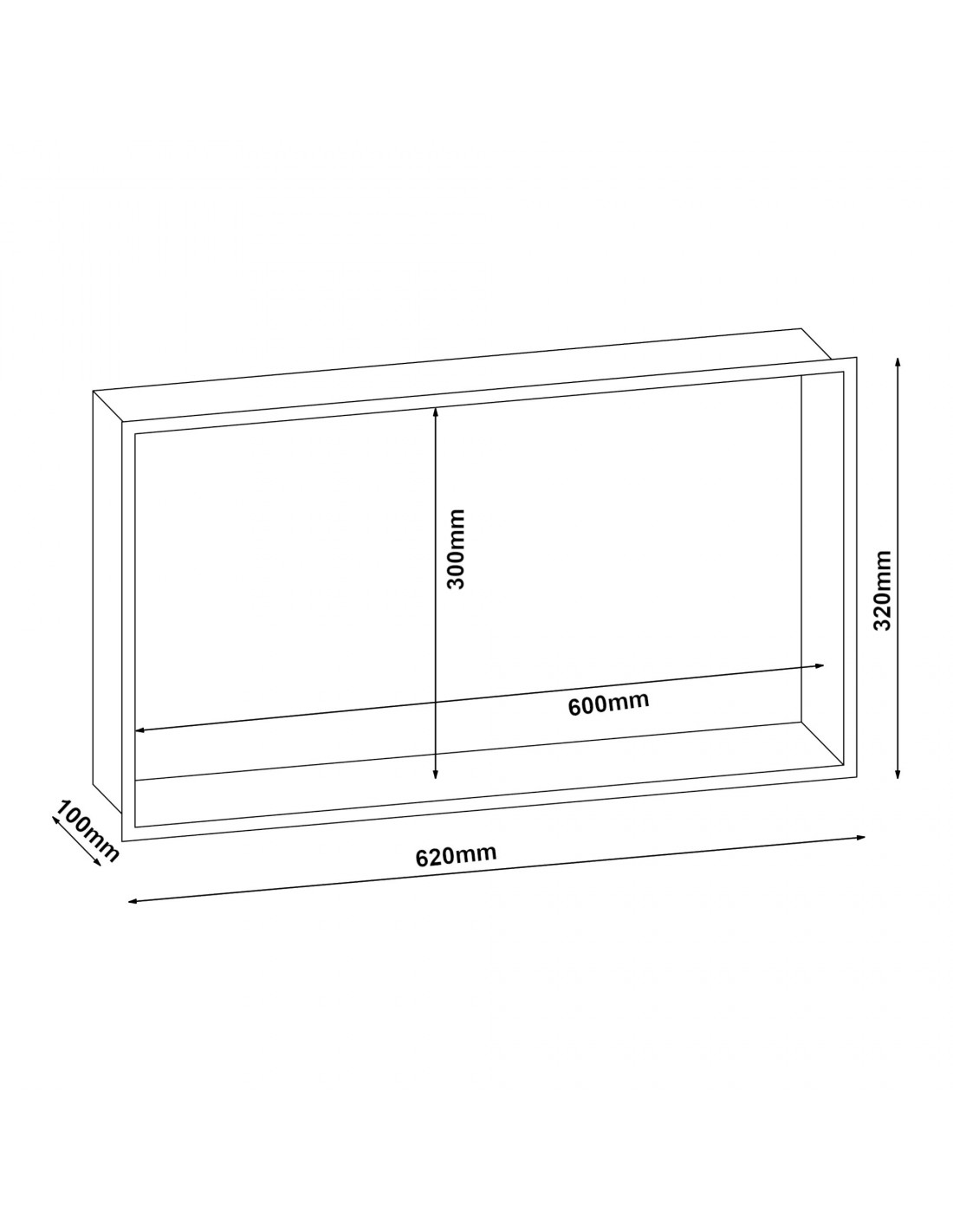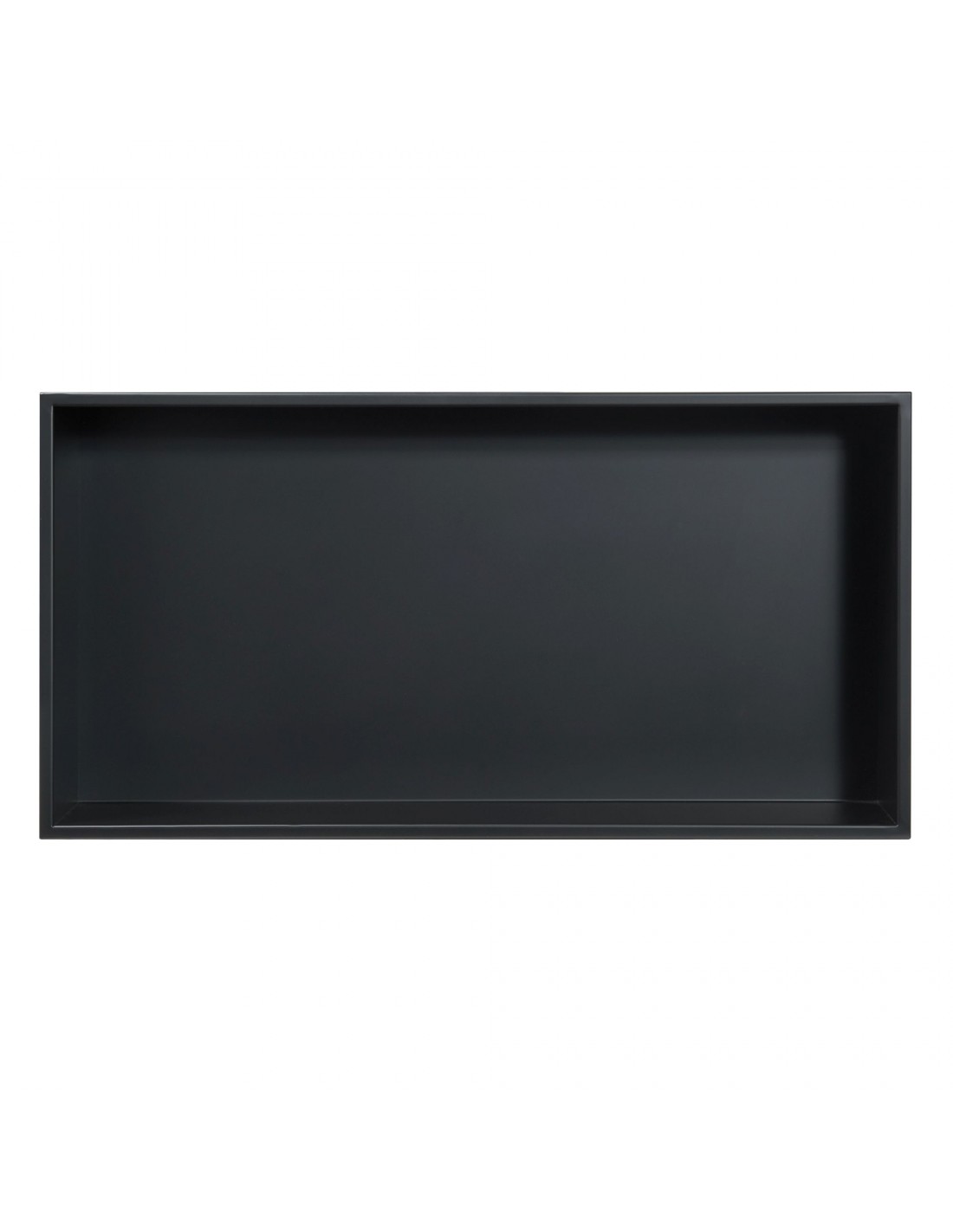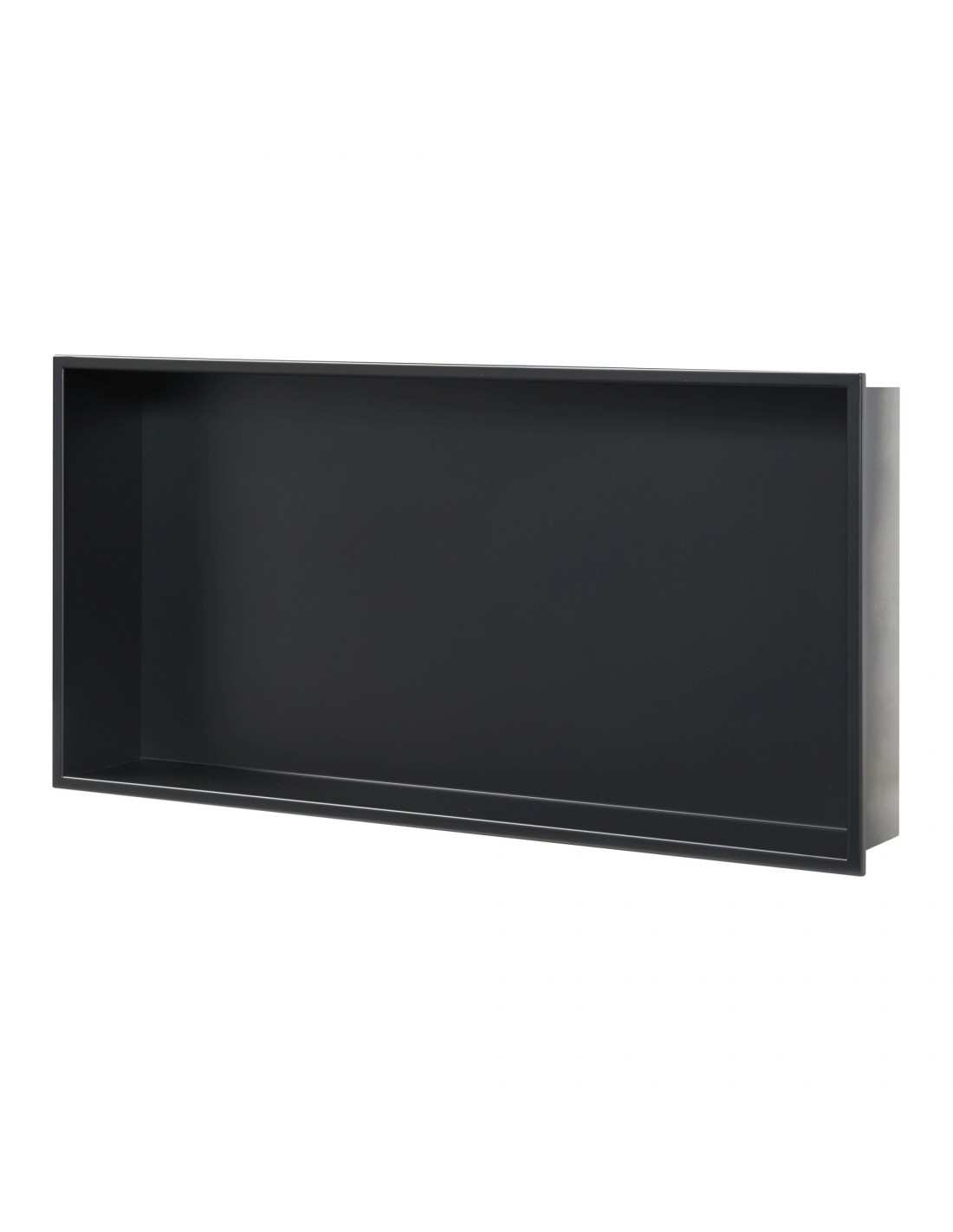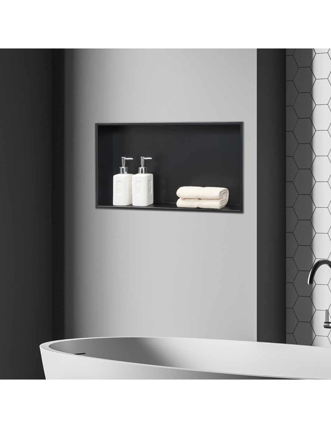 Hylde til indbygning på badeværelset, udført i et moderne design fremstillet af sortlakeret rustfri stål. Hylden måler 62 x 32 cm i bredde og højde og kan monteres enten vandret eller lodret.