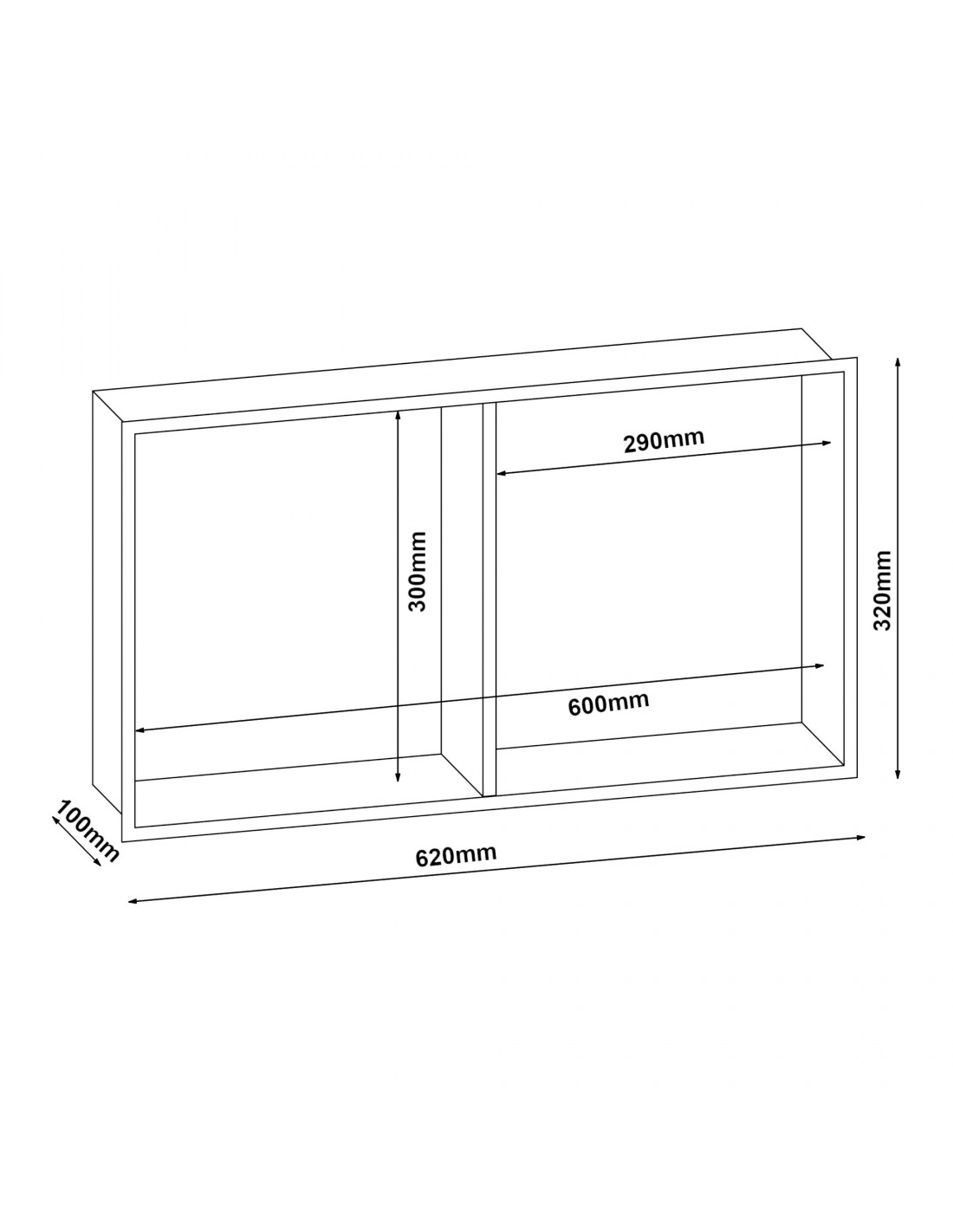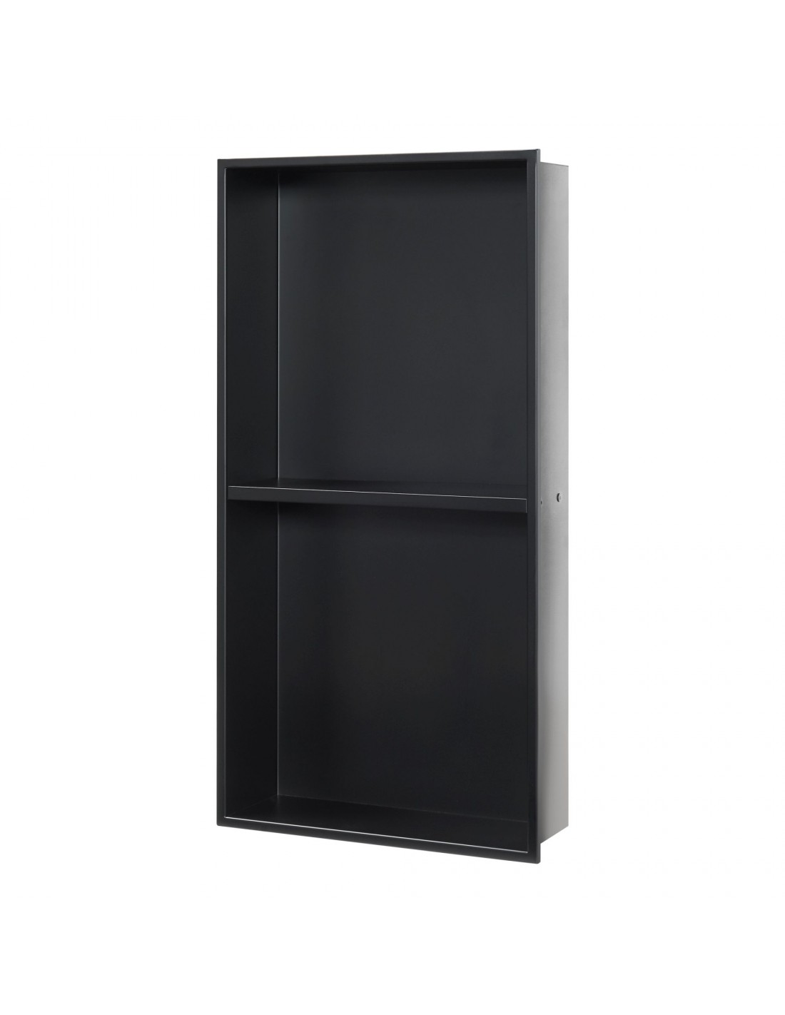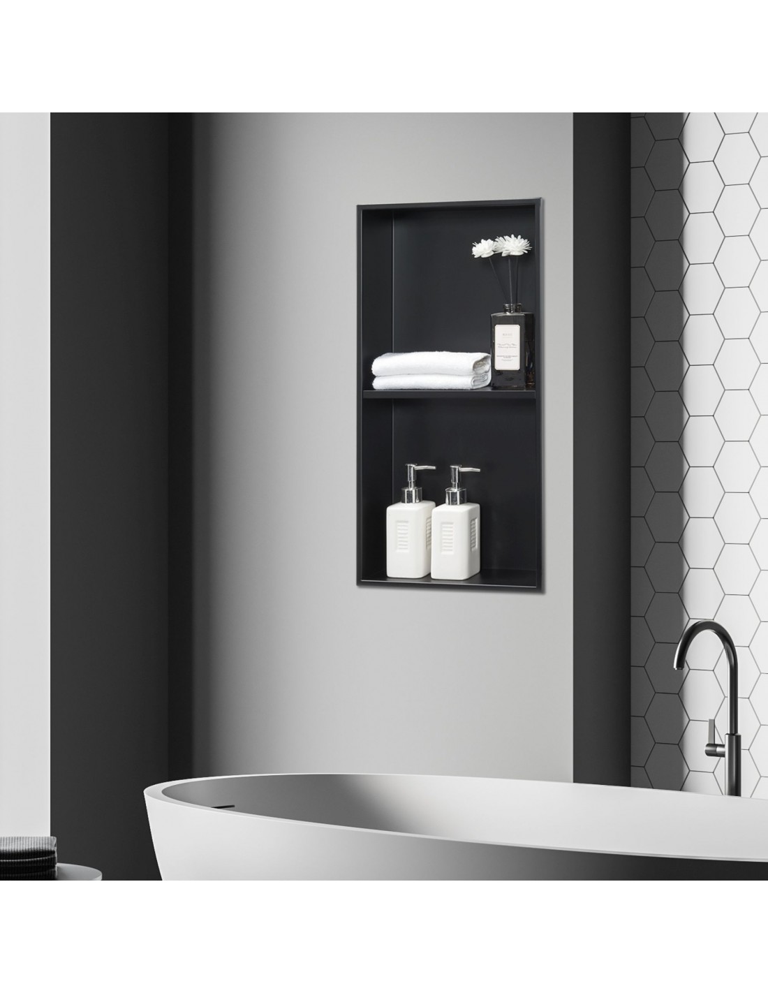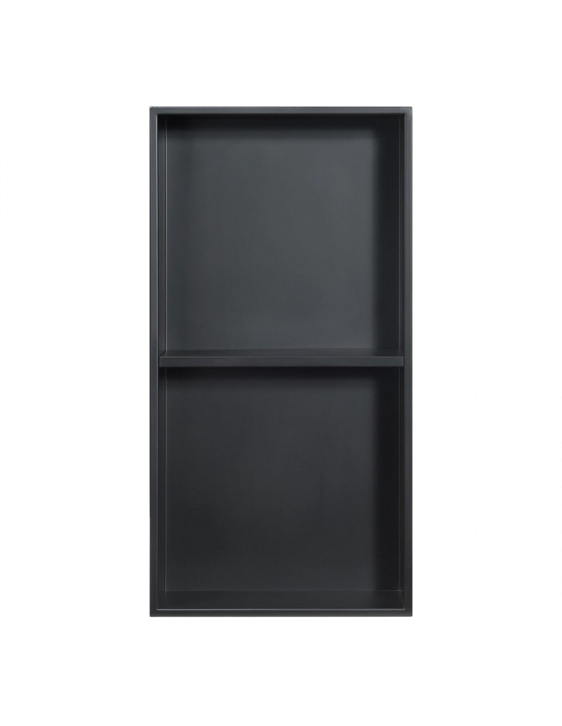 Hylde til indbygning på badeværelset, udført i et moderne design fremstillet af sortlakeret rustfri stål. Hylden måler 62 x 32 cm i bredde og højde og kan monteres enten vandret eller lodret.