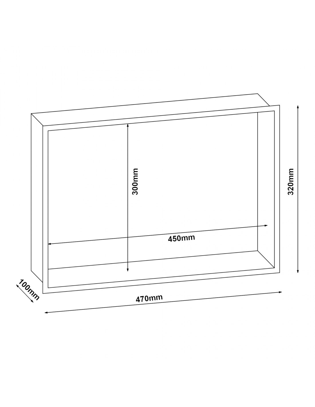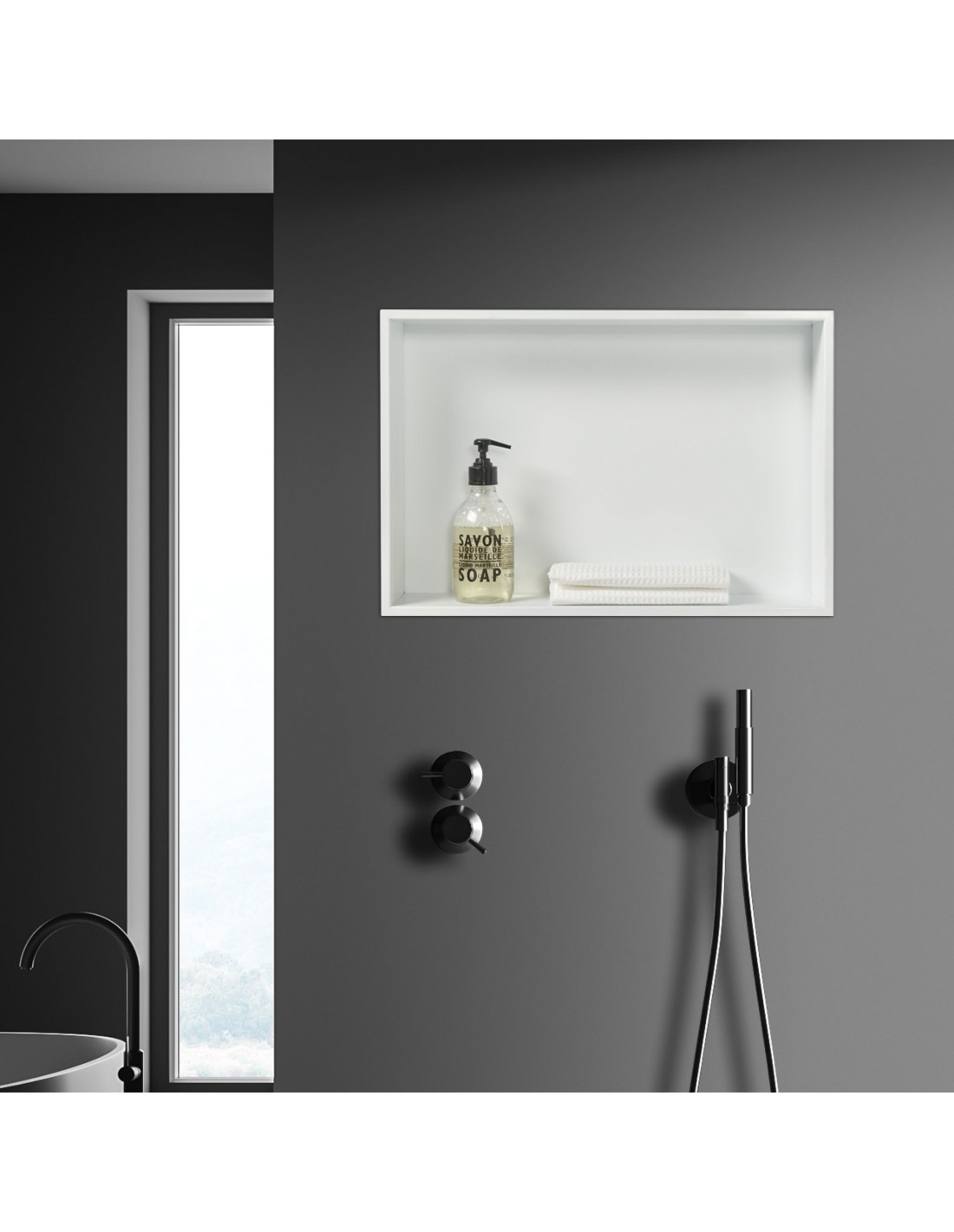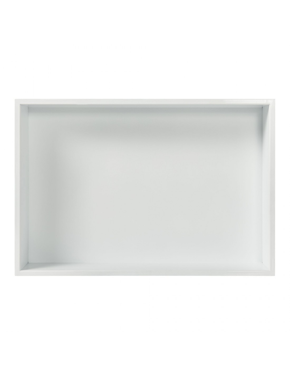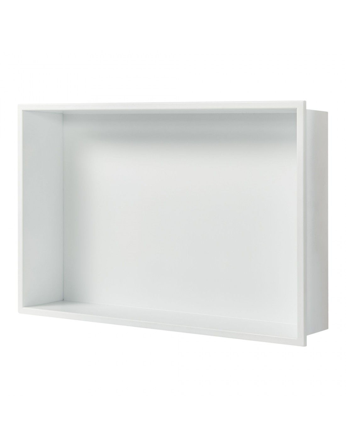 Hylde til indbygning på badeværelset, udført i et moderne design fremstillet af hvidlakeret rustfri stål. Hylden måler 47 x 32 cm i bredde og højde og kan monteres enten vandret eller lodret.