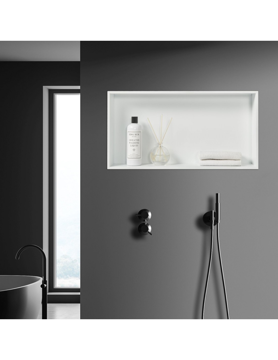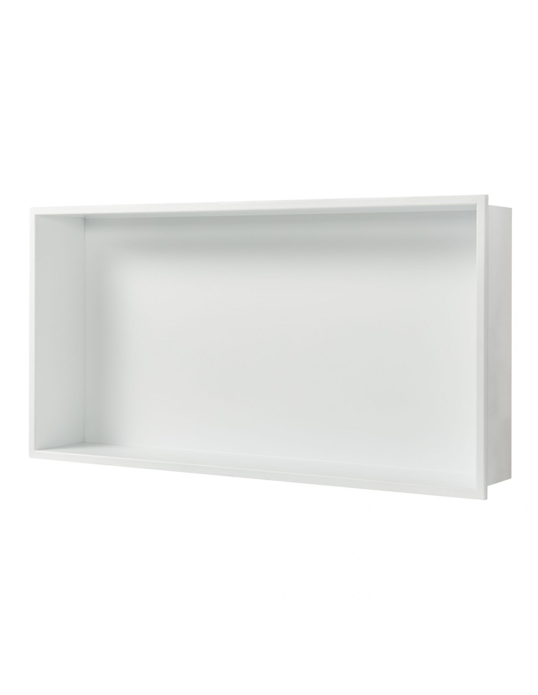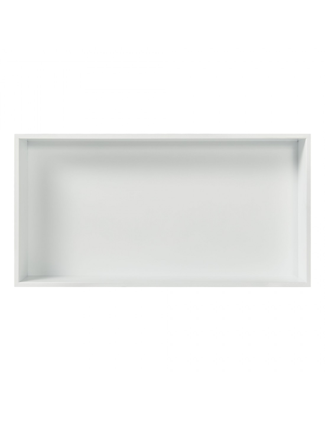 Hylde til indbygning på badeværelset, udført i et moderne design fremstillet af hvidlakeret rustfri stål. Hylden måler 62 x 32 cm i bredde og højde og kan monteres enten vandret eller lodret.