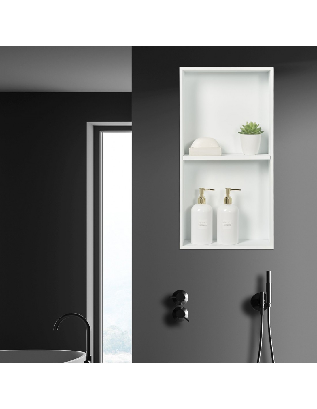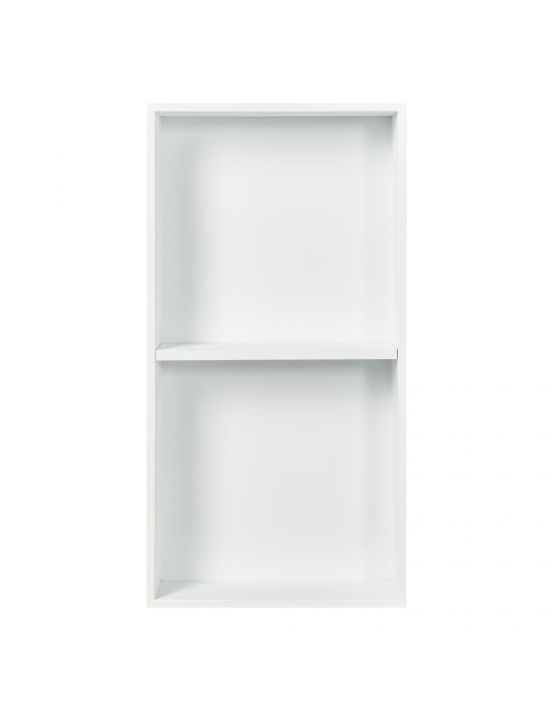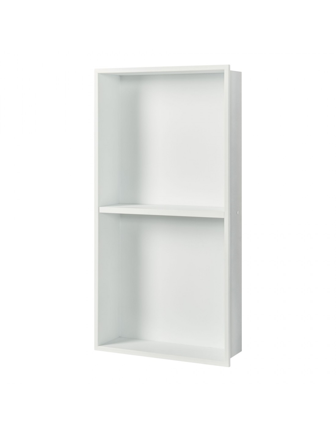 Hylde til indbygning på badeværelset, udført i et moderne design fremstillet af hvidlakeret rustfri stål. Hylden måler 62 x 32 cm i bredde og højde og kan monteres enten vandret eller lodret.