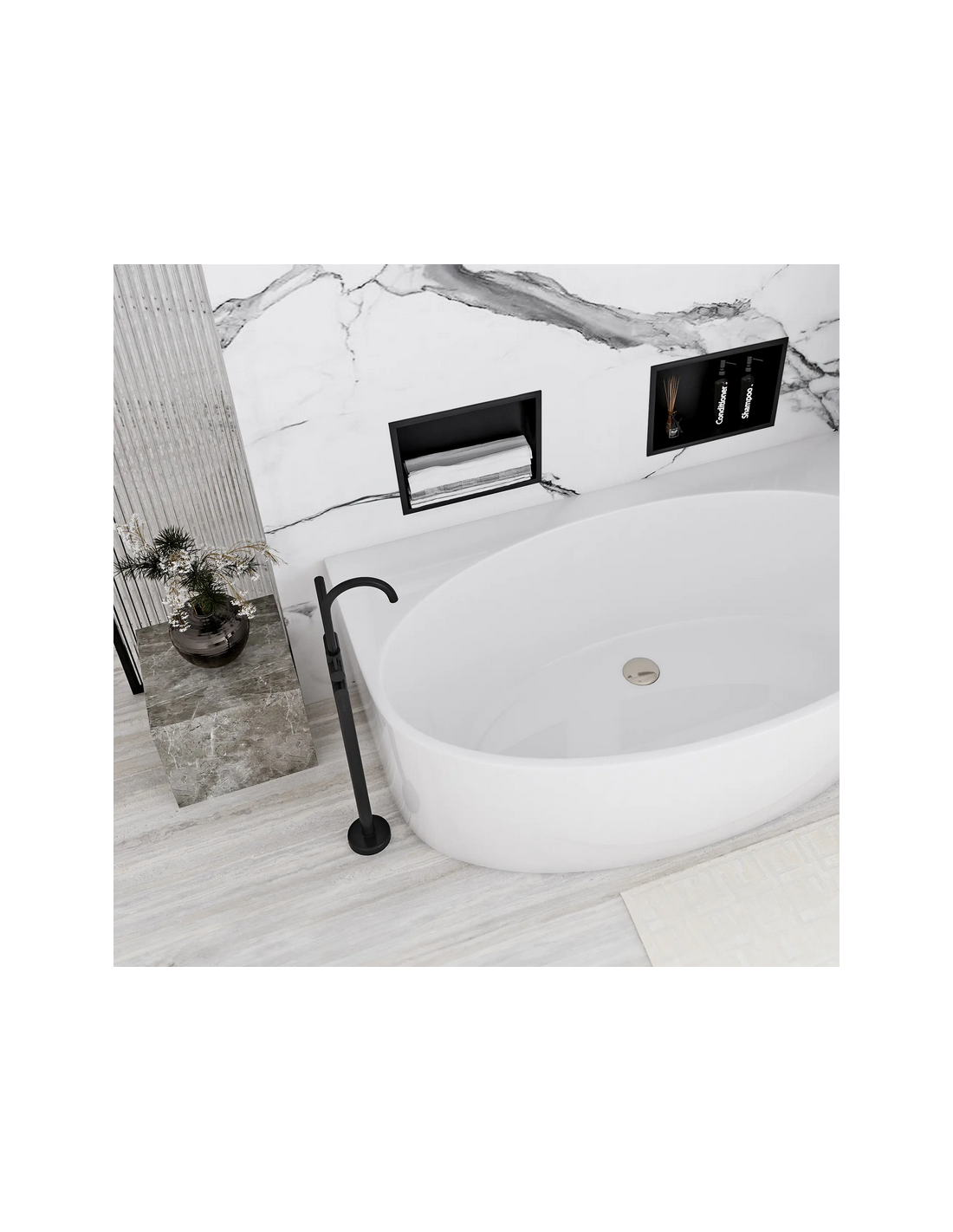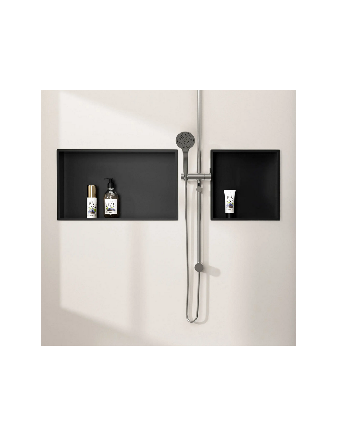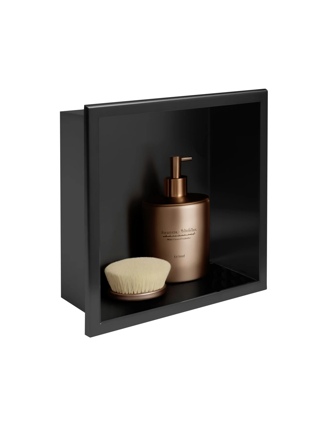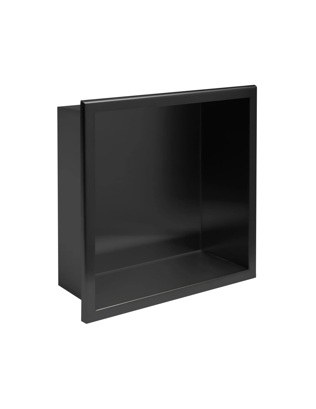 Hylde til indbygning i vægge på badeværelset, eksempelvis i brusekabine/bruseniche. Hylden er fremstillet i rustfri mat sortlakeret stål og måler 34 x 34 cm i højde og bredde og 10 cm i dybden. Selve den indre hylde måler 30 x 30 cm i højde og bredde og med dybde på 9,5 cm.