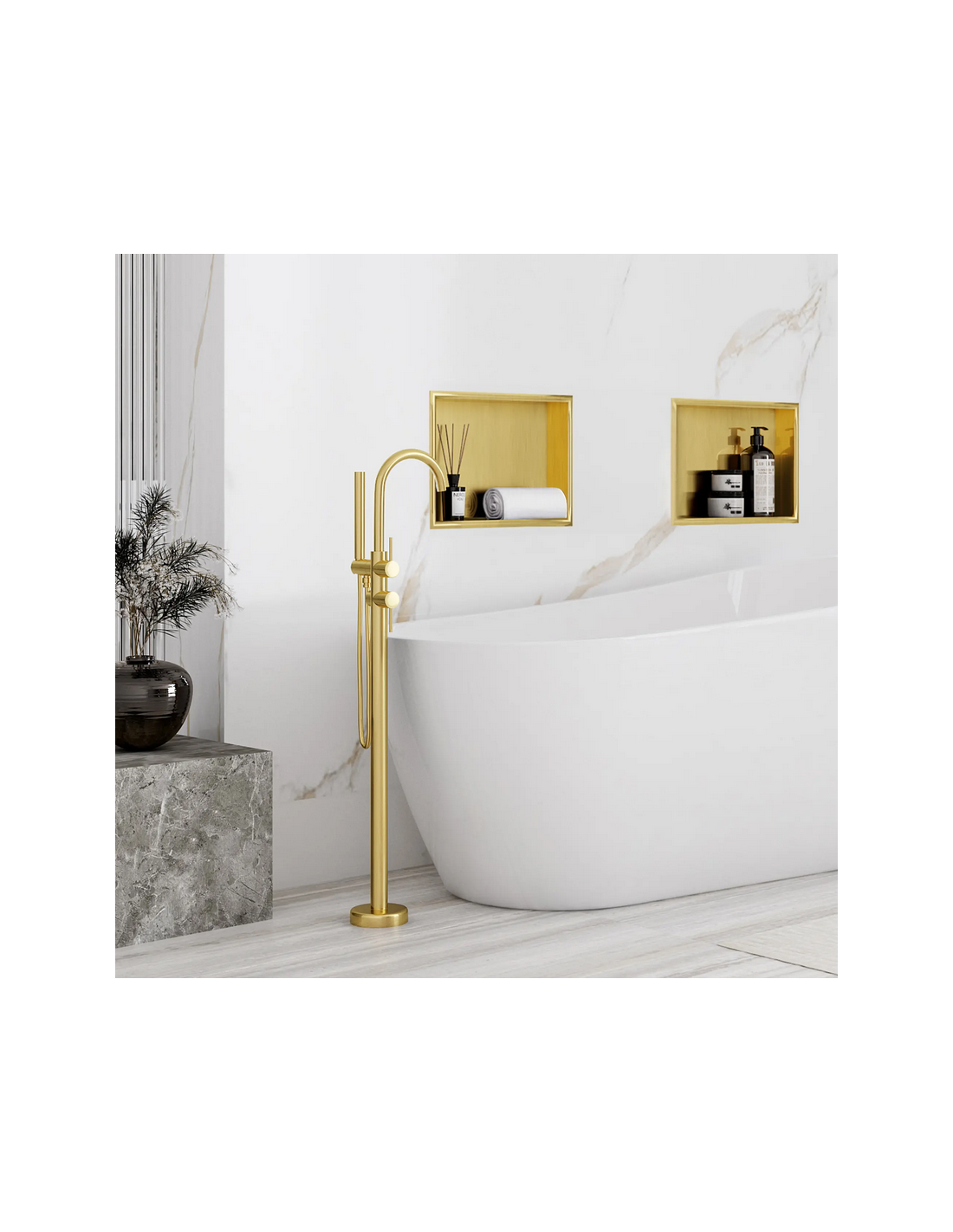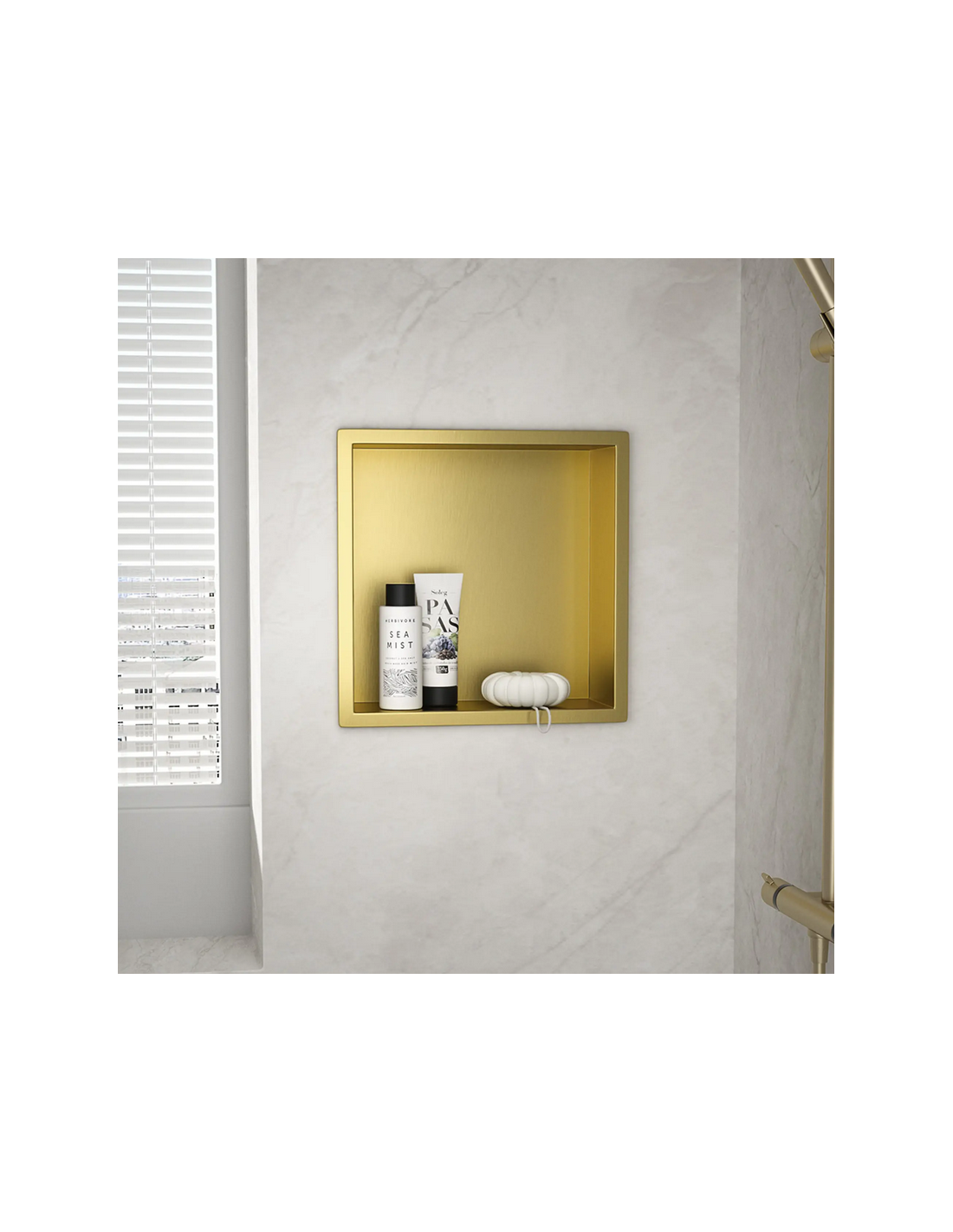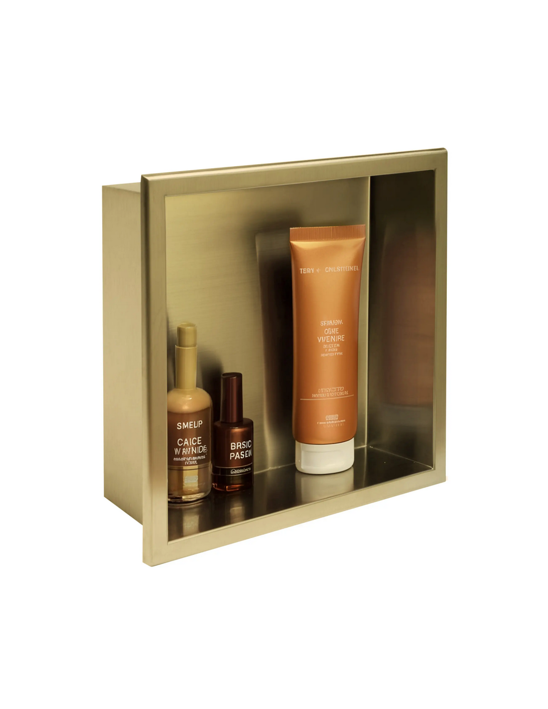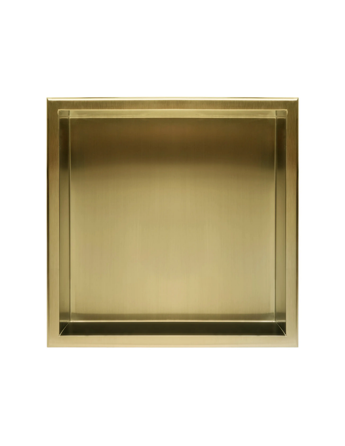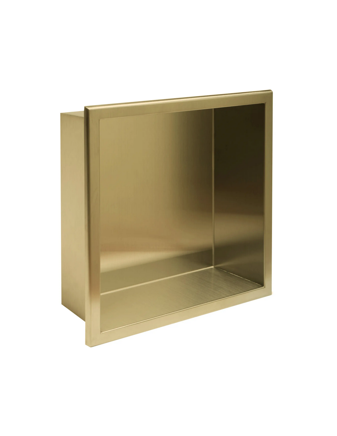 Hylde til indbygning i vægge på badeværelset, eksempelvis i brusekabine/bruseniche. Hylden er fremstillet i rustfri børstet guldfarvet stål og måler 34 x 34 cm i højde og bredde og 10 cm i dybden. Selve den indre hylde måler 30 x 30 cm i højde og bredde og med dybde på 9,5 cm.