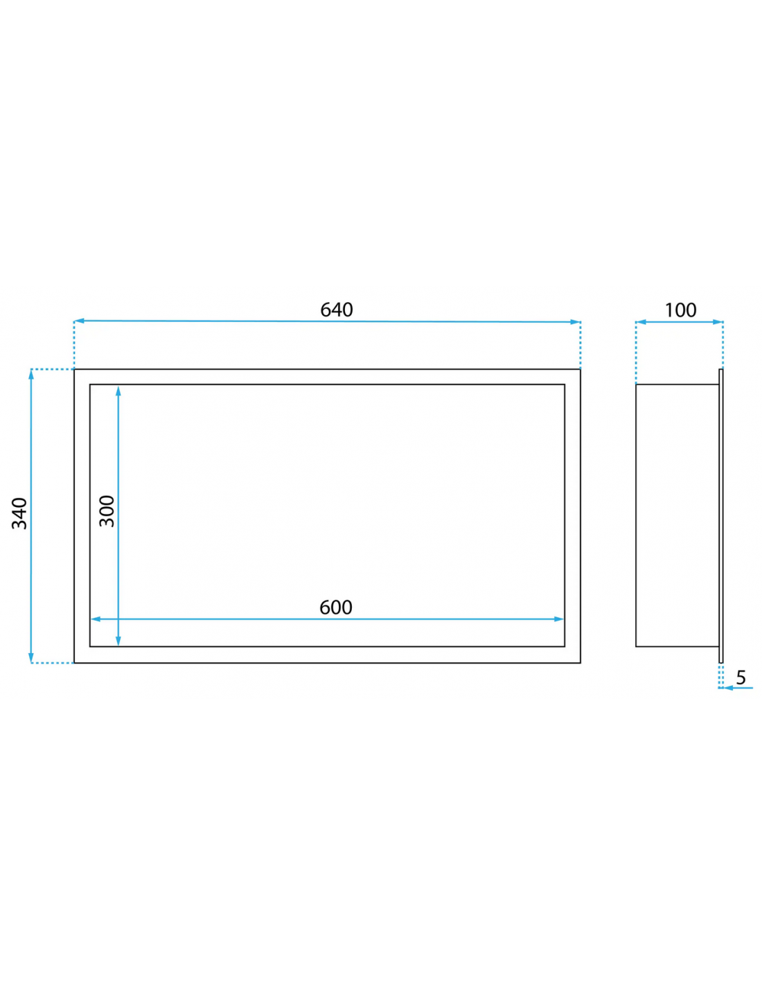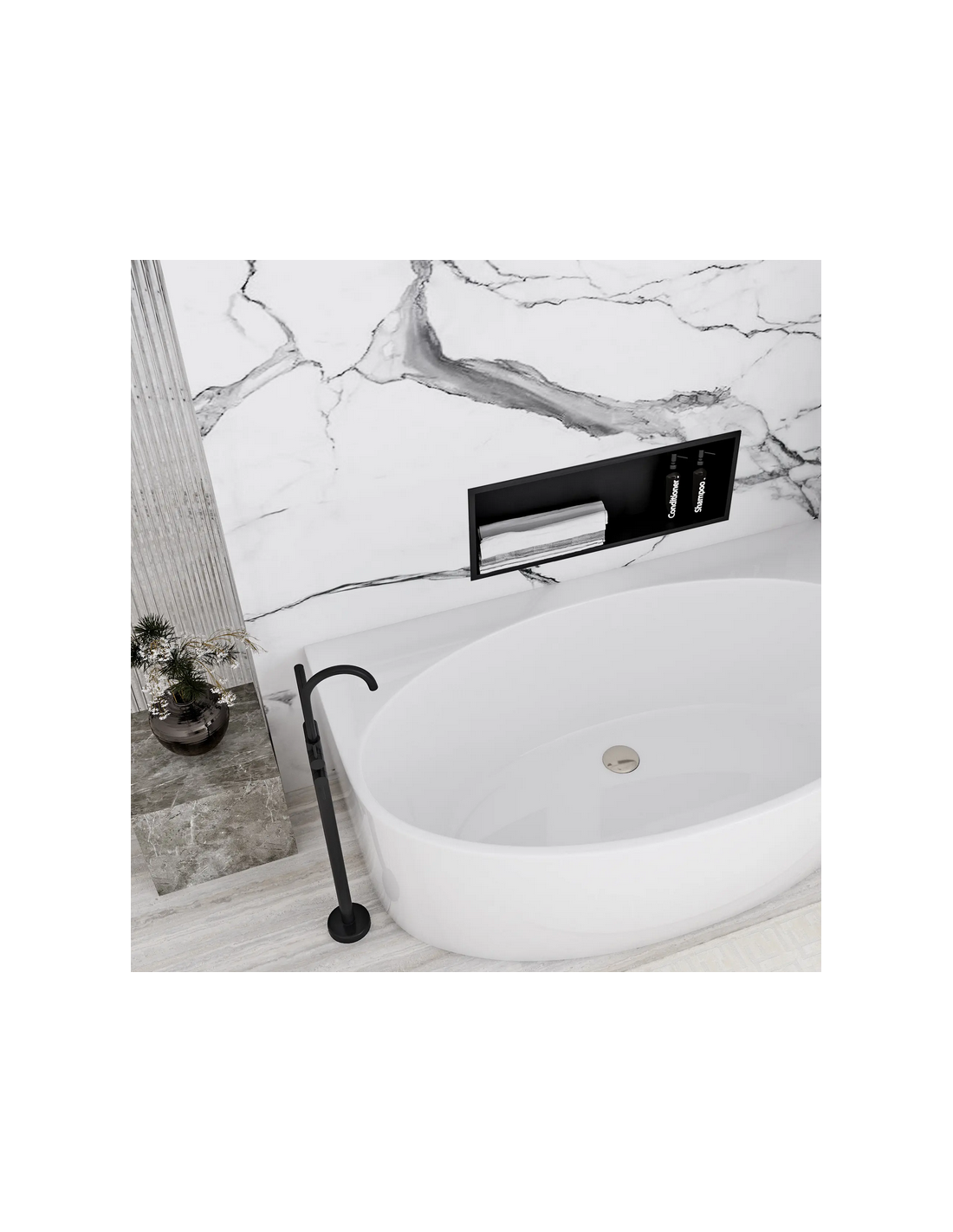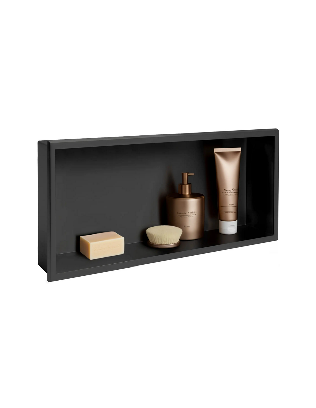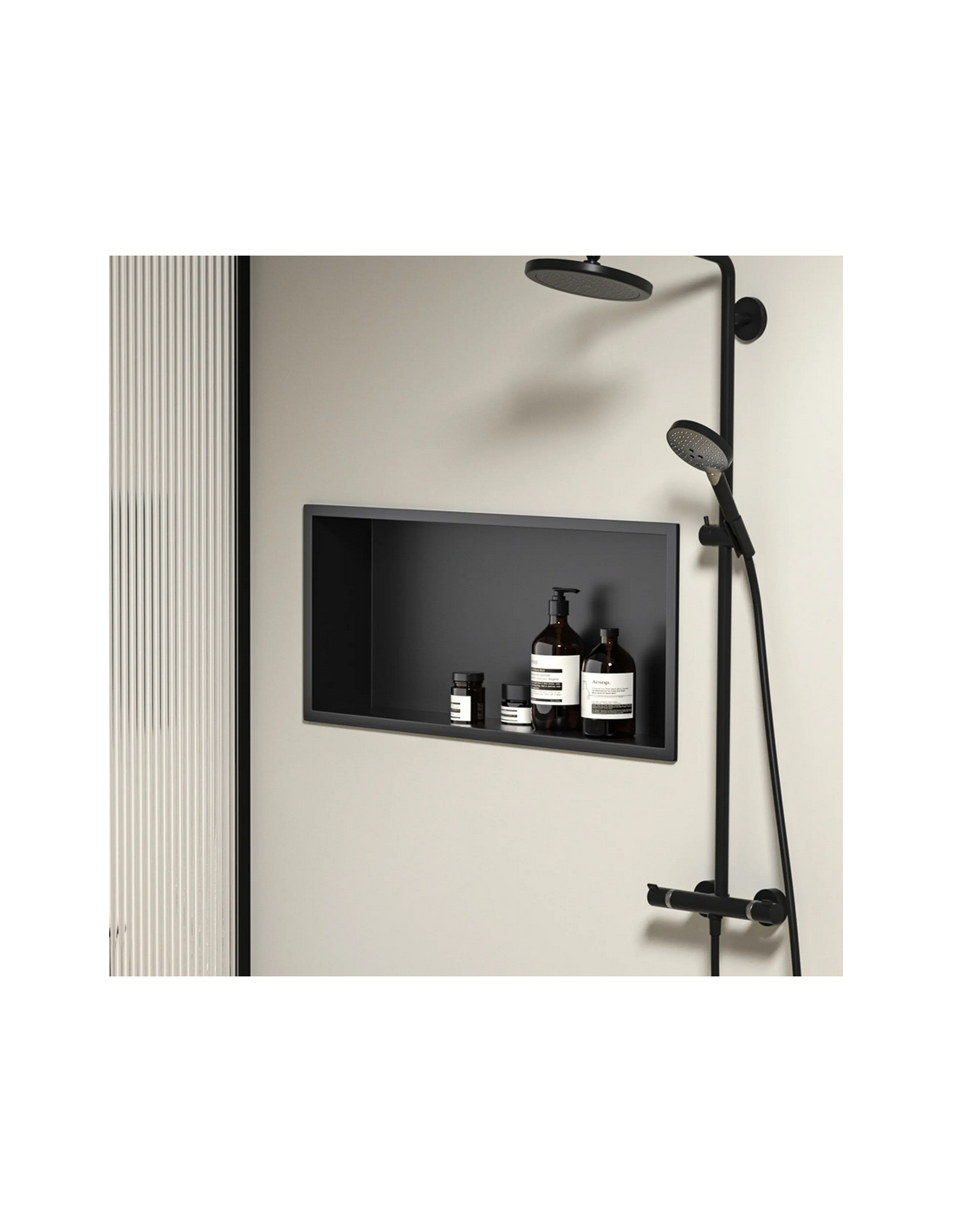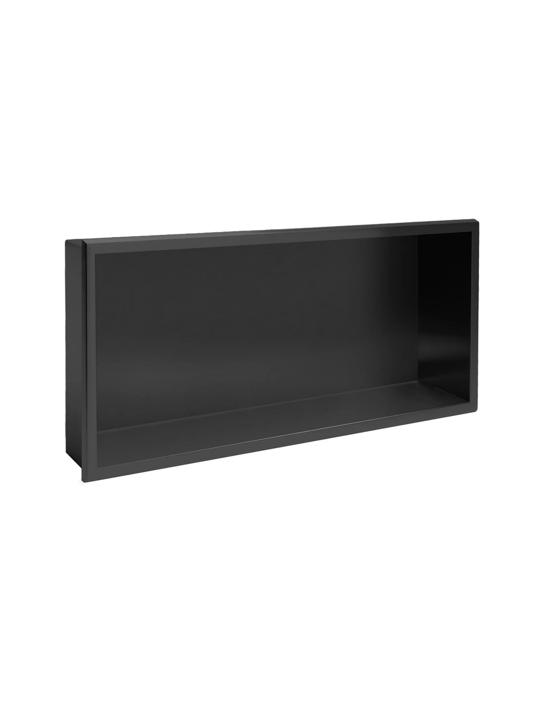 Hylde til indbygning i vægge på badeværelset, eksempelvis i brusekabine/bruseniche. Hylden er fremstillet i rustfri mat sortlakeret stål og måler 64 x 34 cm i bredde og højde og 10 cm i dybden. Selve den indre hylde måler 60 x 30 cm i bredde og højde og med dybde på 9,5 cm.