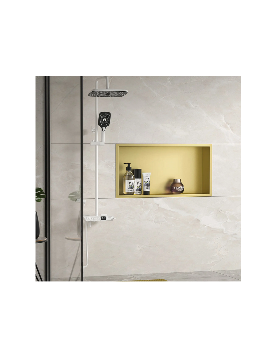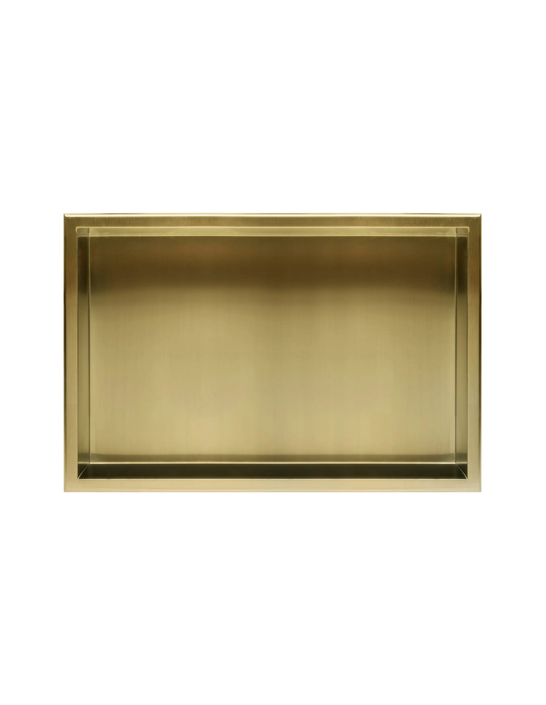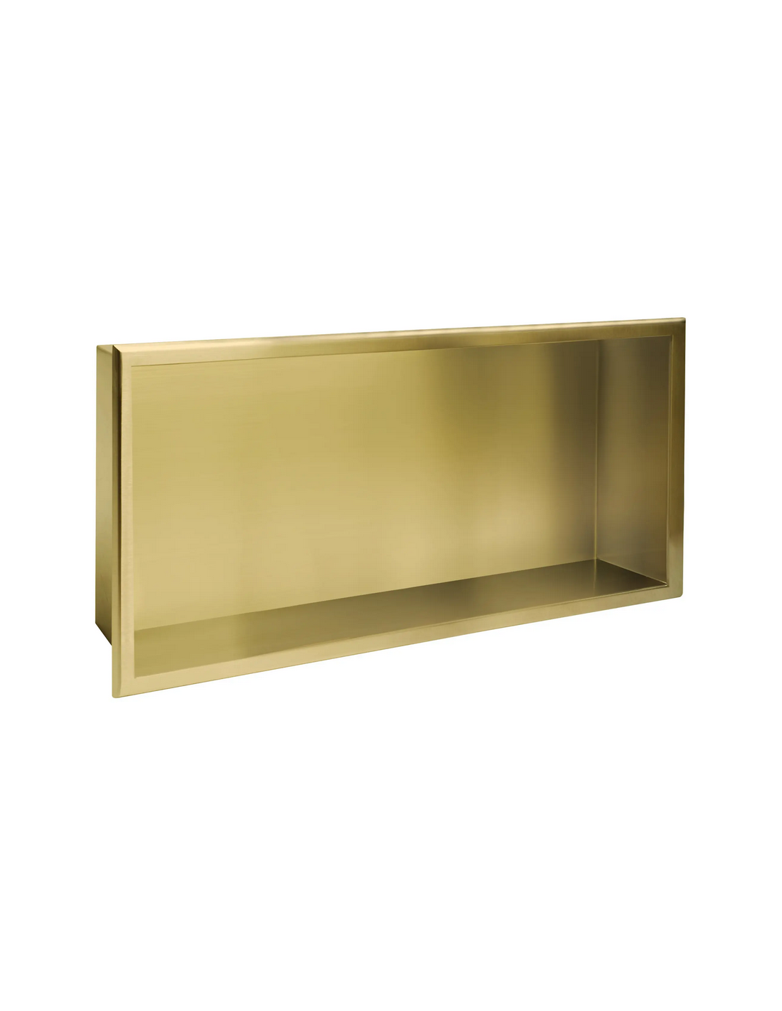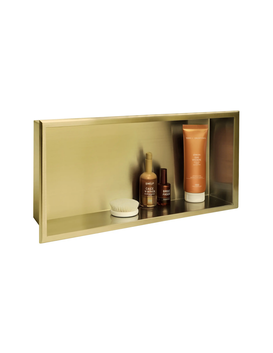 Hylde til indbygning i vægge på badeværelset, eksempelvis i brusekabine/bruseniche. Hylden er fremstillet i rustfri børstet guldfarvet stål og måler 64 x 34 cm i bredde og højde og 10 cm i dybden. Selve den indre hylde måler 60 x 30 cm i bredde og højde og med dybde på 9,5 cm.