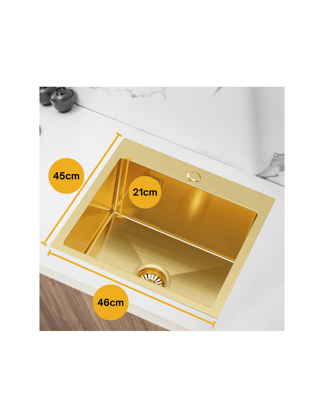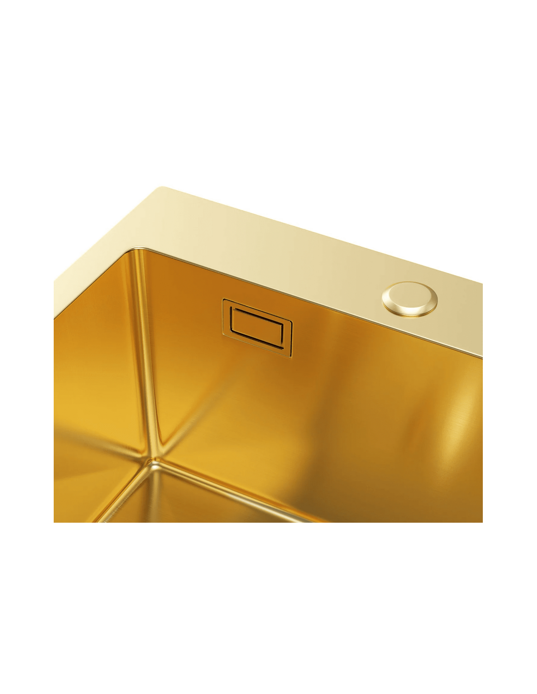 Køkkenvask udført i et moderne design af satineret guldfarvet PVD coated rustfri stål, der sikrer lang holdbarhed og modstandsdygtig overfor ridser og skrammer. Vasken måler 21 cm i højden og 46 x 45 cm i bredde og dybde. Leveres med afløb og hanehul Ø3,5 cm.
