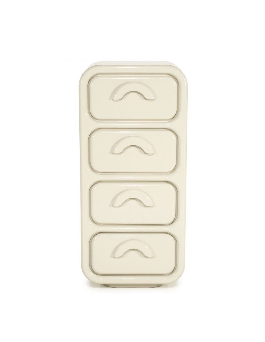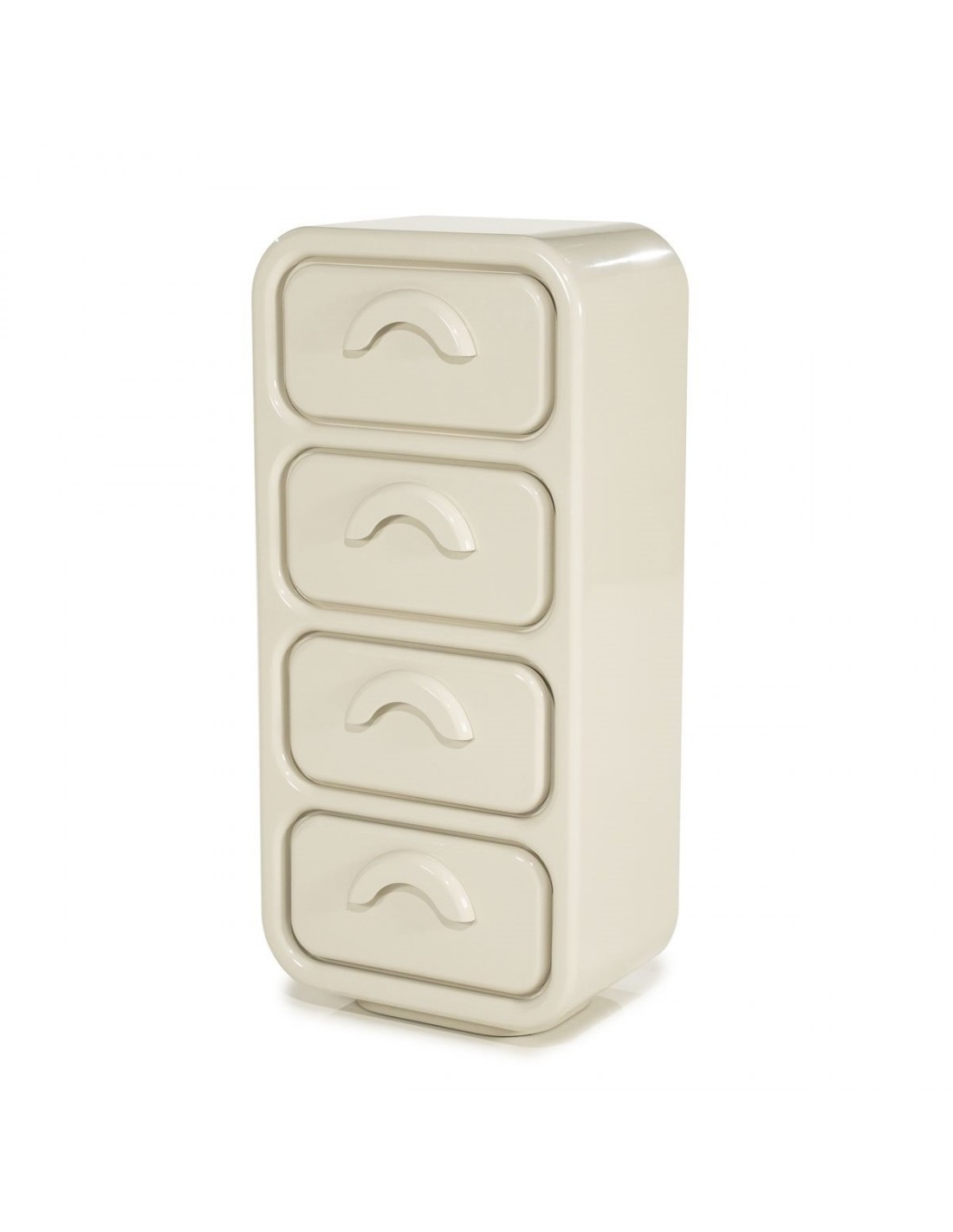 GUBBY Kommode med 4 skuffer, udført i et retropræget design af beige højglans lakeret MDF. Kommoden måler 108 cm i højden og 50,5 x 32,5 cm i bredde og dybde.