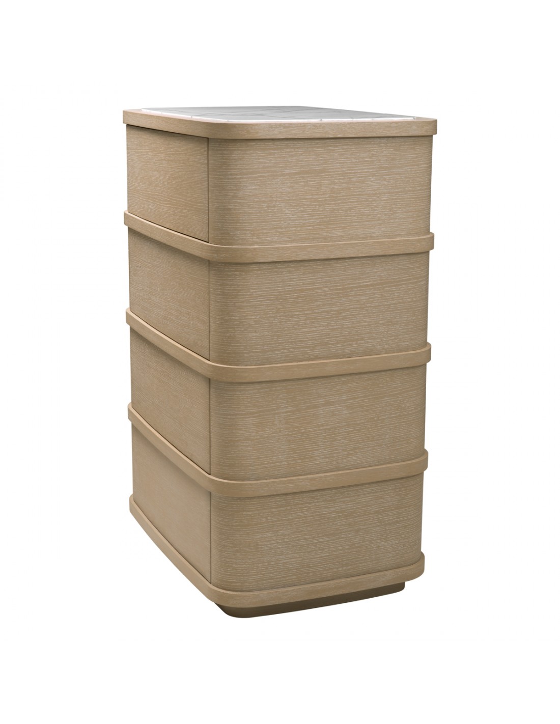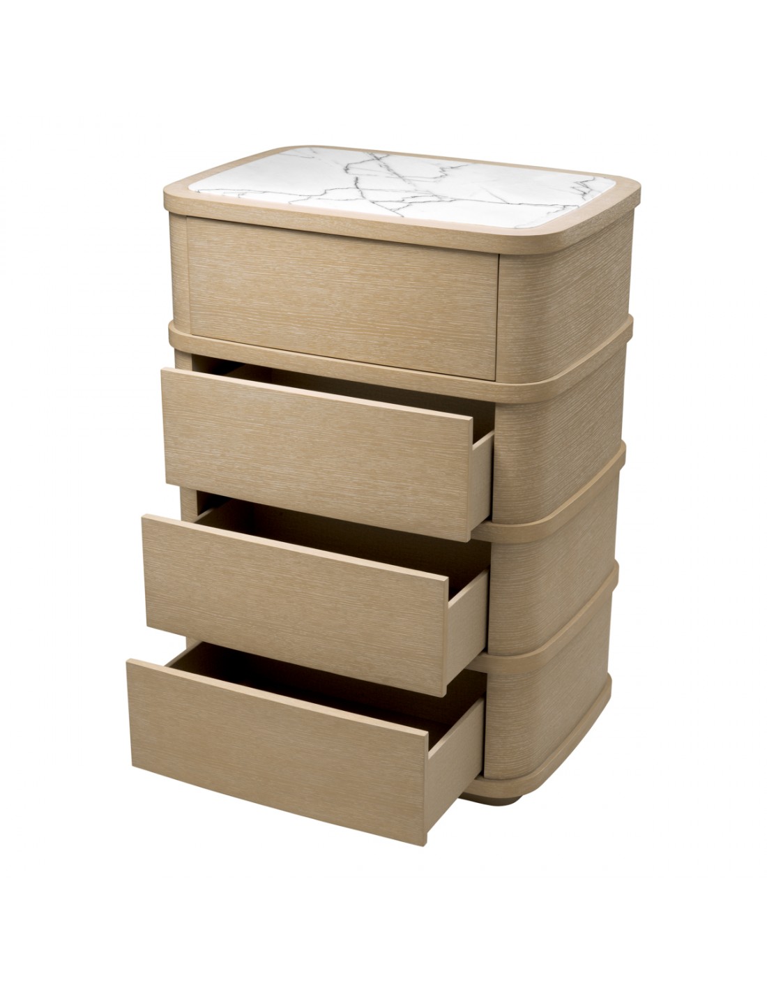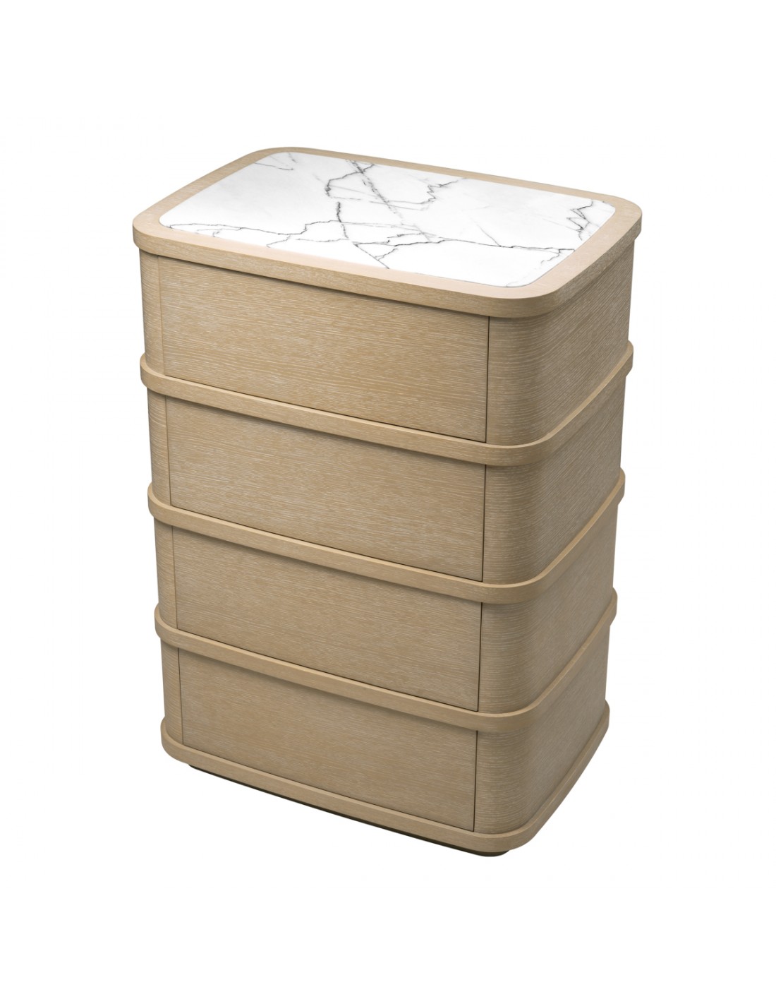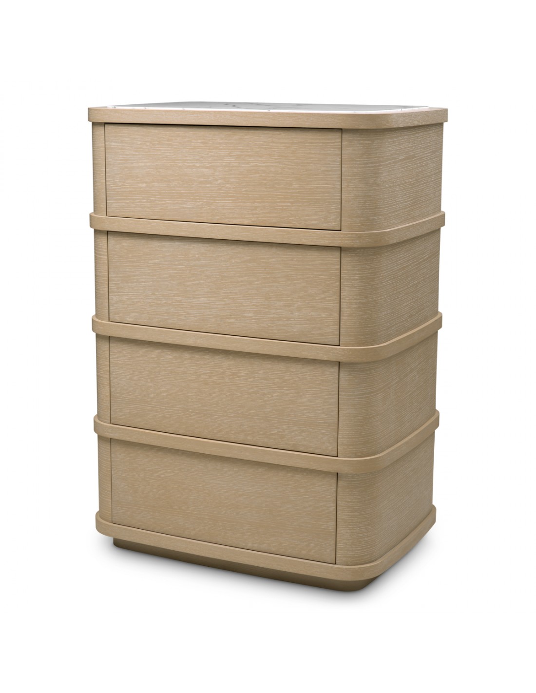 Eichholtz Cabana kommode udført i et luksuriøst og moderne design, fremstillet i vasket egetræsfinér og hvid marmor, med 4 skuffer med push-to-open funktion. Kommoden måler 120 cm i højden og 86 x 60,5 cm i bredde og dybde.