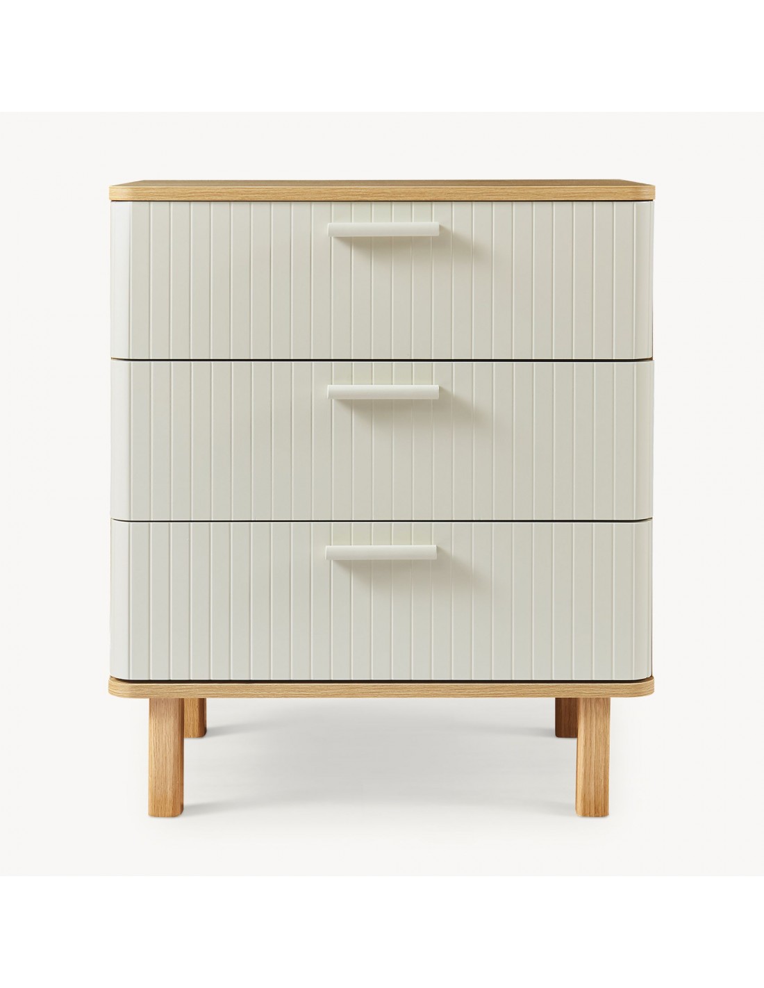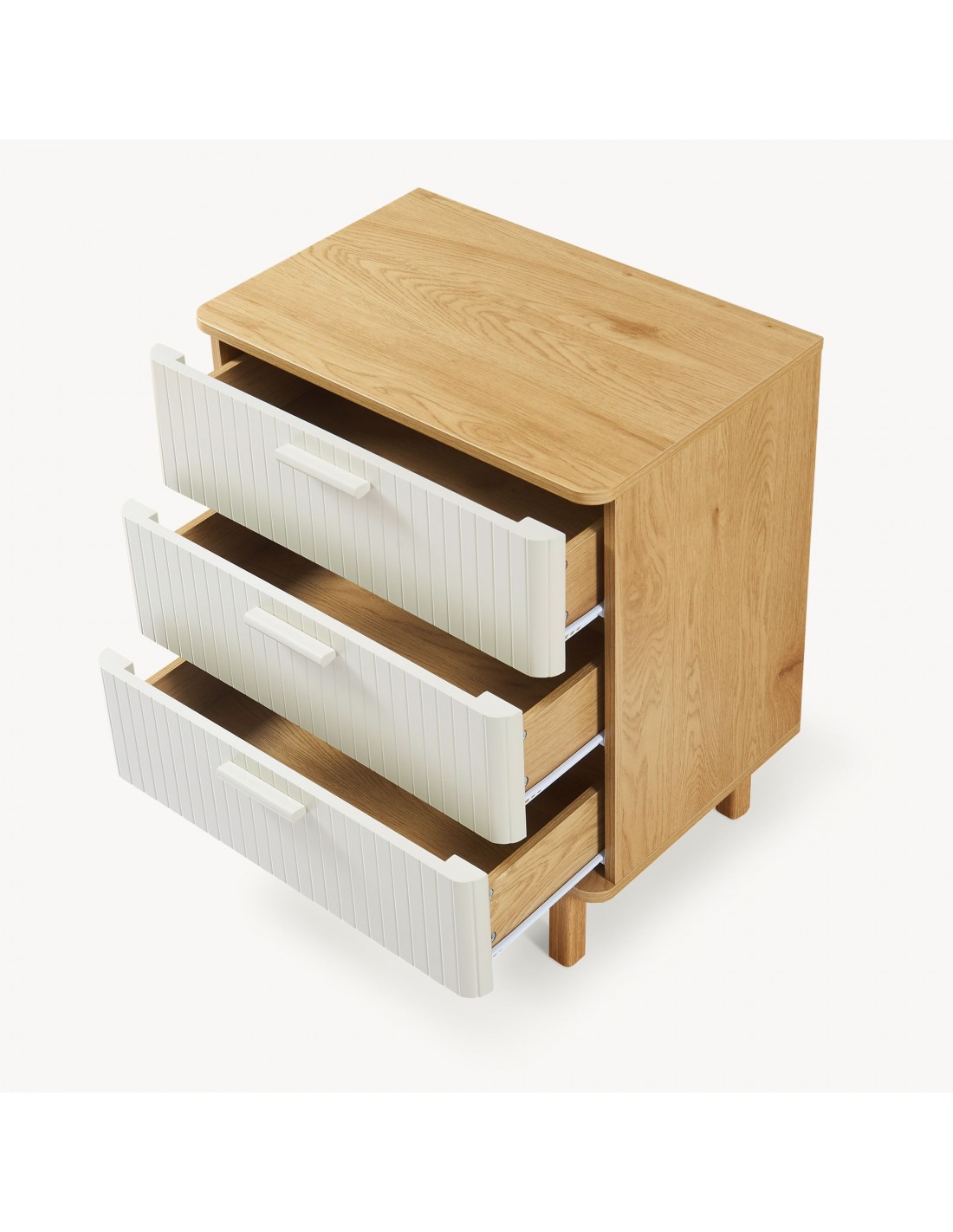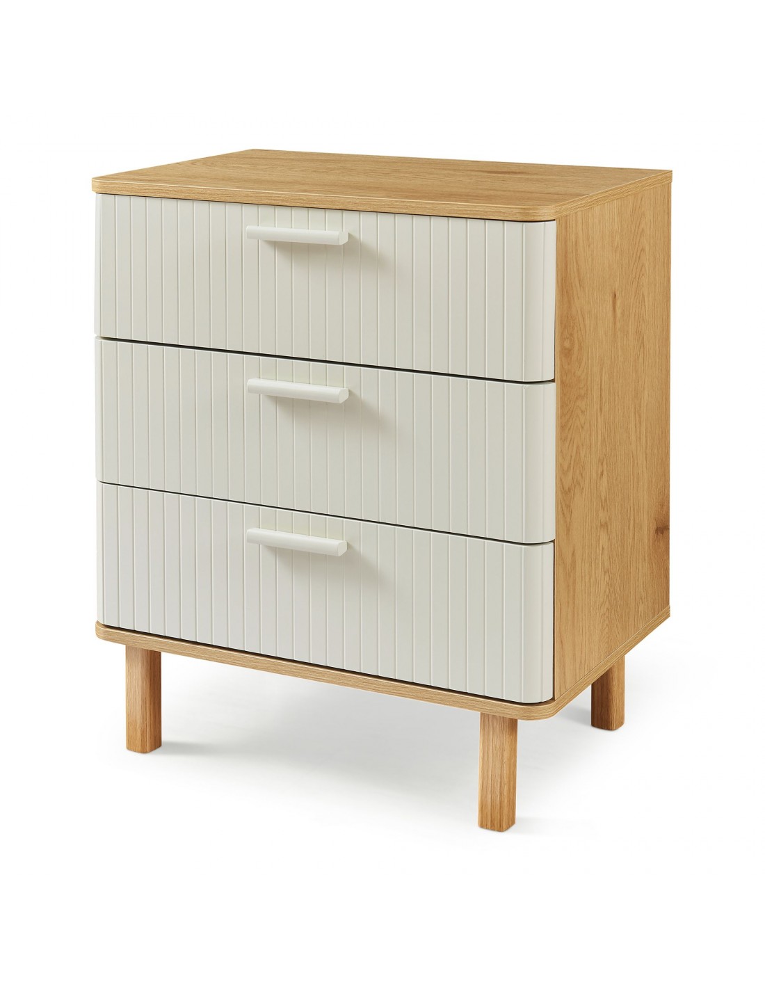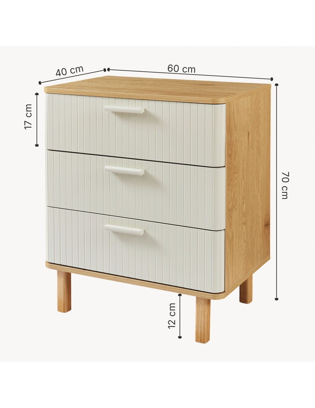 Kommode med 3 skuffer, udført i et moderne og Skandinavisk design af egetræsfarvet fyrretræ og MDF og sandfarvet MDF. Kommoden måler 70 cm i højden og 80 x 40 cm i bredde og dybde.