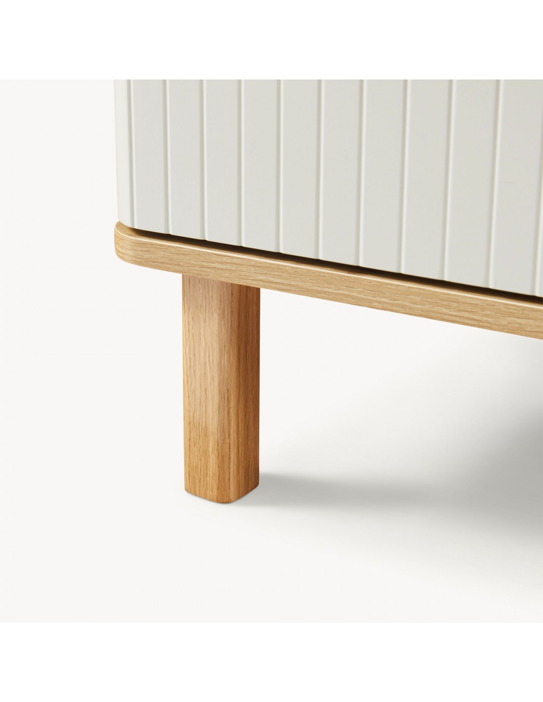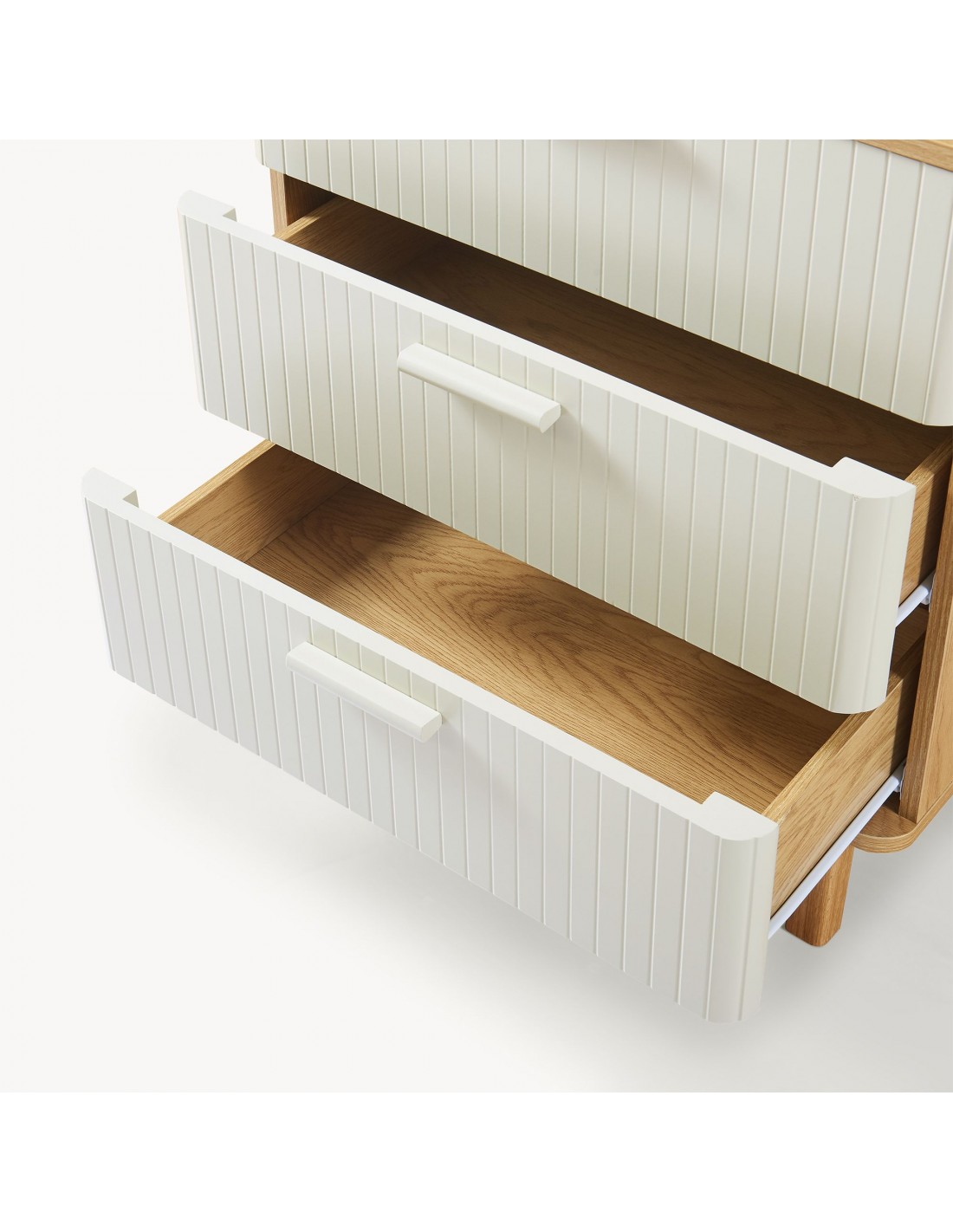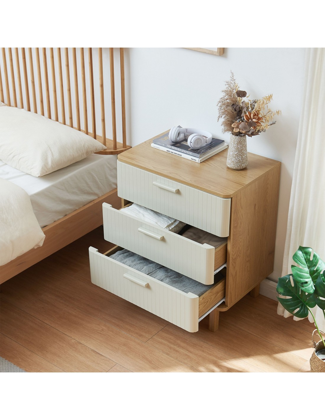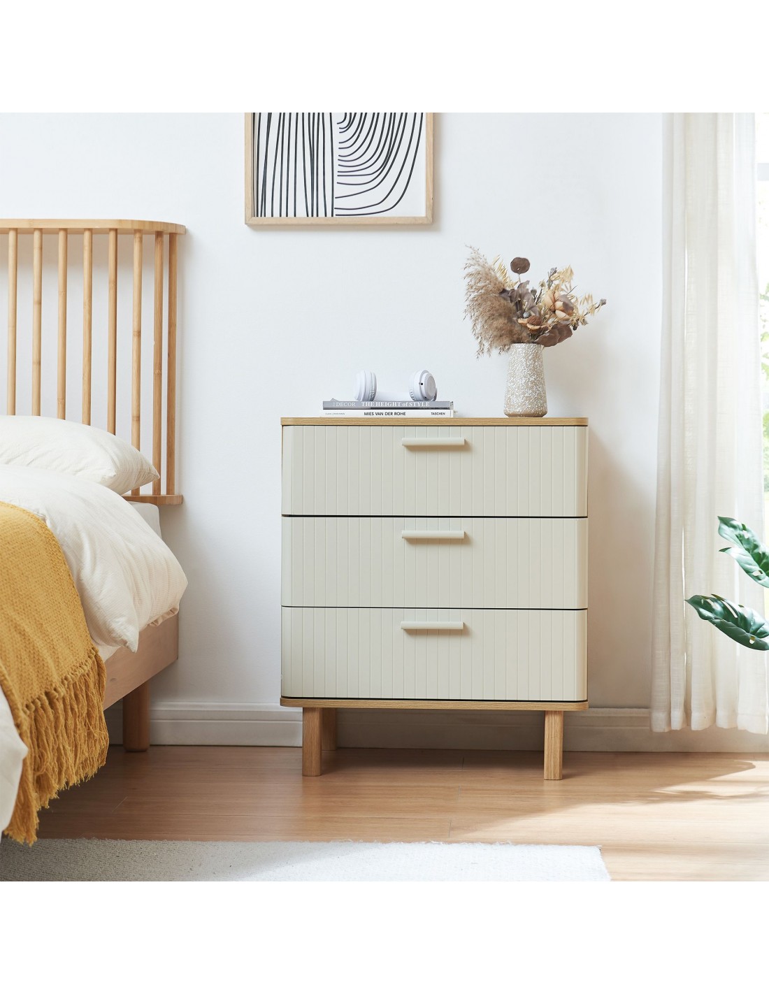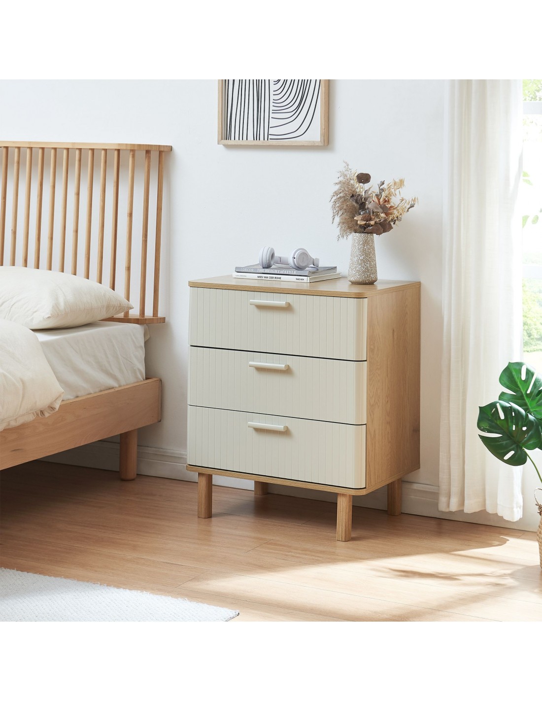 Kommode med 3 skuffer, udført i et moderne og Skandinavisk design af egetræsfarvet fyrretræ og MDF og sandfarvet MDF. Kommoden måler 70 cm i højden og 80 x 40 cm i bredde og dybde.