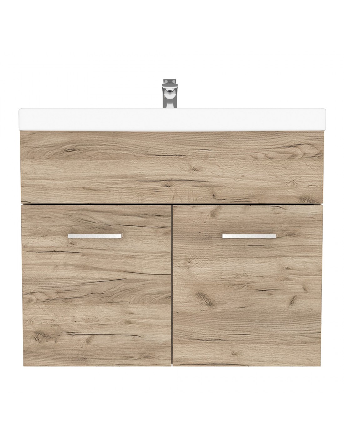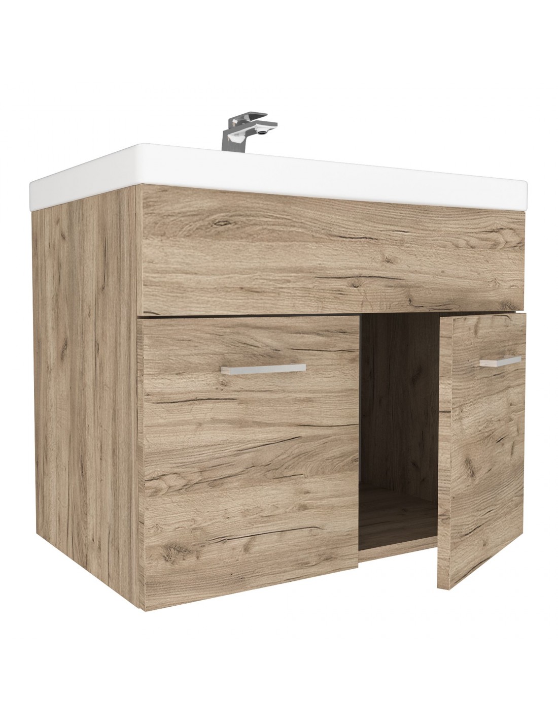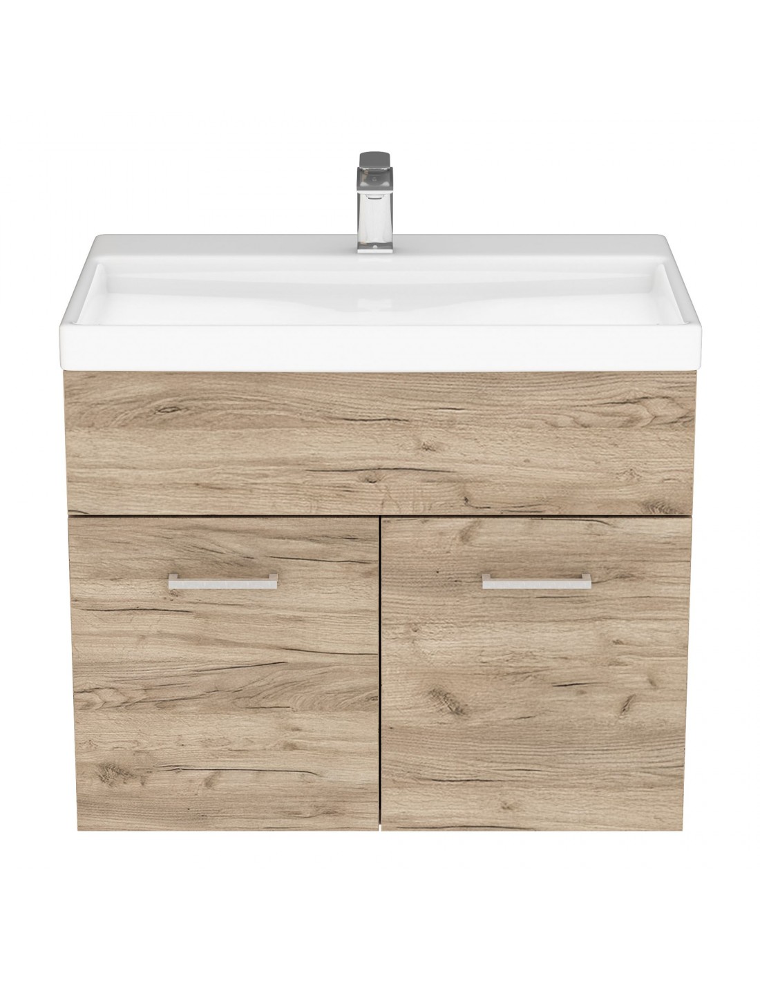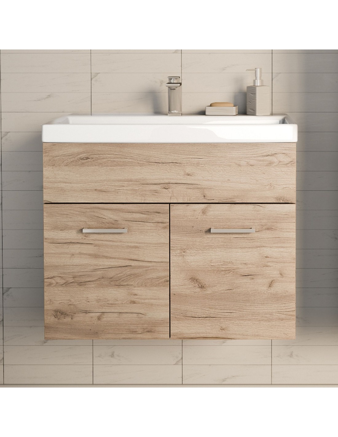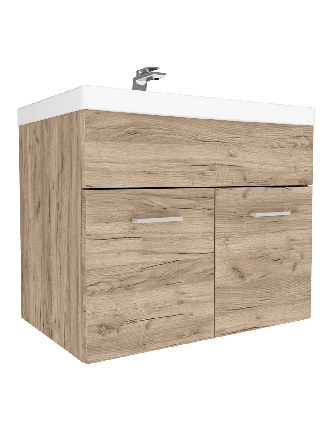 HANA Komplet badmiljø i et design af egetræsfarvet møbelplade med håndvask i hvid keramik. Sættet måler 49,5 cm i højden og 61 x 40 cm i bredde og dybde og indeholder 2 skabslåger med 1 opbevaringsrum bag. Håndvasken er med overløb og hanehul. Afløbshul i håndvasken måler 4,5 cm og er EU standardmål og passer derfor sammen med flest bundventiler på markedet. Hanehullet i håndvasken måler Ø3,5 cm.